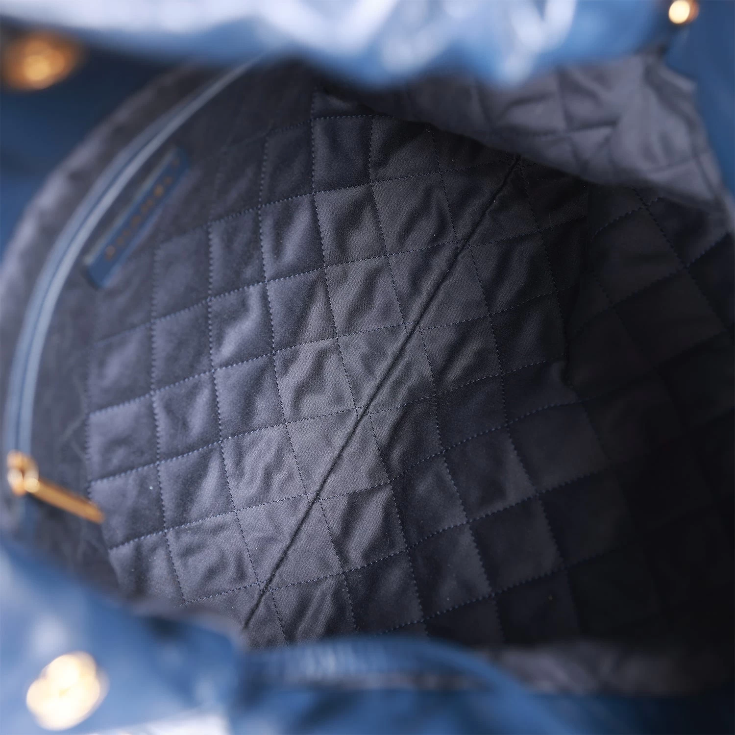 This large 22 hobo bag is of navy lambskin with antique gold tone hardware and has the signature diamond quilting, CHANEL on the front in antique gold metal, removable pouch, and long antique gold tone and navy leather chain.