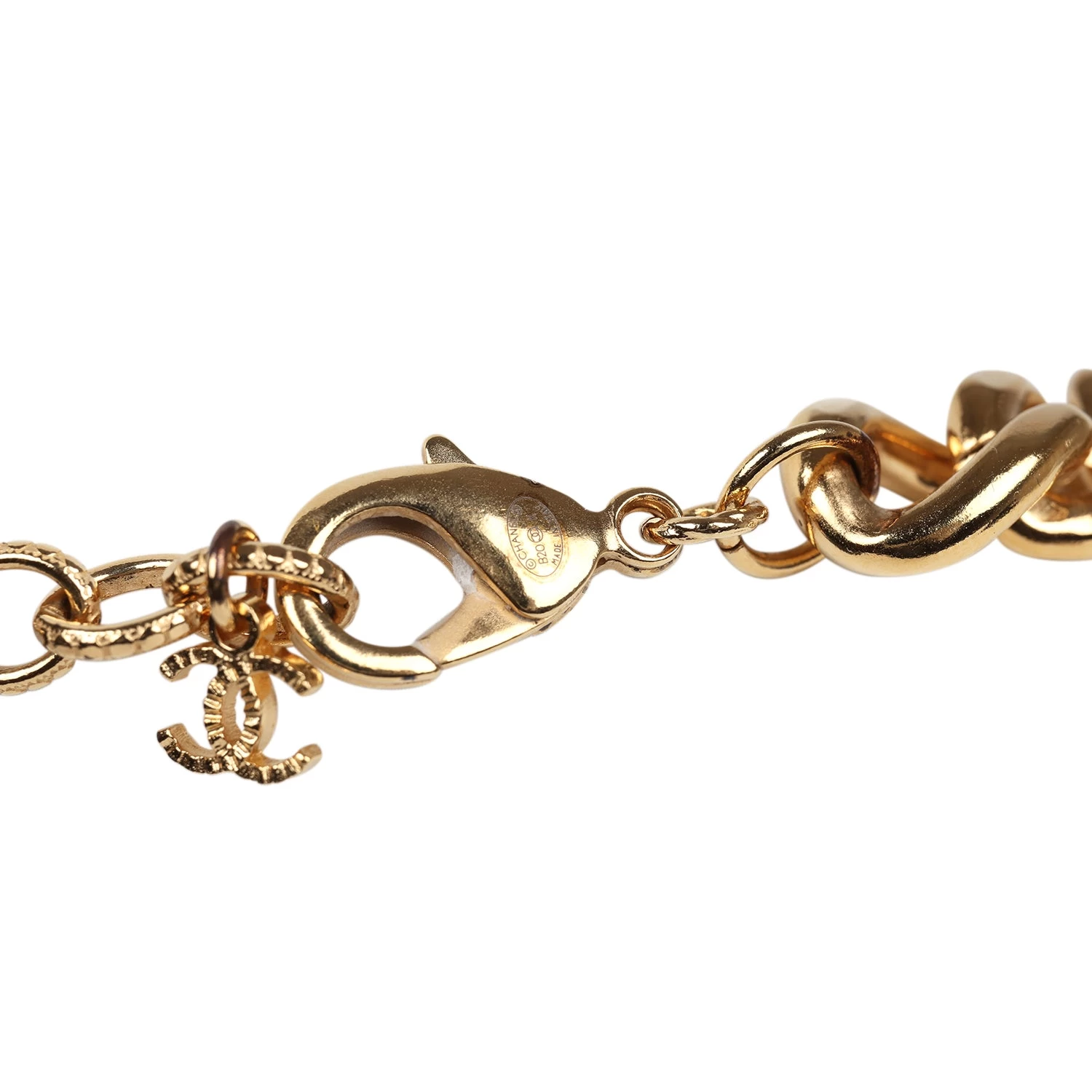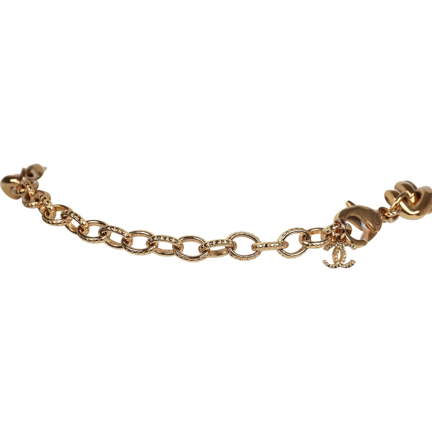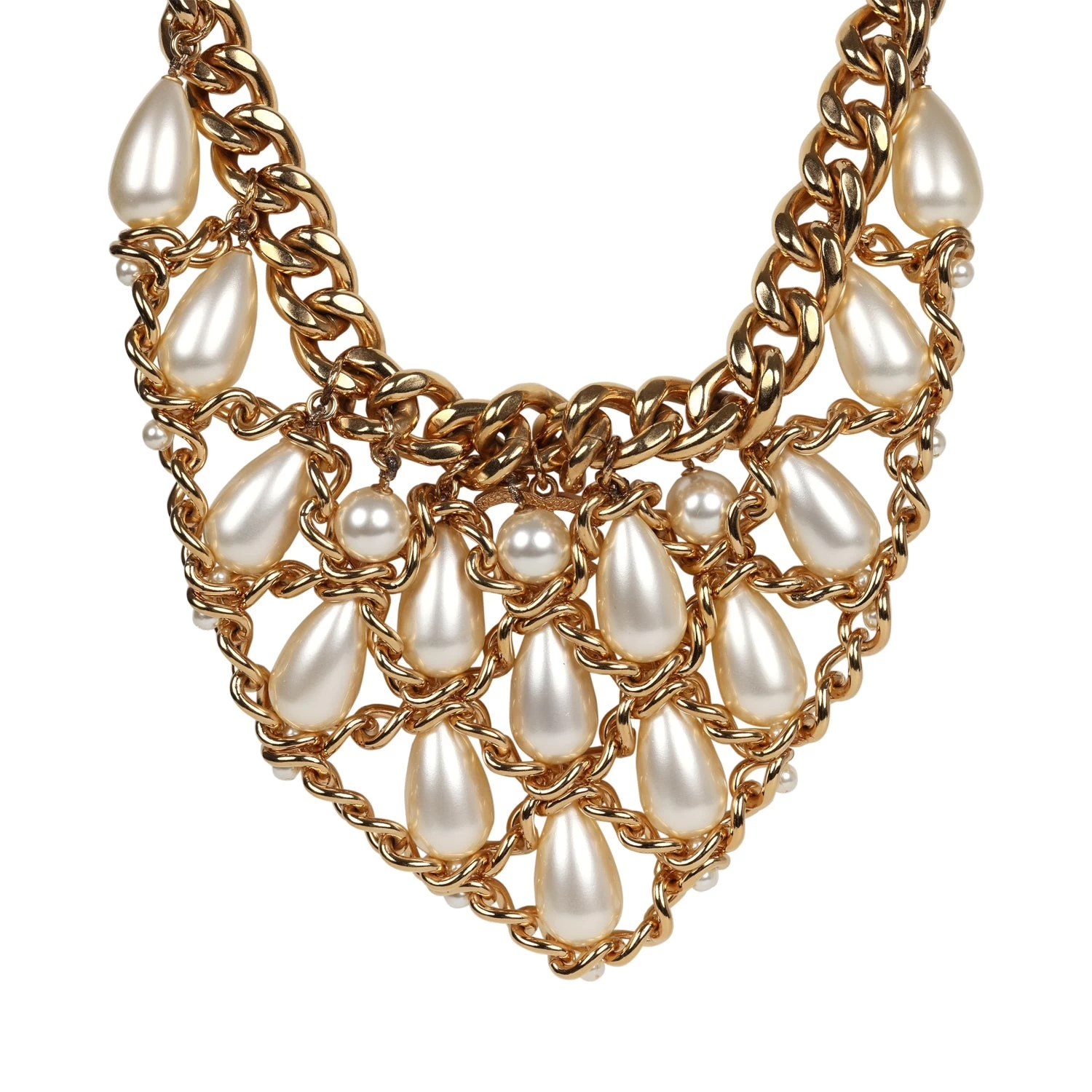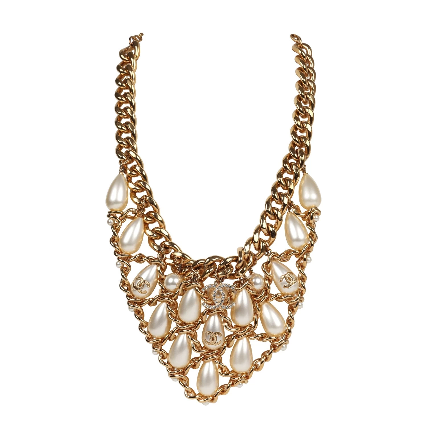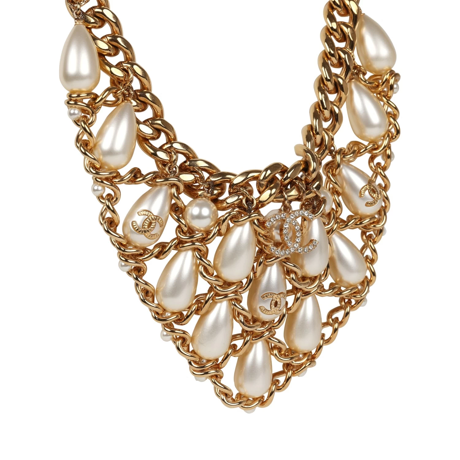 This Chanel layered pearl cluster necklace in gold hardware, features a thick gold chainlink necklace with tear drop pearls layered in between a woven gold chain design with a lobster clasp closure.