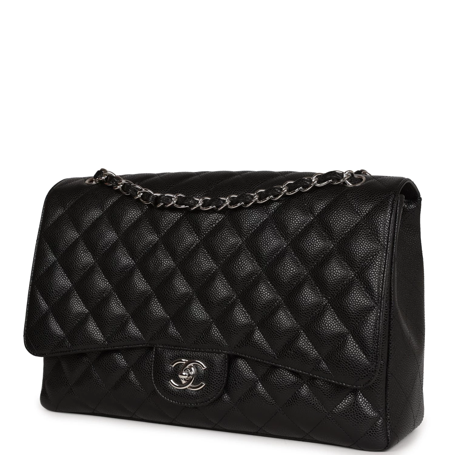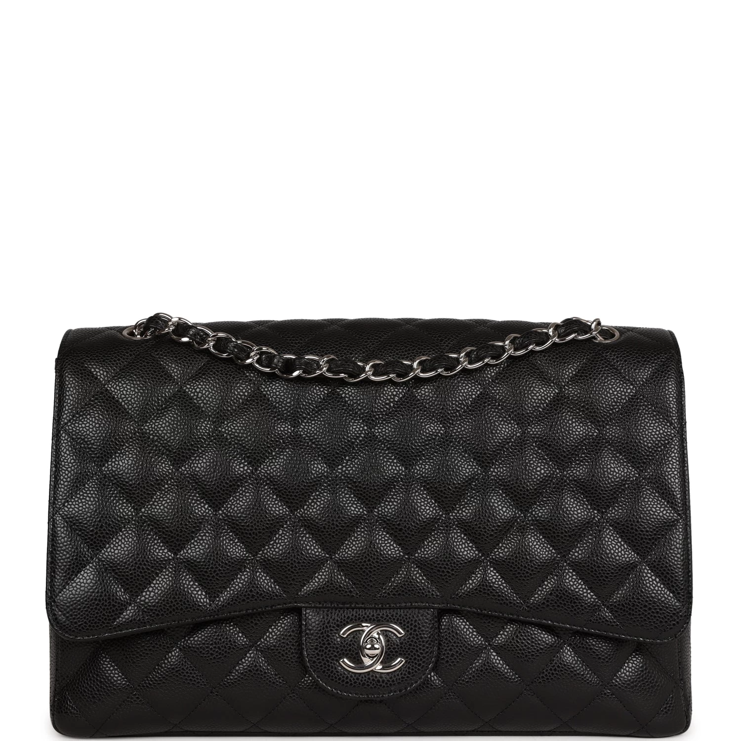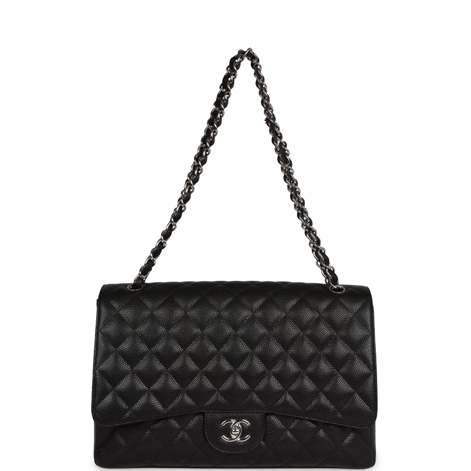 This Maxi Classic Flap bag is in black quilted caviar leather with silver hardware and features a front flap with signature CC turnlock closure, half moon back pocket, and adjustable interwoven silver tone chain link and black leather shoulder strap.