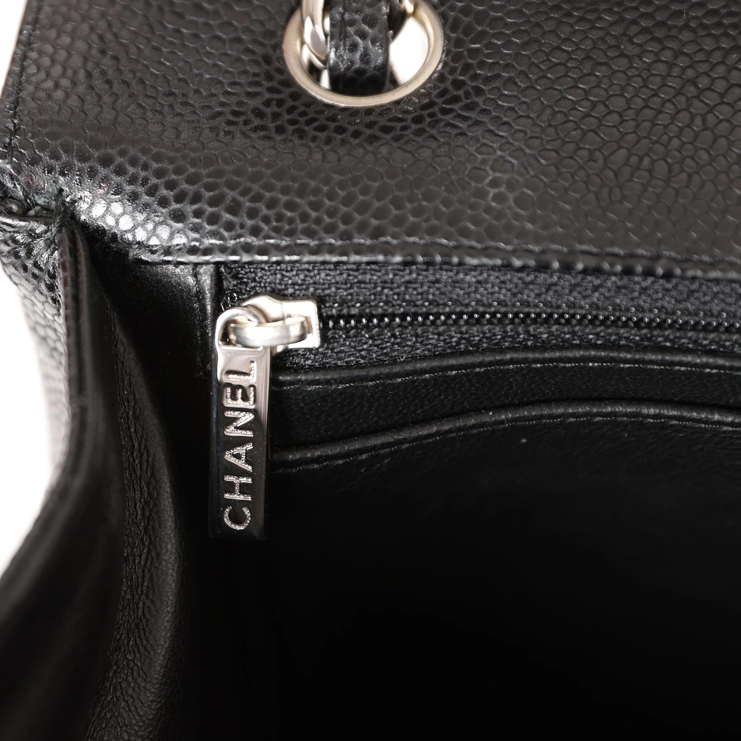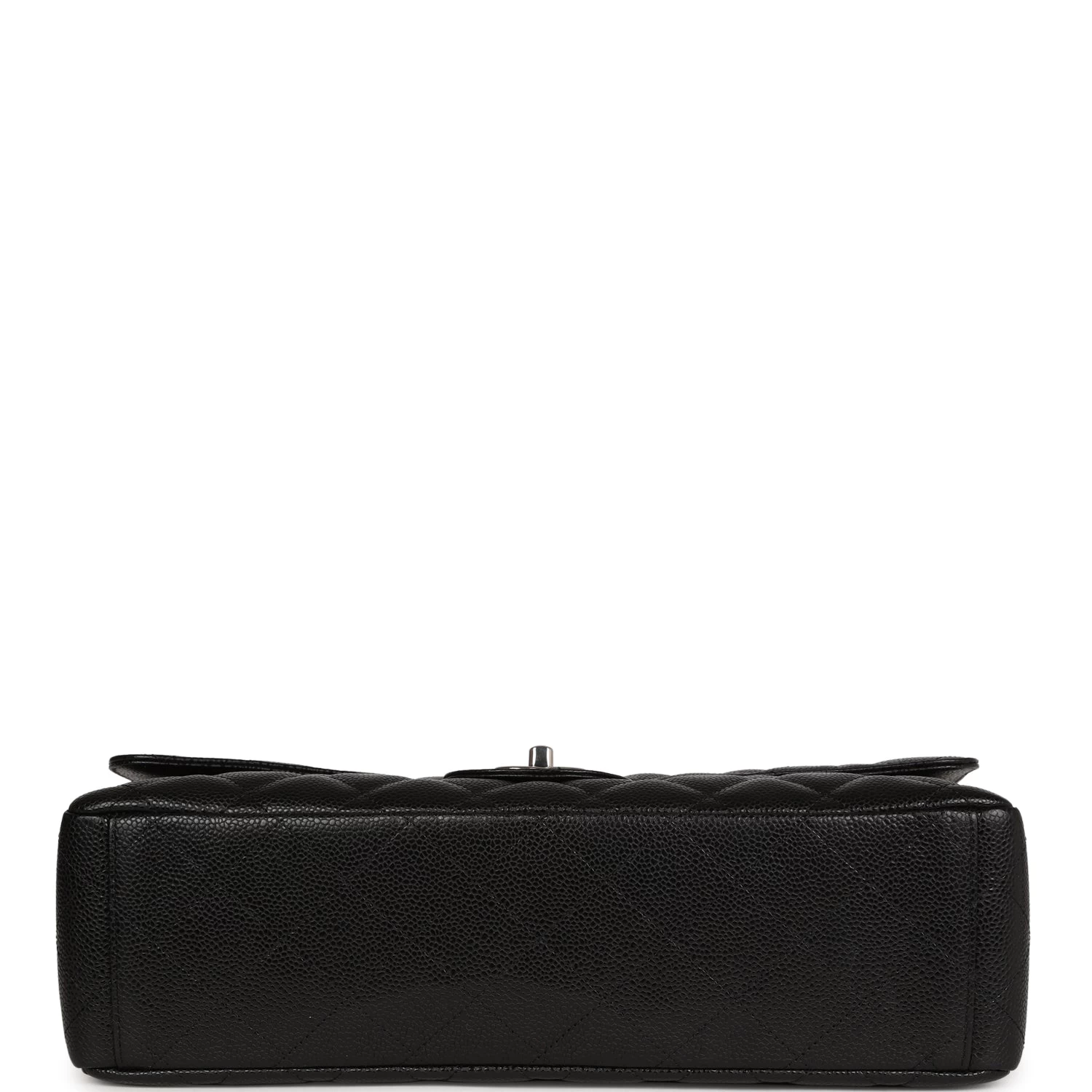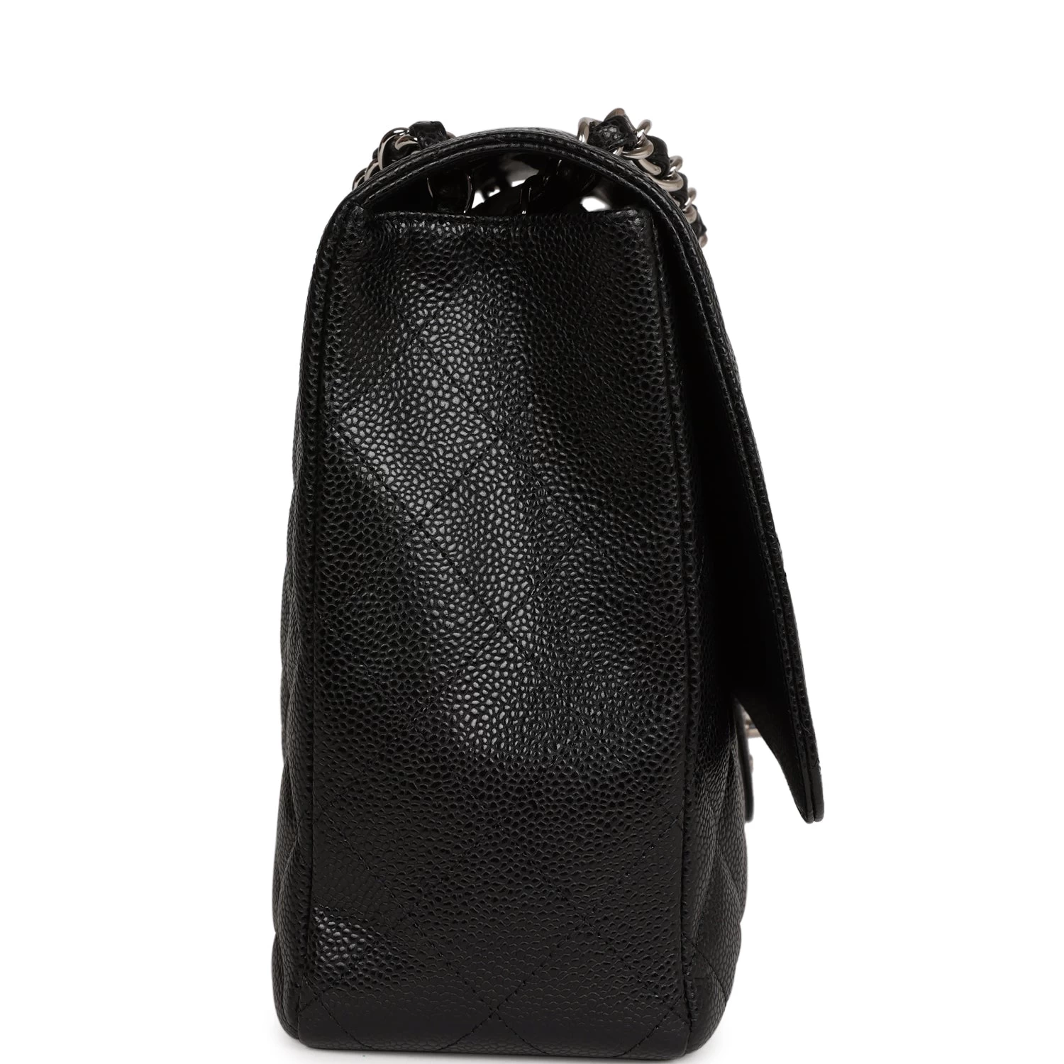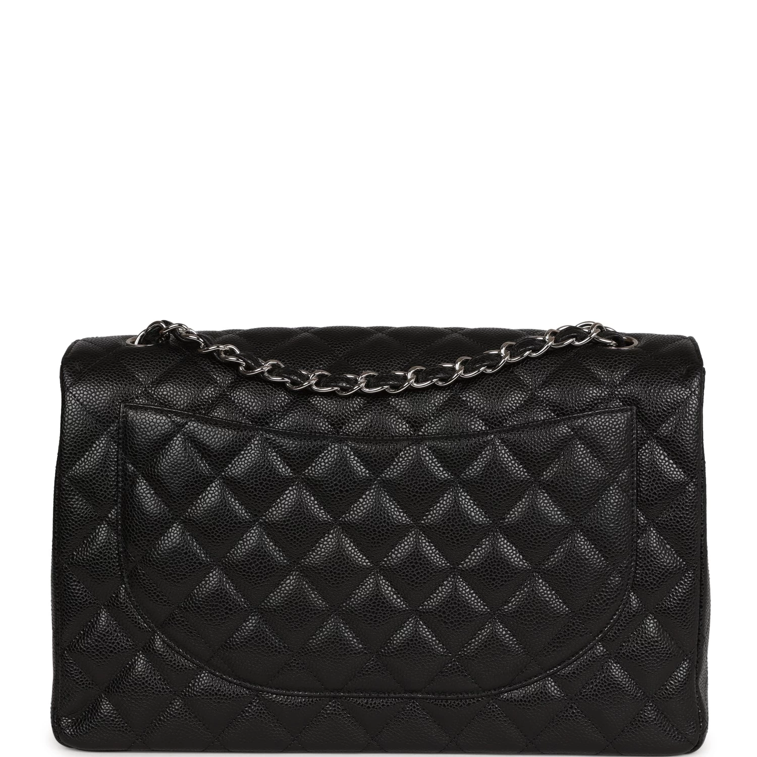 This Maxi Classic Flap bag is in black quilted caviar leather with silver hardware and features a front flap with signature CC turnlock closure, half moon back pocket, and adjustable interwoven silver tone chain link and black leather shoulder strap.