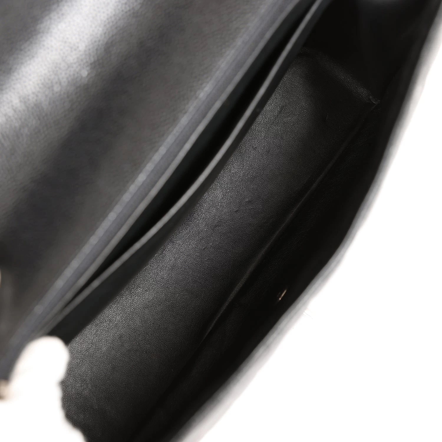 The interior is lined in black leather with one zip pocket on the rear wall with logo pull and one open pocket on the rear wall underneath zip pocket