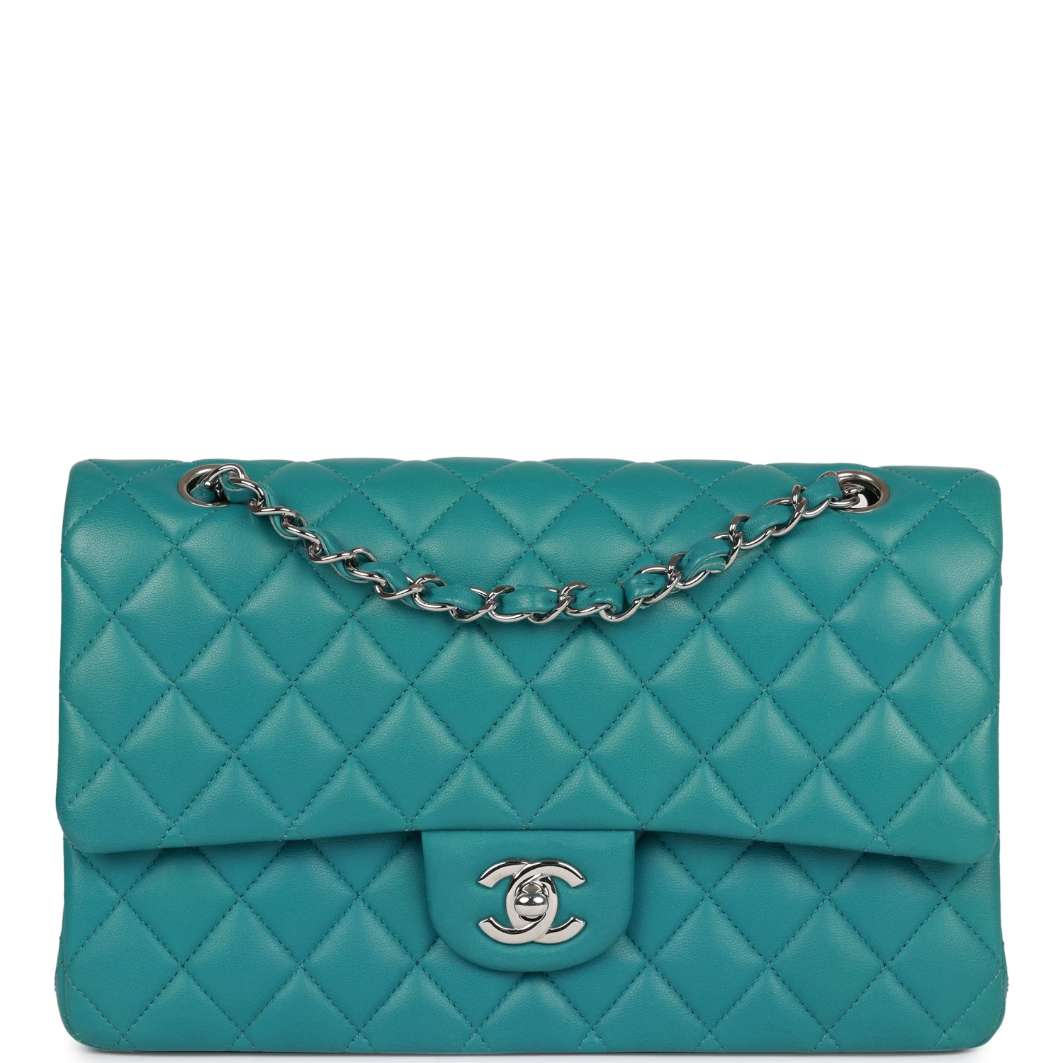 This Medium Classic Double Flap bag is in Blue lambskin leather with silver tone hardware and features a front flap with signature CC turnlock closure, half moon back pocket, and adjustable interwoven silver tone chain link and blue leather shoulder strap.