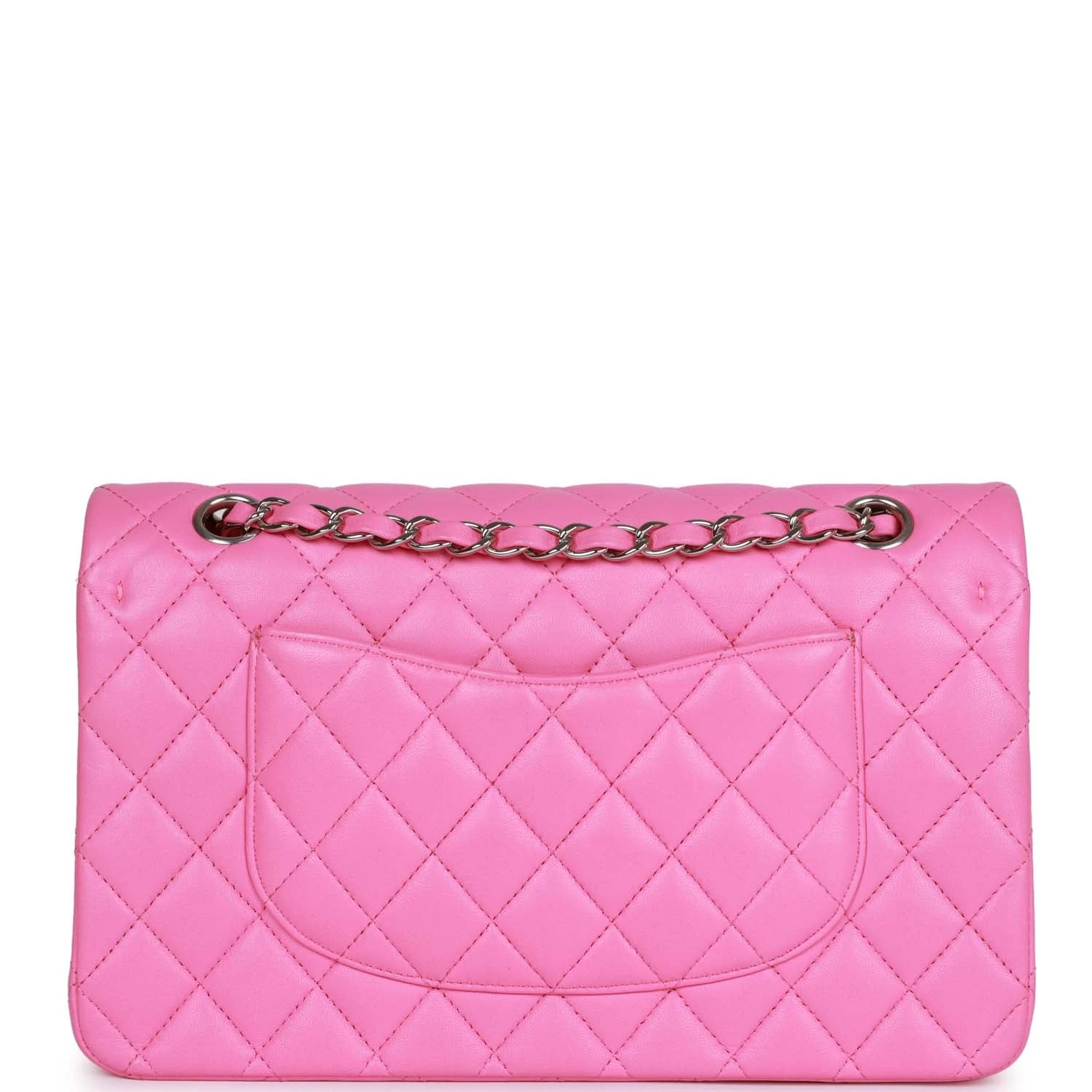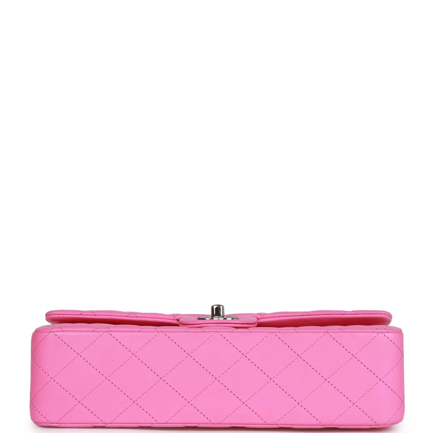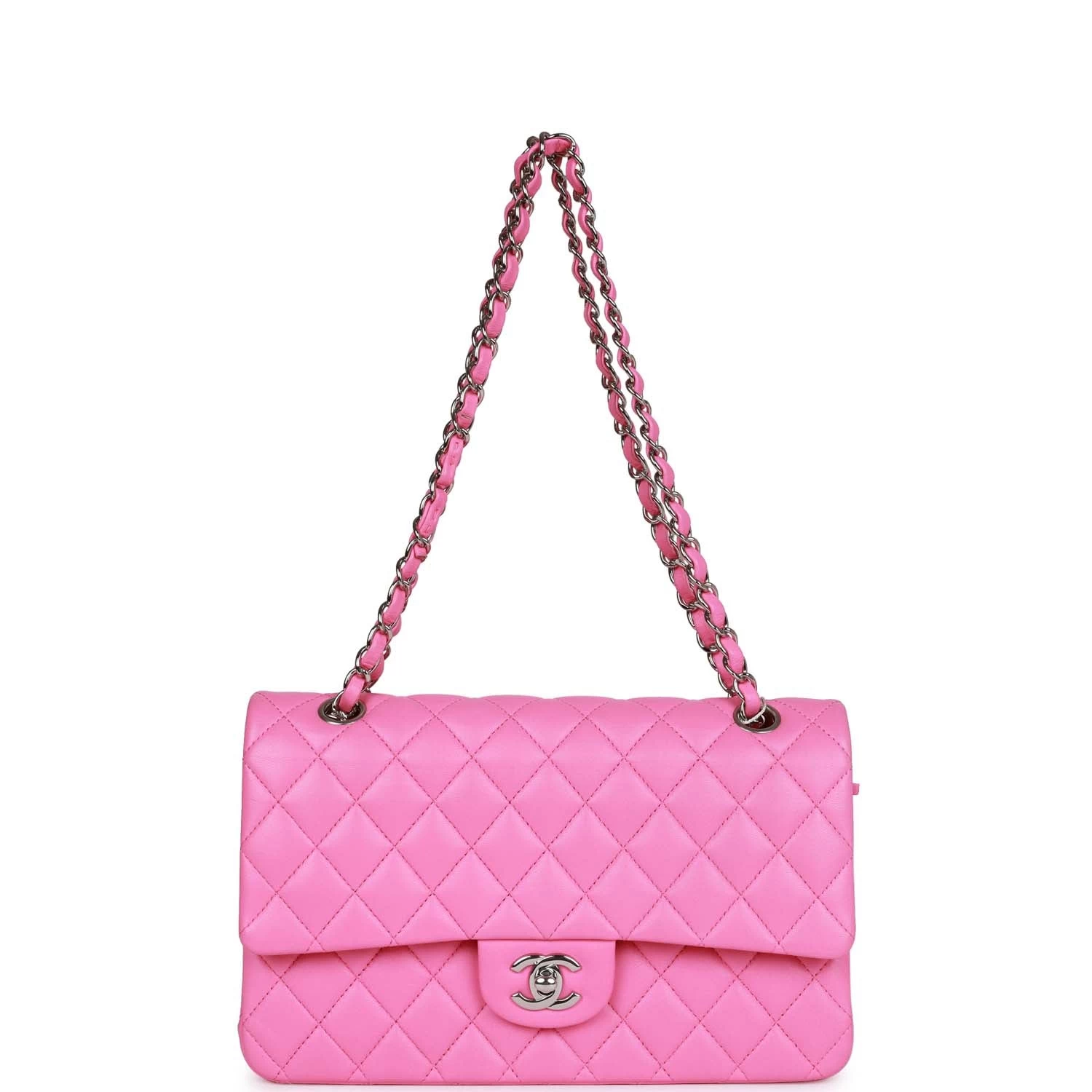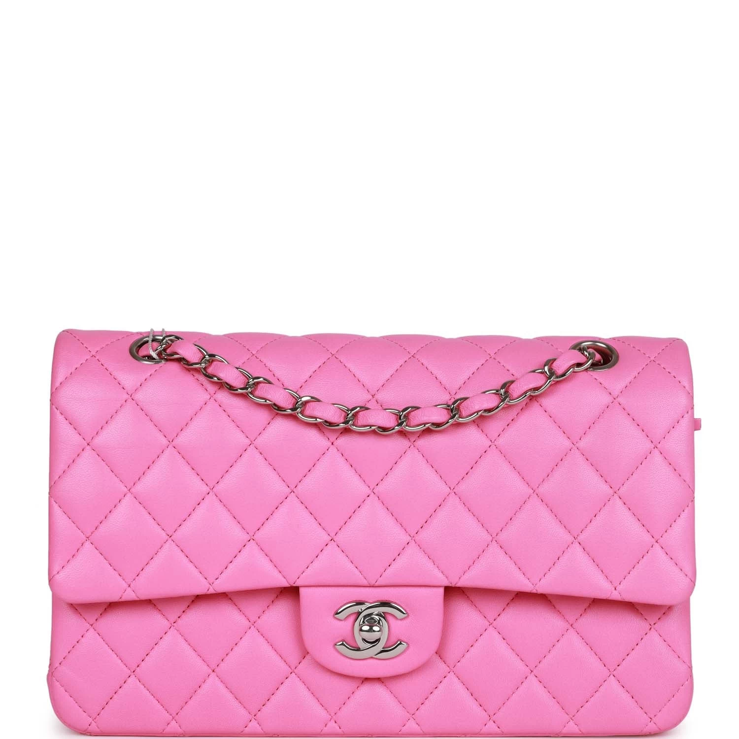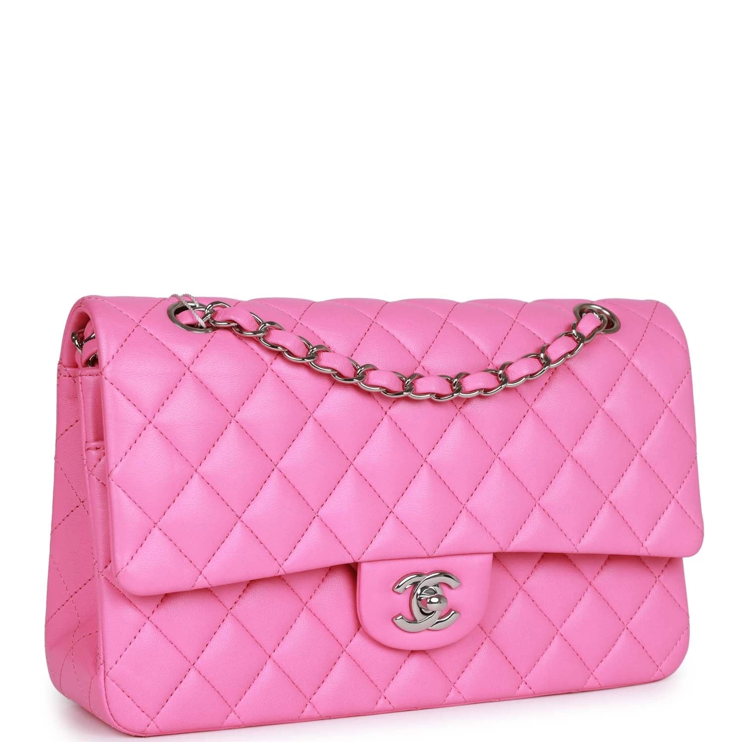 This Medium Classic Double Flap bag is in Neon Pink lambskin leather with silver tone hardware and features a front flap with signature CC turnlock closure, half moon back pocket, and adjustable interwoven silver tone chain link and pink leather shoulder strap.