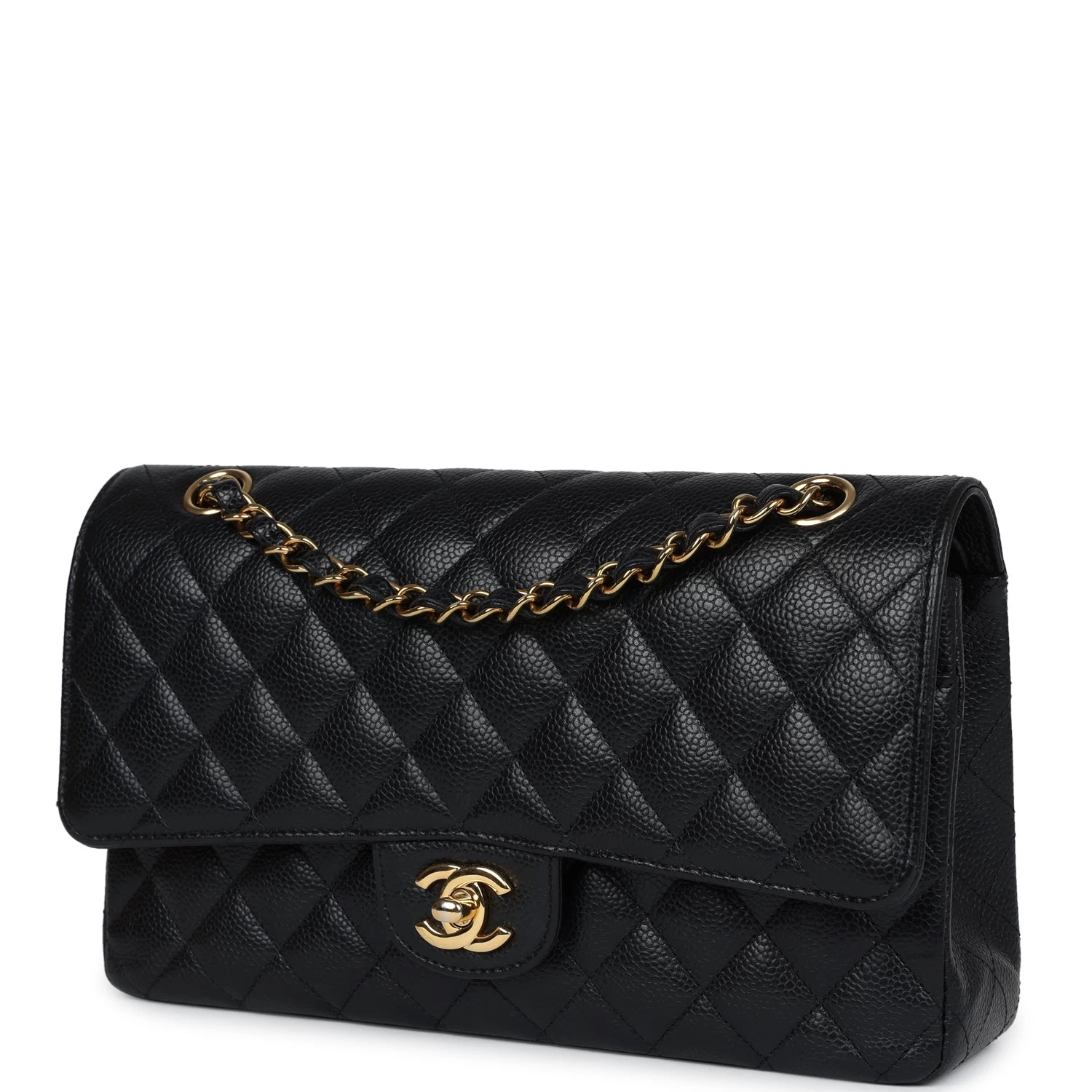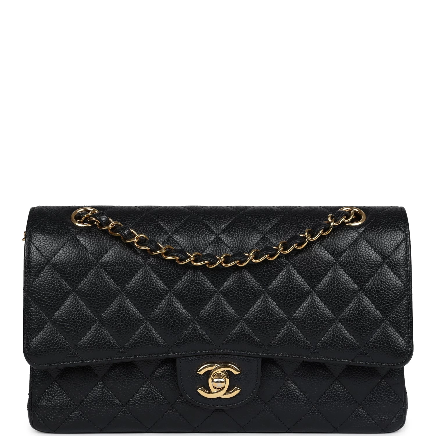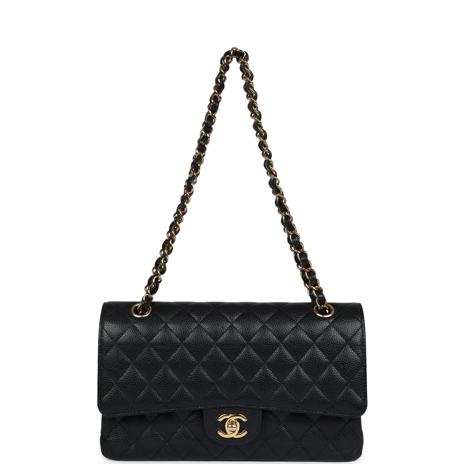 This medium classic double flap bag is in black caviar leather with gold tone hardware and features a front flap with signature CC turnlock closure, half moon back pocket, and adjustable interwoven gold tone chain link and black leather shoulder strap.