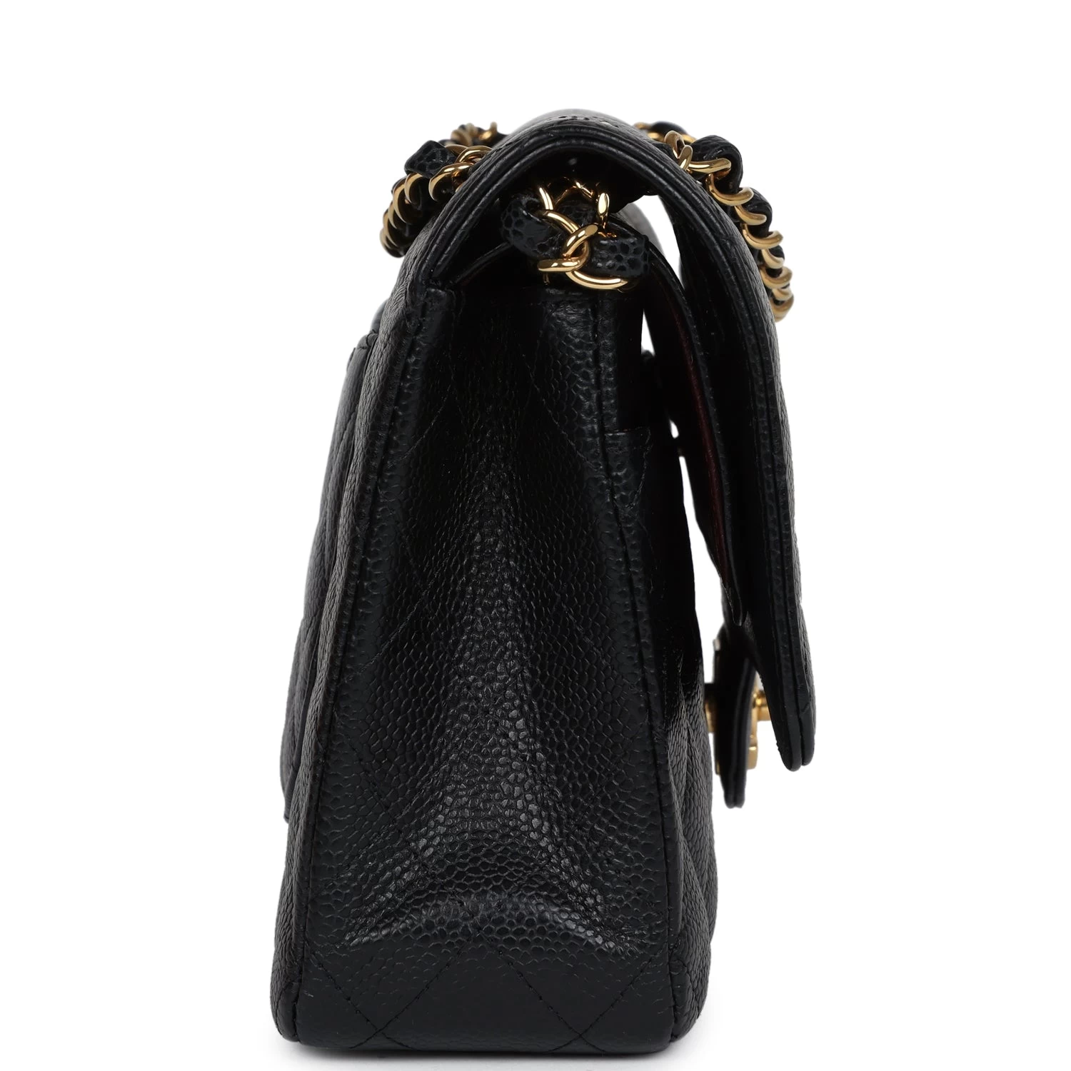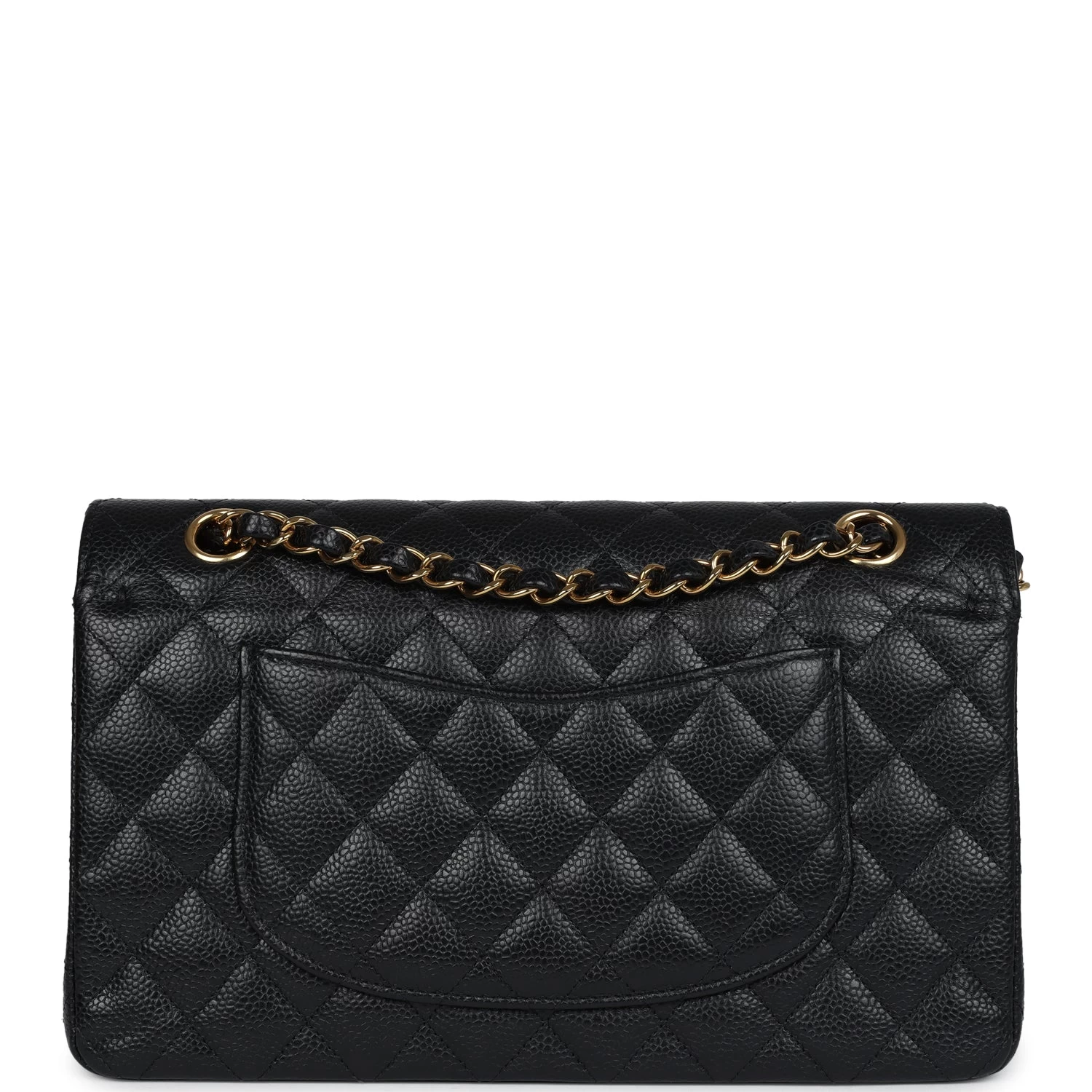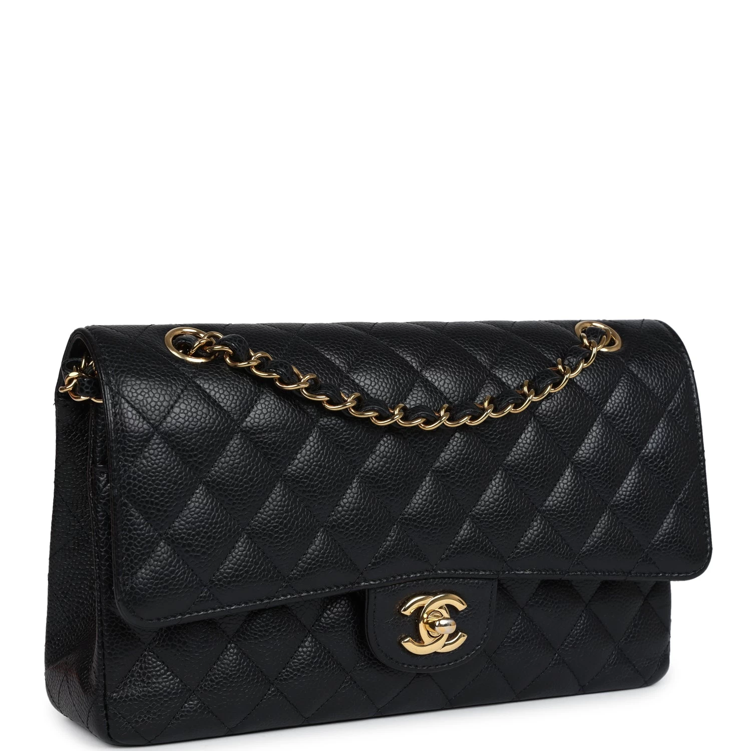 This medium classic double flap bag is in black caviar leather with gold tone hardware and features a front flap with signature CC turnlock closure, half moon back pocket, and adjustable interwoven gold tone chain link and black leather shoulder strap.