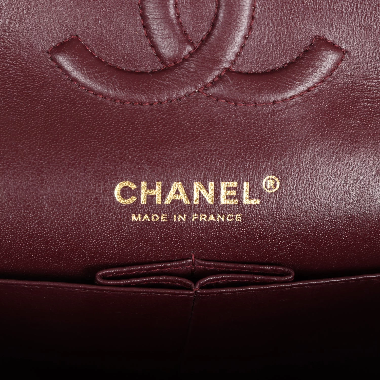 The interior is lined in burgundy leather with the “love letter” zipper compartment underneath the first flap, an “outer” slit pocket under the second flap, and an interior compartment with two open pockets separated by a “lipstick” compartment.