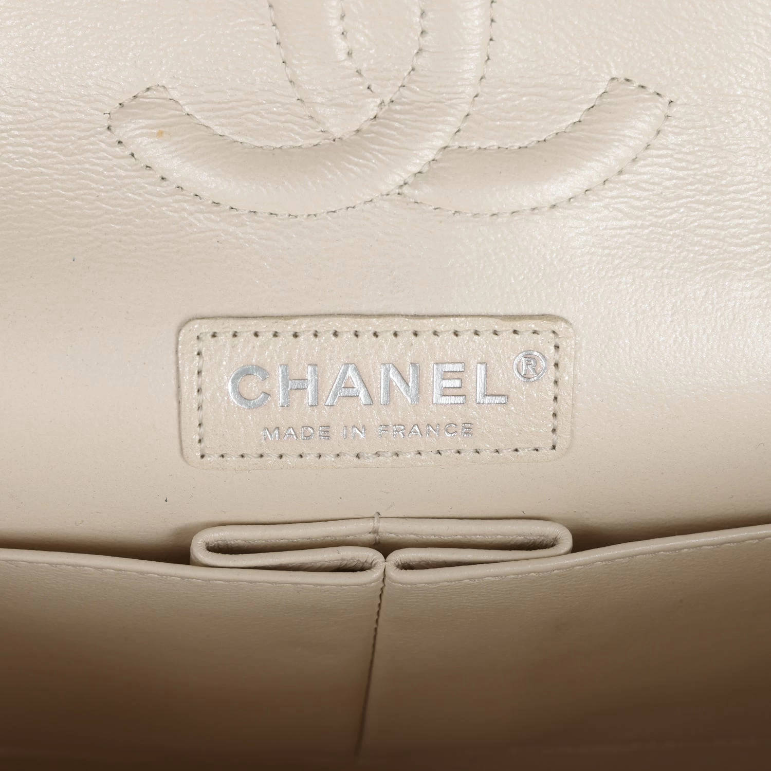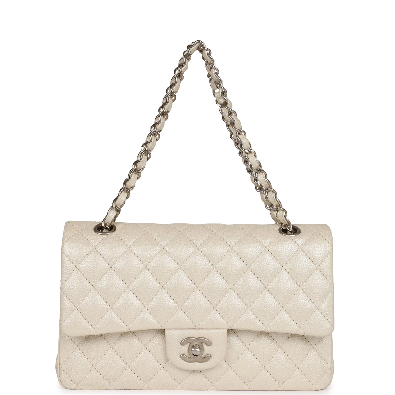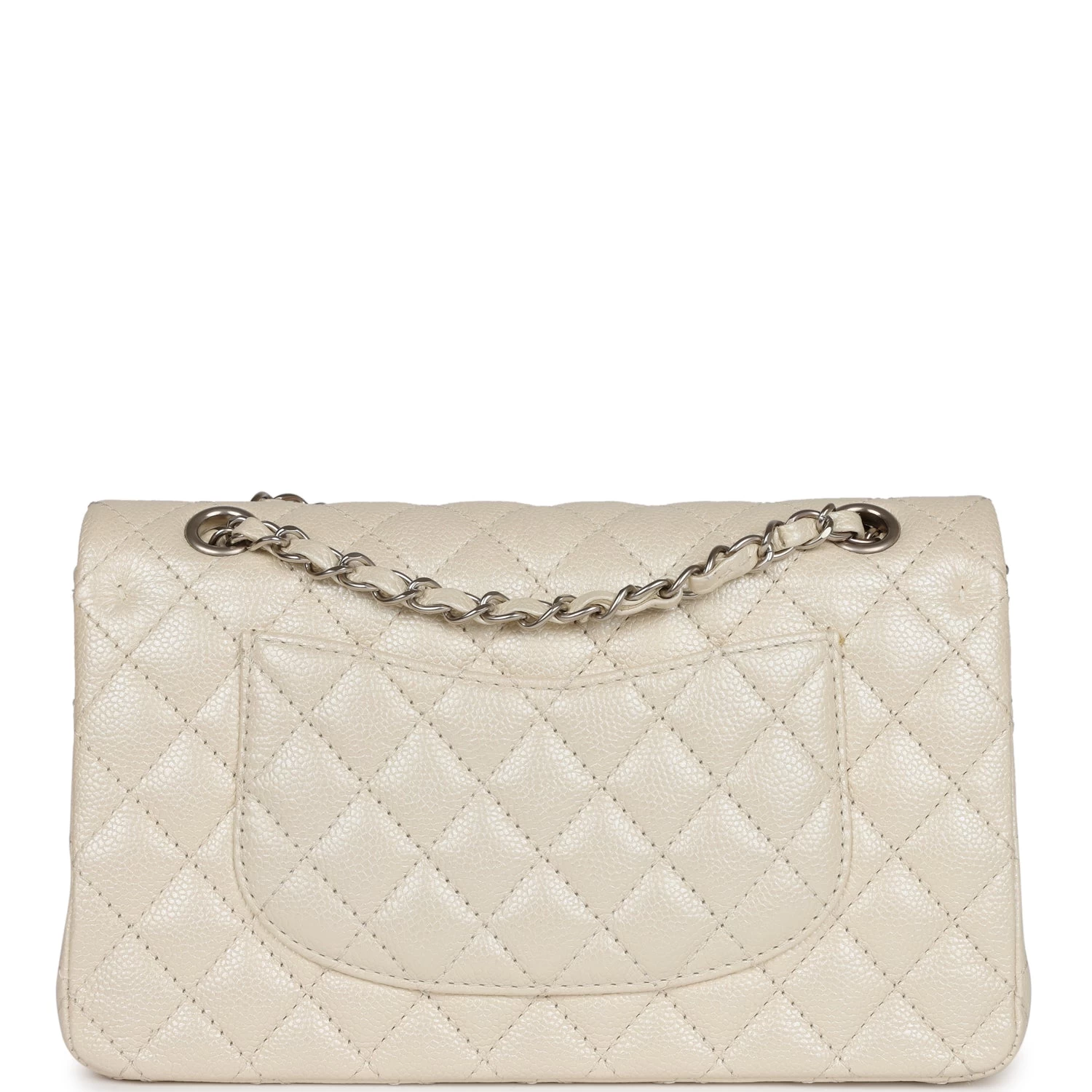 This Medium Classic Double Flap Bag is in Pearlescent Ivory Caviar with Brushed Silver Hardware, front flap with CC turnlock closure, tonal stitching, half moon back pocket and an adjustable interwoven brushed silver chain link and pearlescent leather shoulder/crossbody strap.