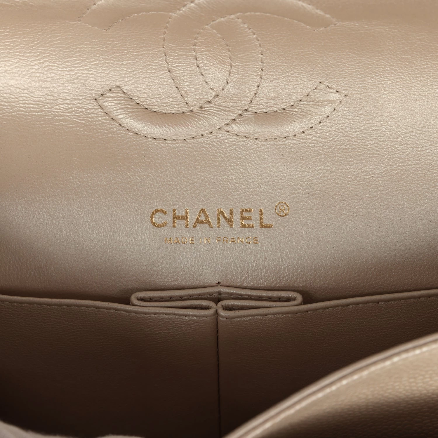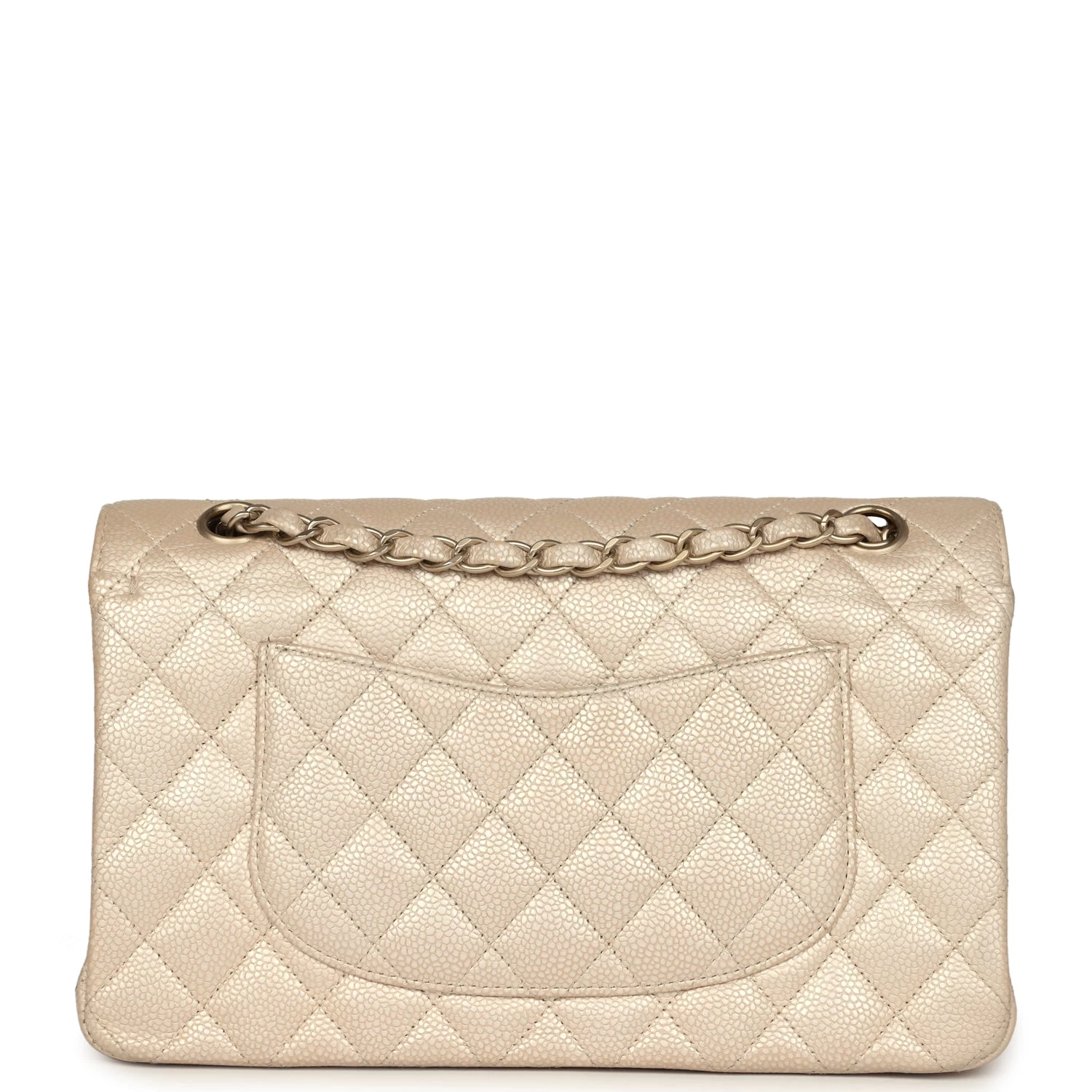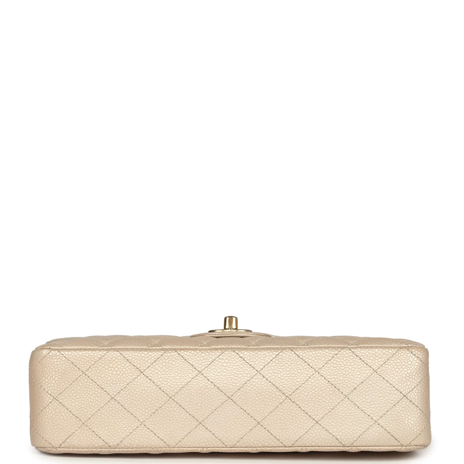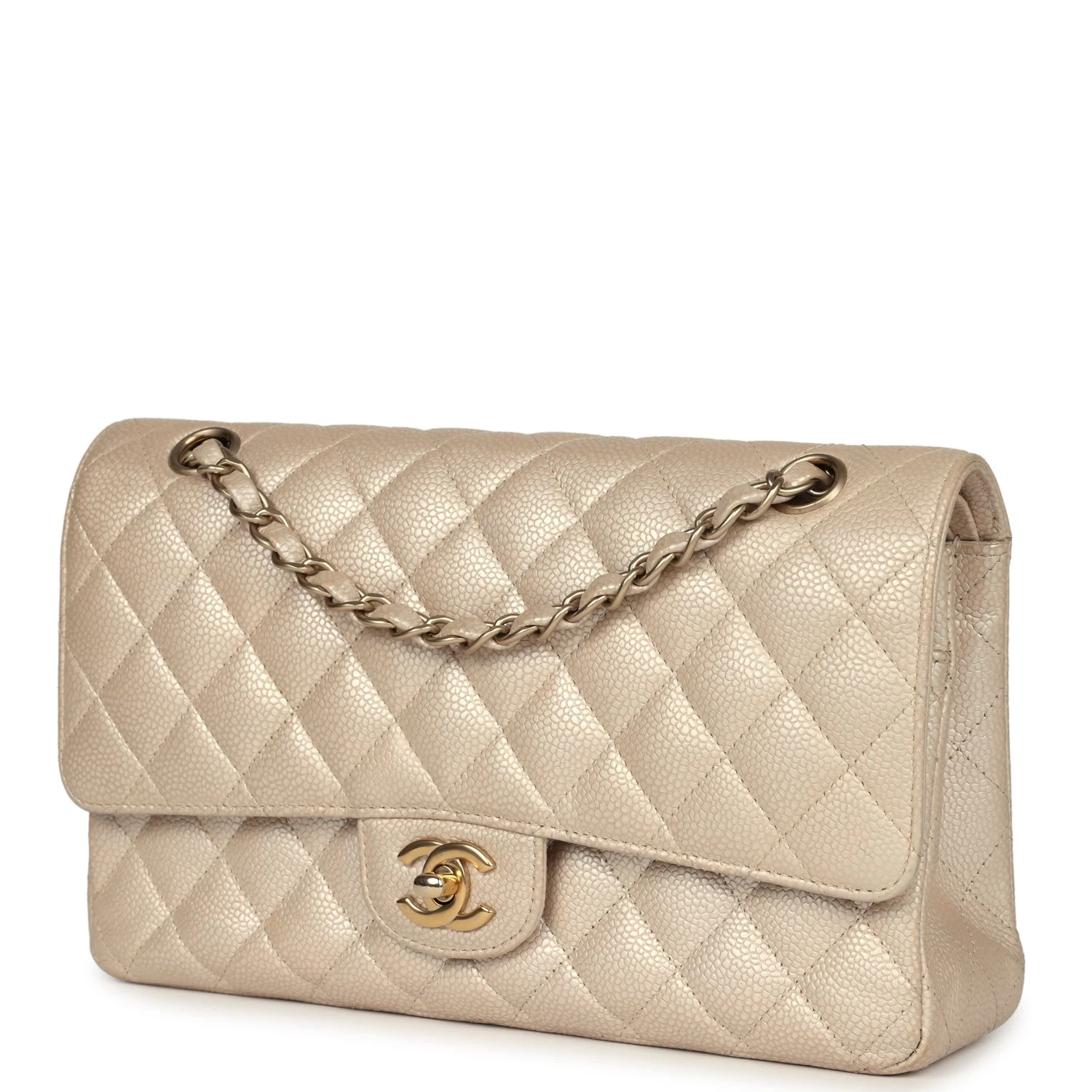 This Medium Classic Double Flap bag is in pearly light beige caviar leather with gold tone hardware and features a front flap with signature CC turnlock closure, half moon back pocket, and adjustable interwoven gold tone chain link and pearly light beige leather shoulder strap.