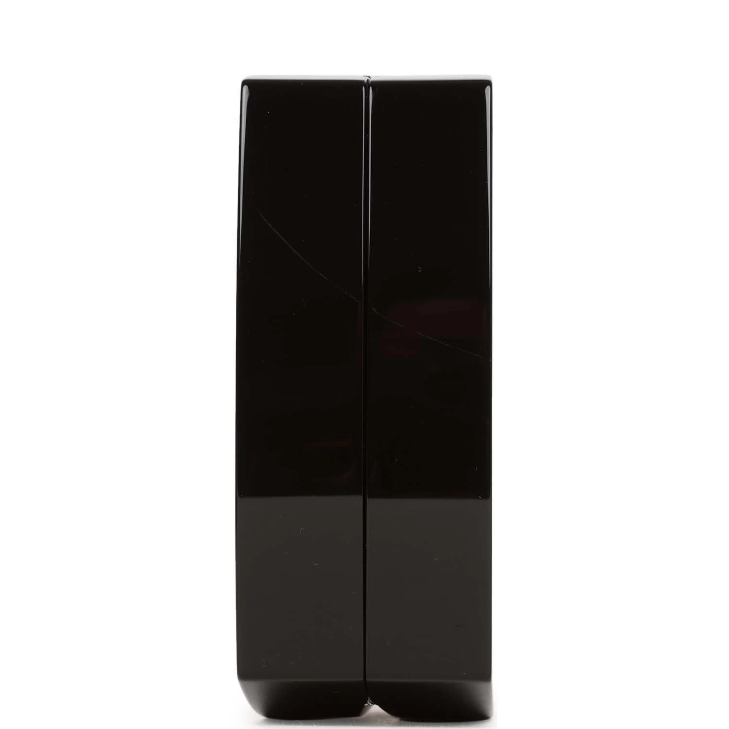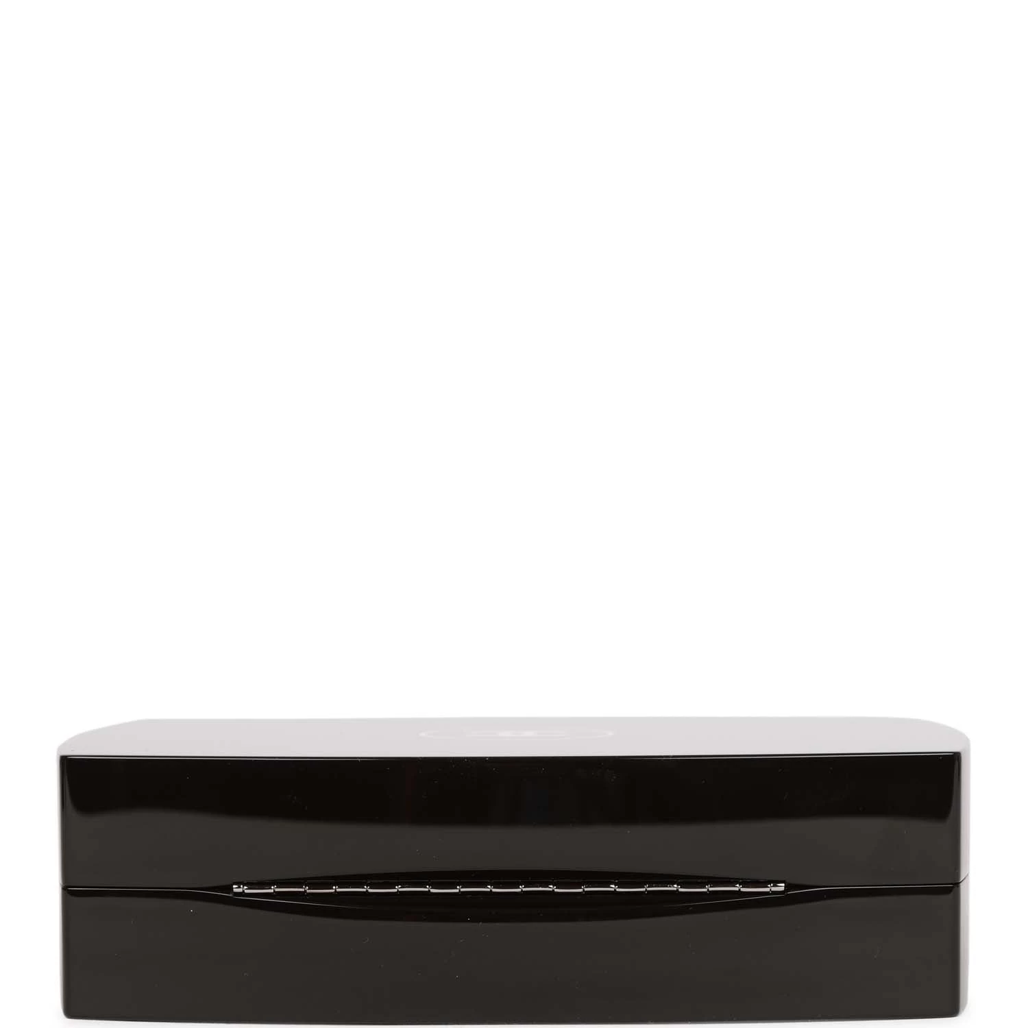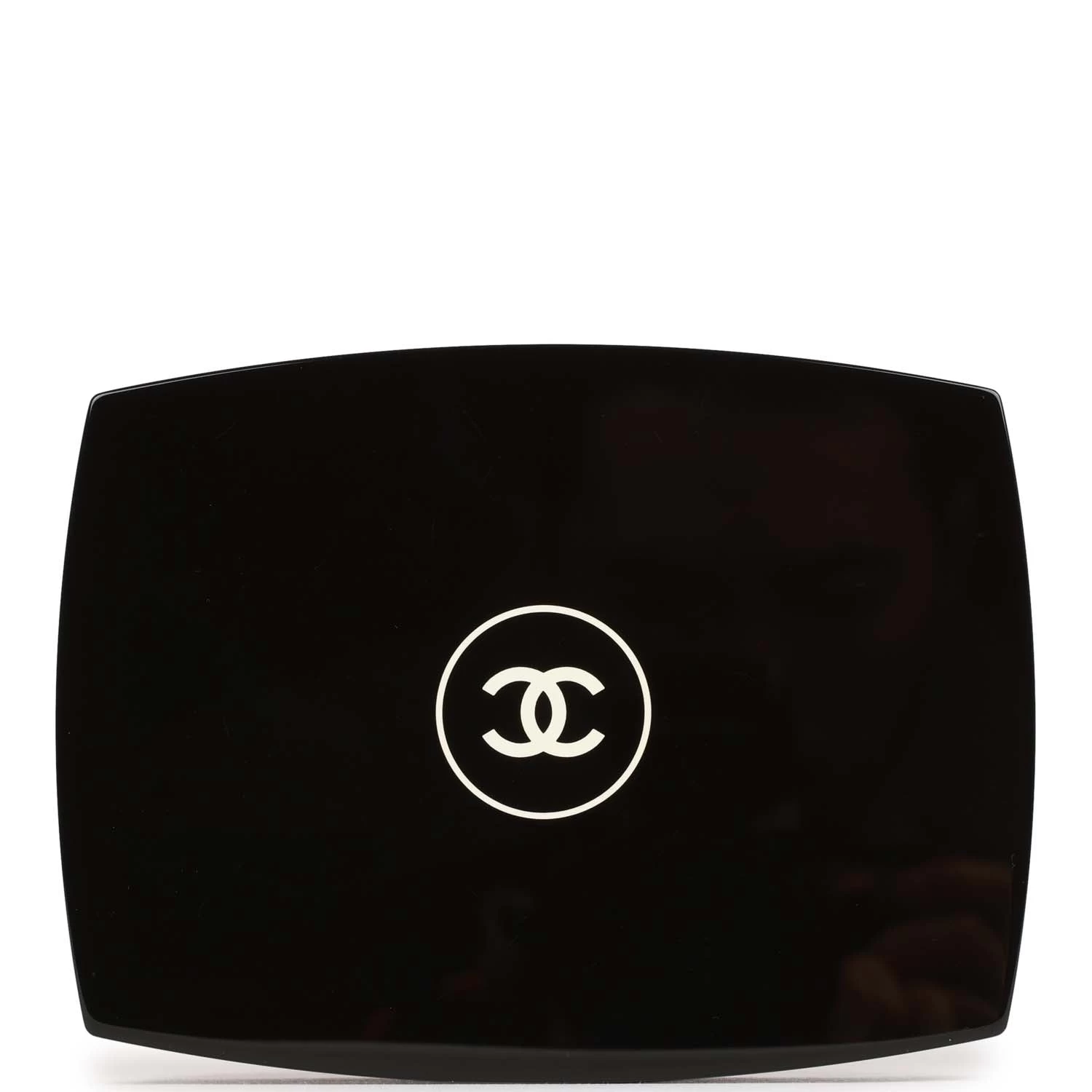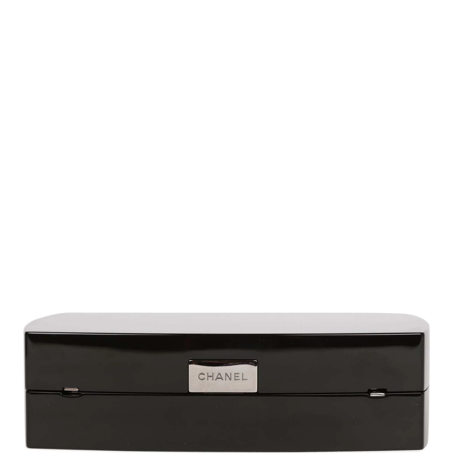 This Minaudiere clutch is in Black acrylic in the shape of a makeup compact with silver hardware, a white CC logo at center, a frame snap closure, and a long shoulder/crossbody strap that can be tucked away.