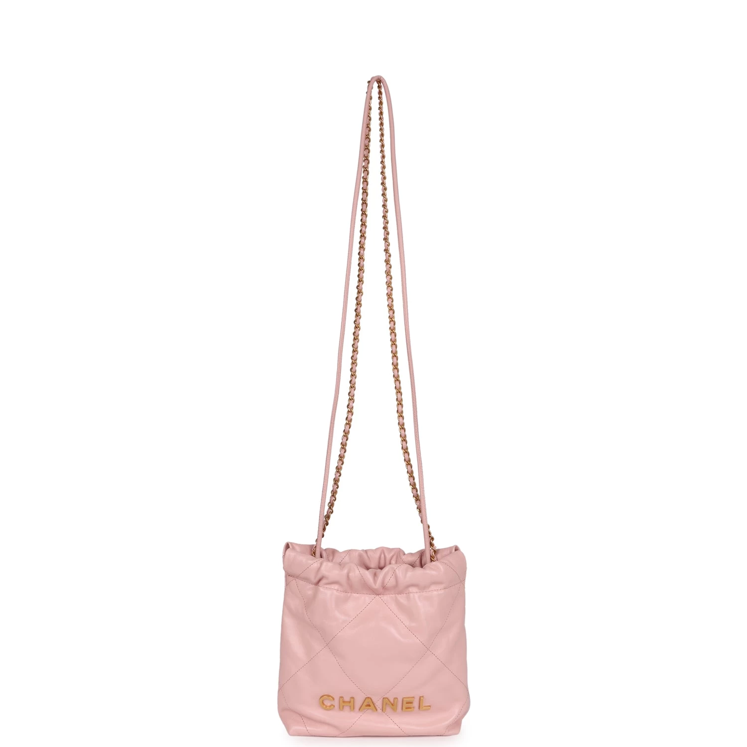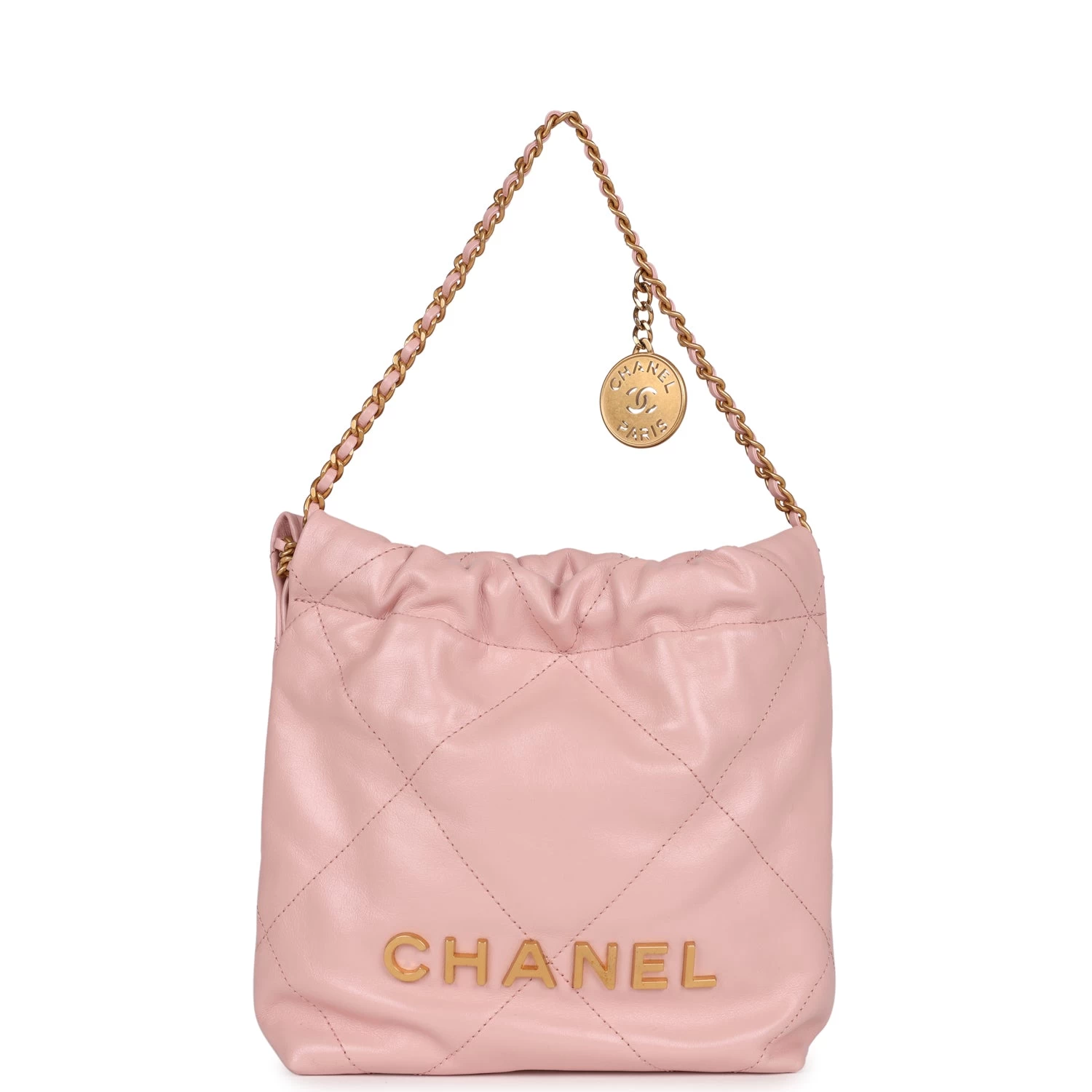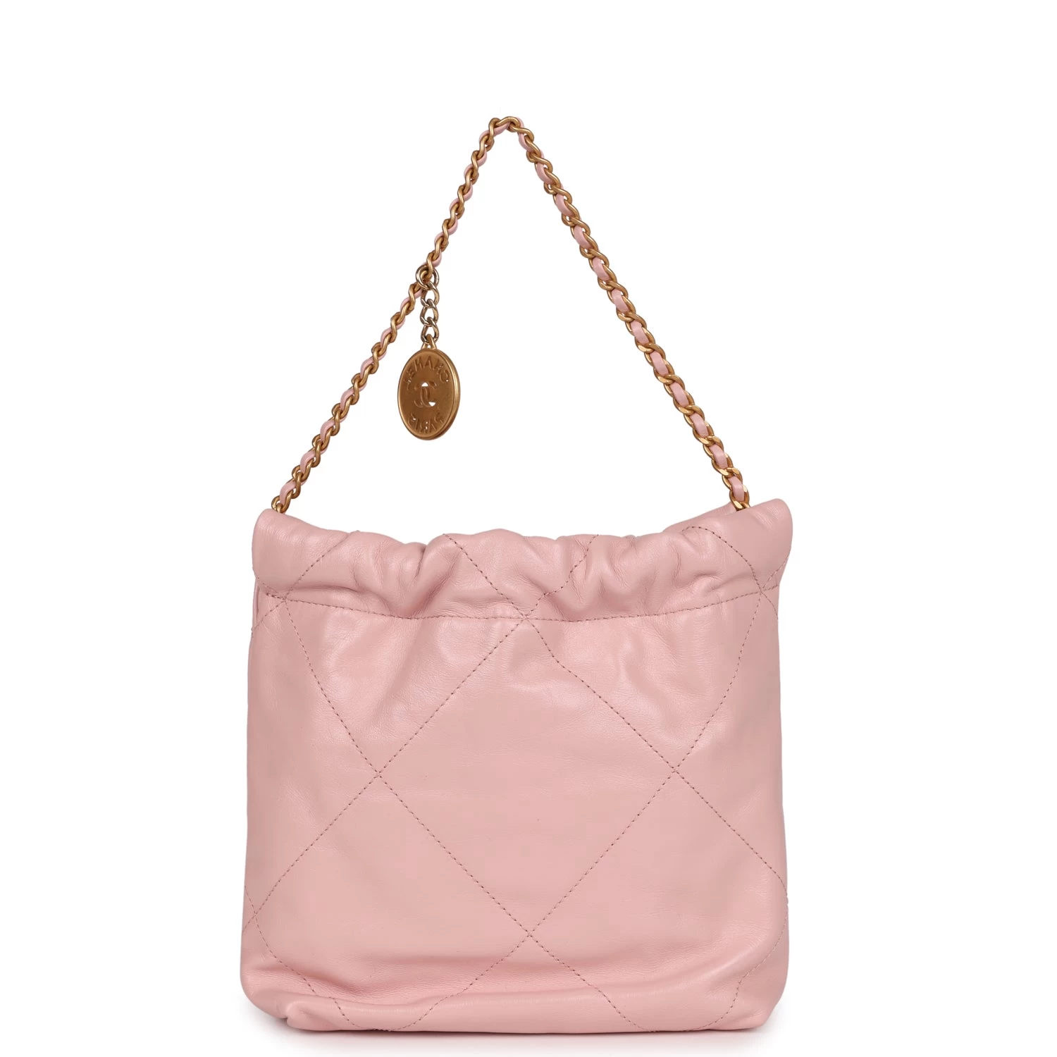 This mini 22 hobo bag is in Pink calfskin with gold tone hardware and has the signature diamond quilting, CHANEL on the front in gold tone metal, and a long gold tone and pink leather interwoven chain.