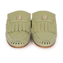 Chanel Lion Head Mules In Sage Green Fringe Leather 35