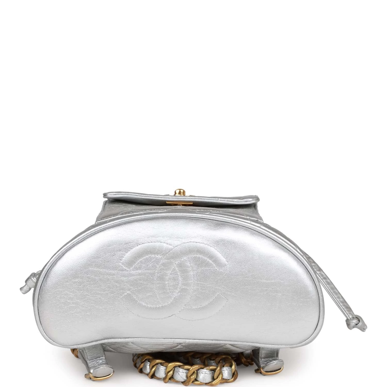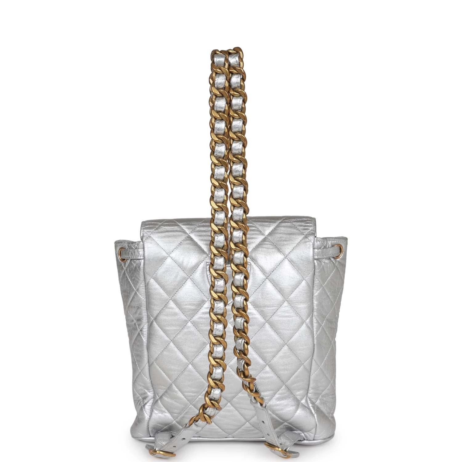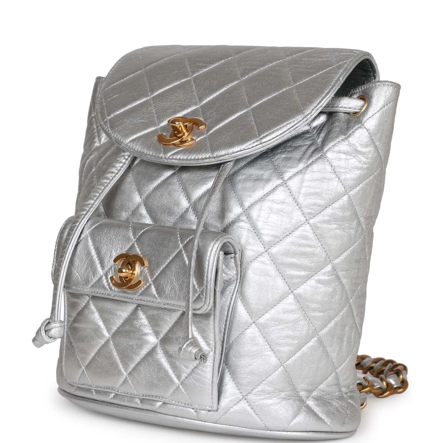 This Vintage Duma backpack is in Silver metallic lambskin with gold hardware, signature CC interlocking closure with front flap, an additional drawstring closure, exterior front pocket, two shoulder straps for backpack use, and gold metal and silver leather chain.