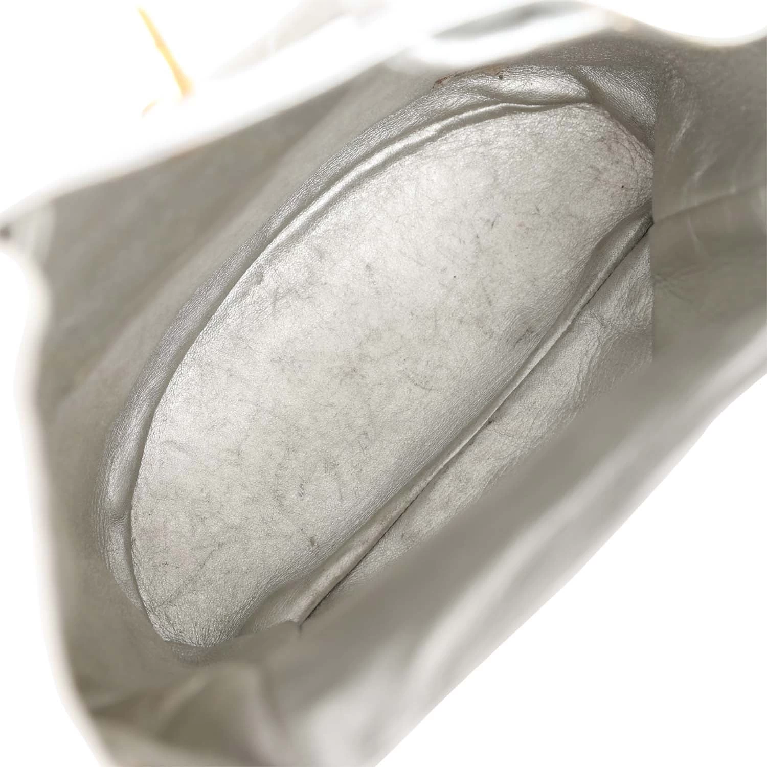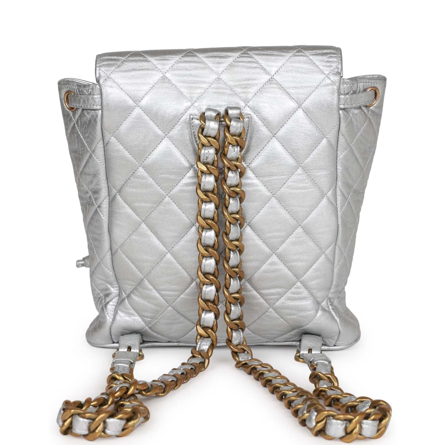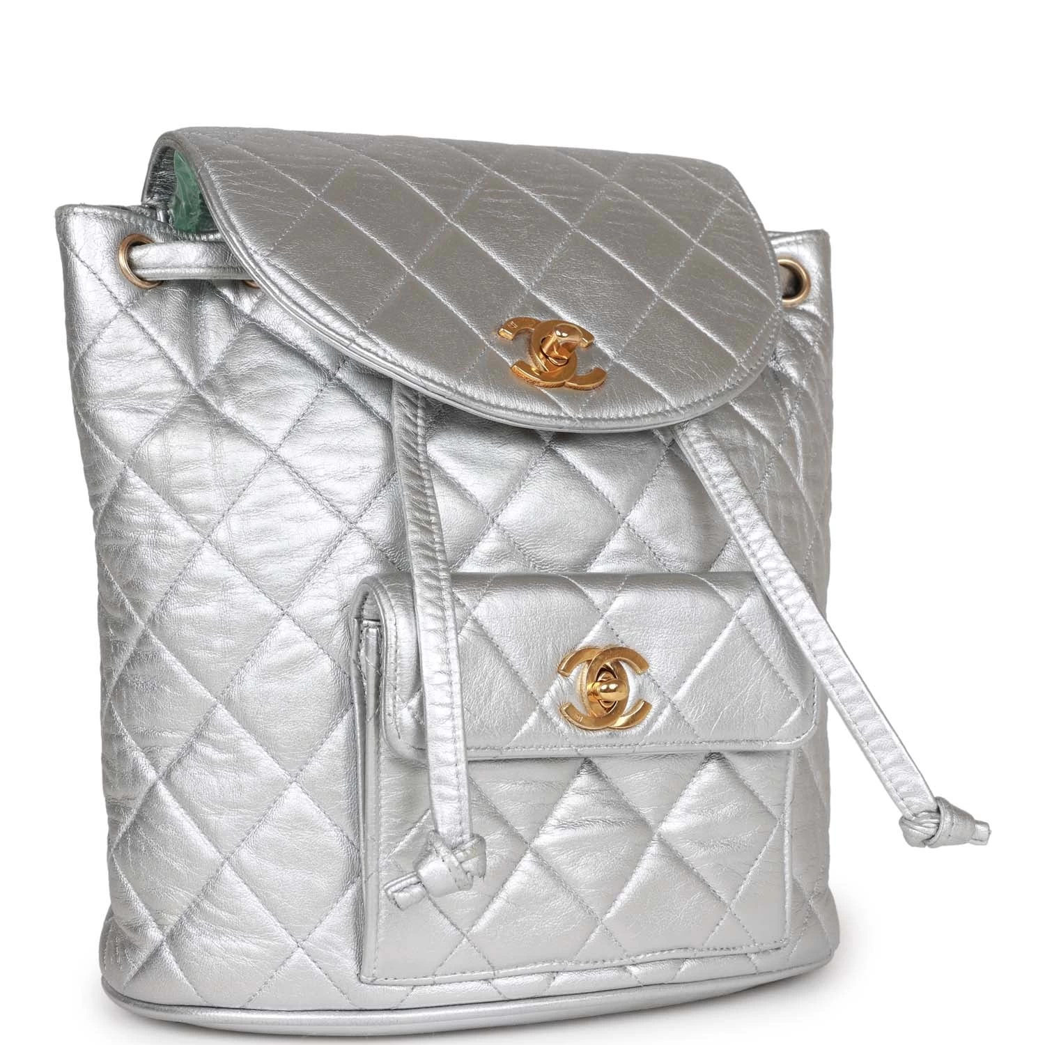 This Vintage Duma backpack is in Silver metallic lambskin with gold hardware, signature CC interlocking closure with front flap, an additional drawstring closure, exterior front pocket, two shoulder straps for backpack use, and gold metal and silver leather chain.