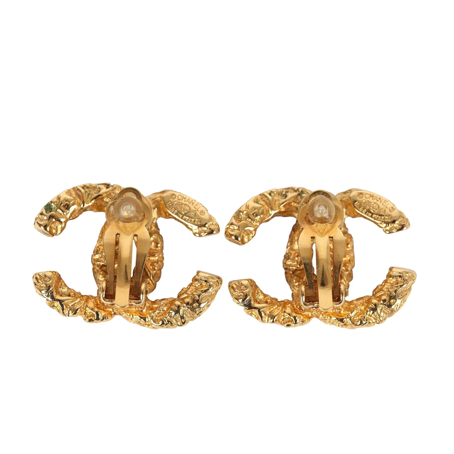 These 1993 Chanel vintage Florentine CC earrings are in gold tone hardware, featuring a hammered-like lava effect and a clip on back closure.