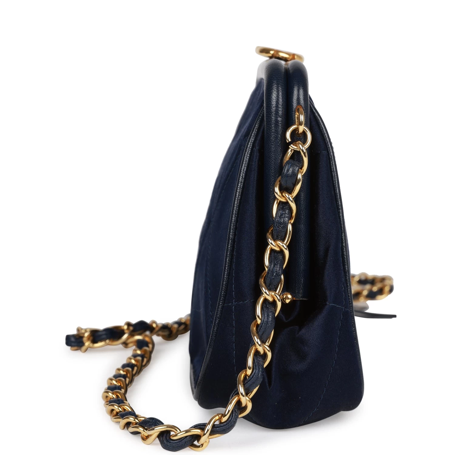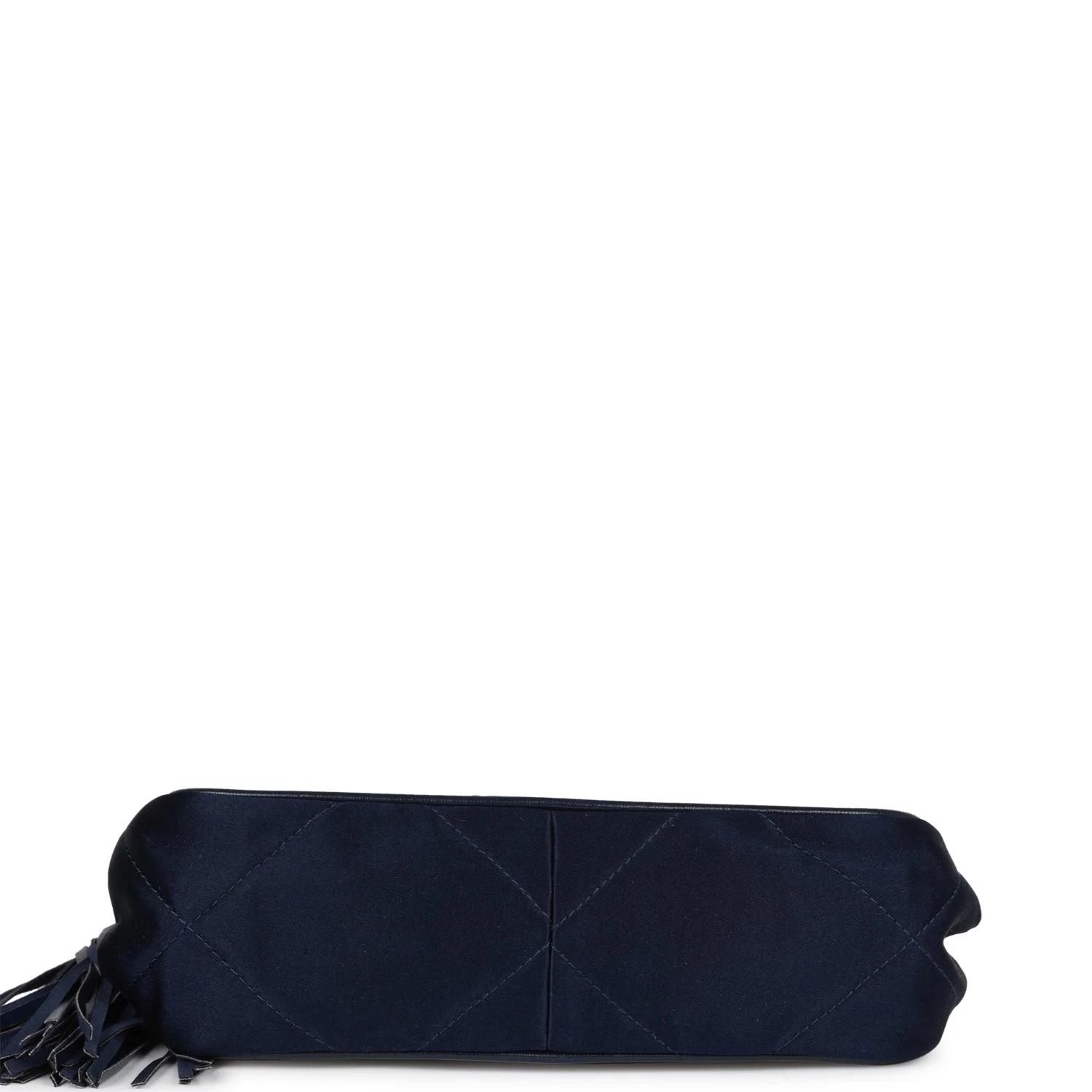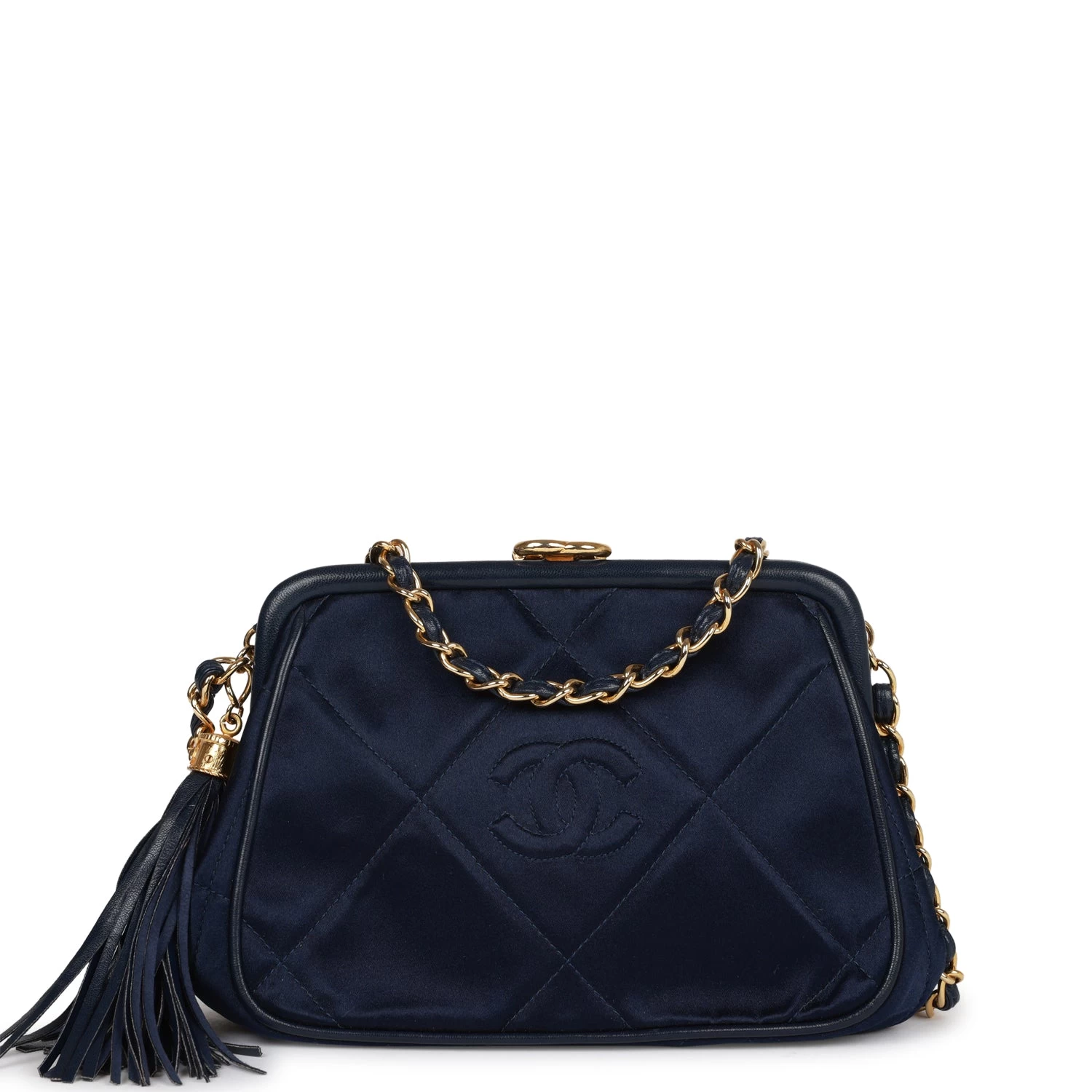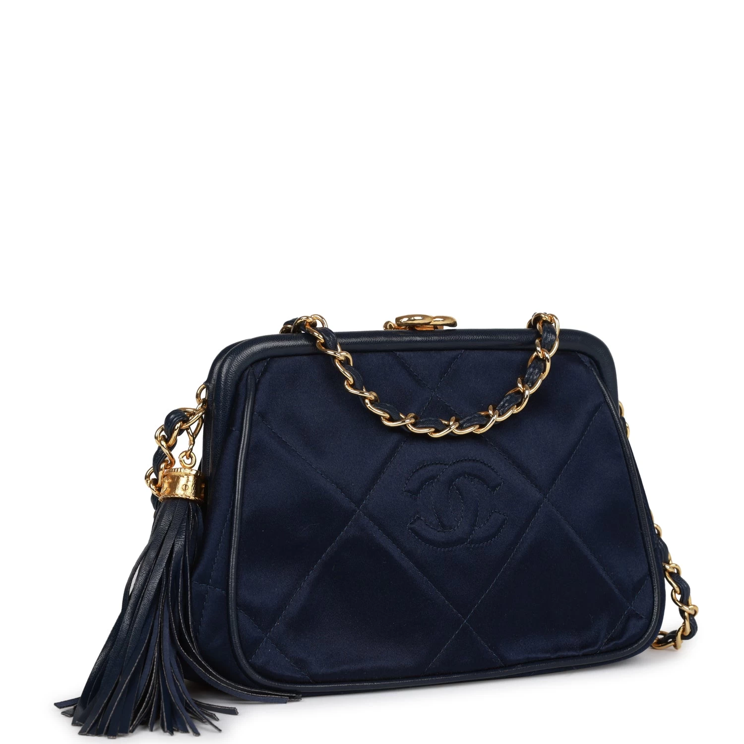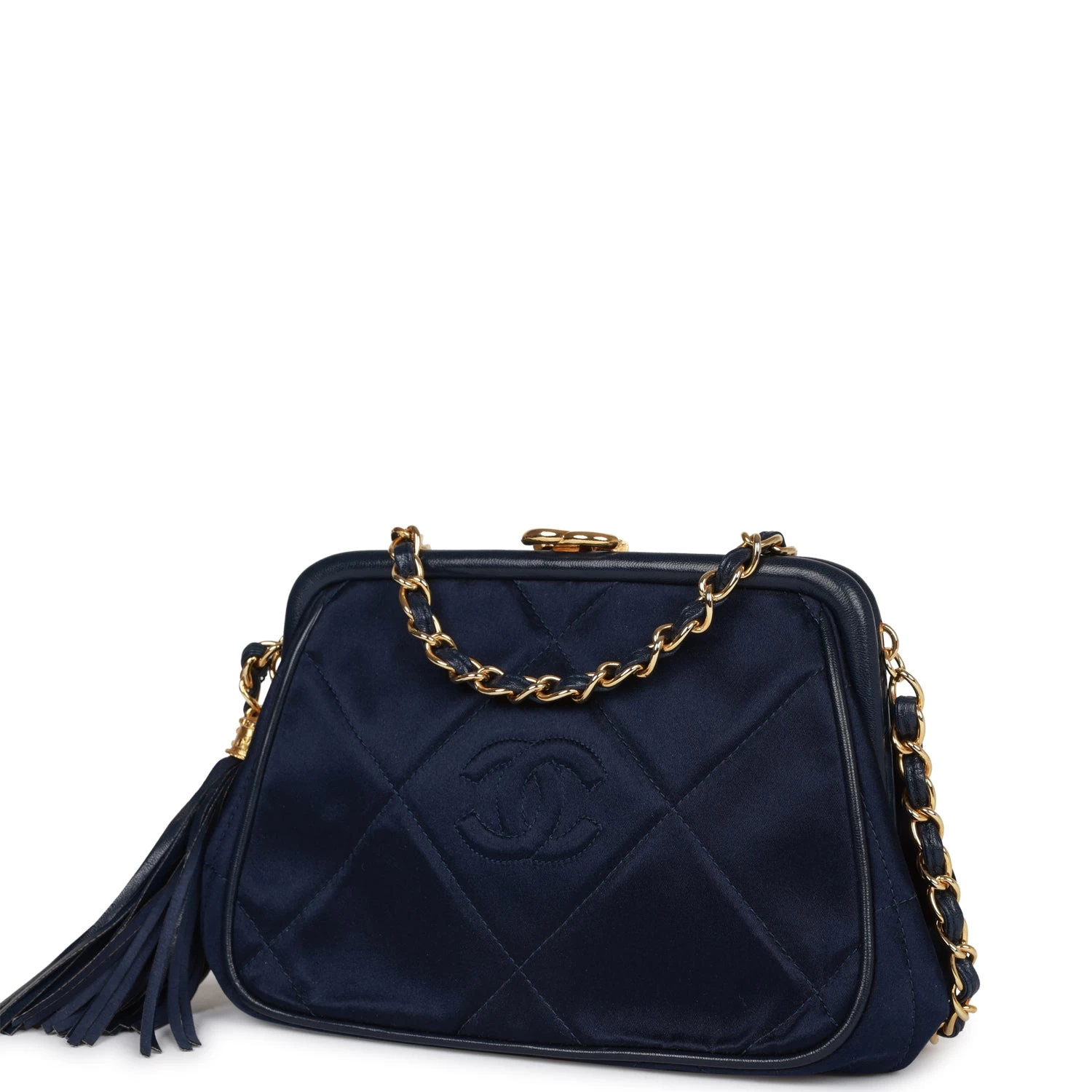 This Vintage Frame Tassel bag is in Navy satin with gold hardware, front CC logo with quilted satin, navy leather fringed tassel, top CC Kiss lock closure, and interwoven gold plated chain link and navy leather shoulder/crossbody strap