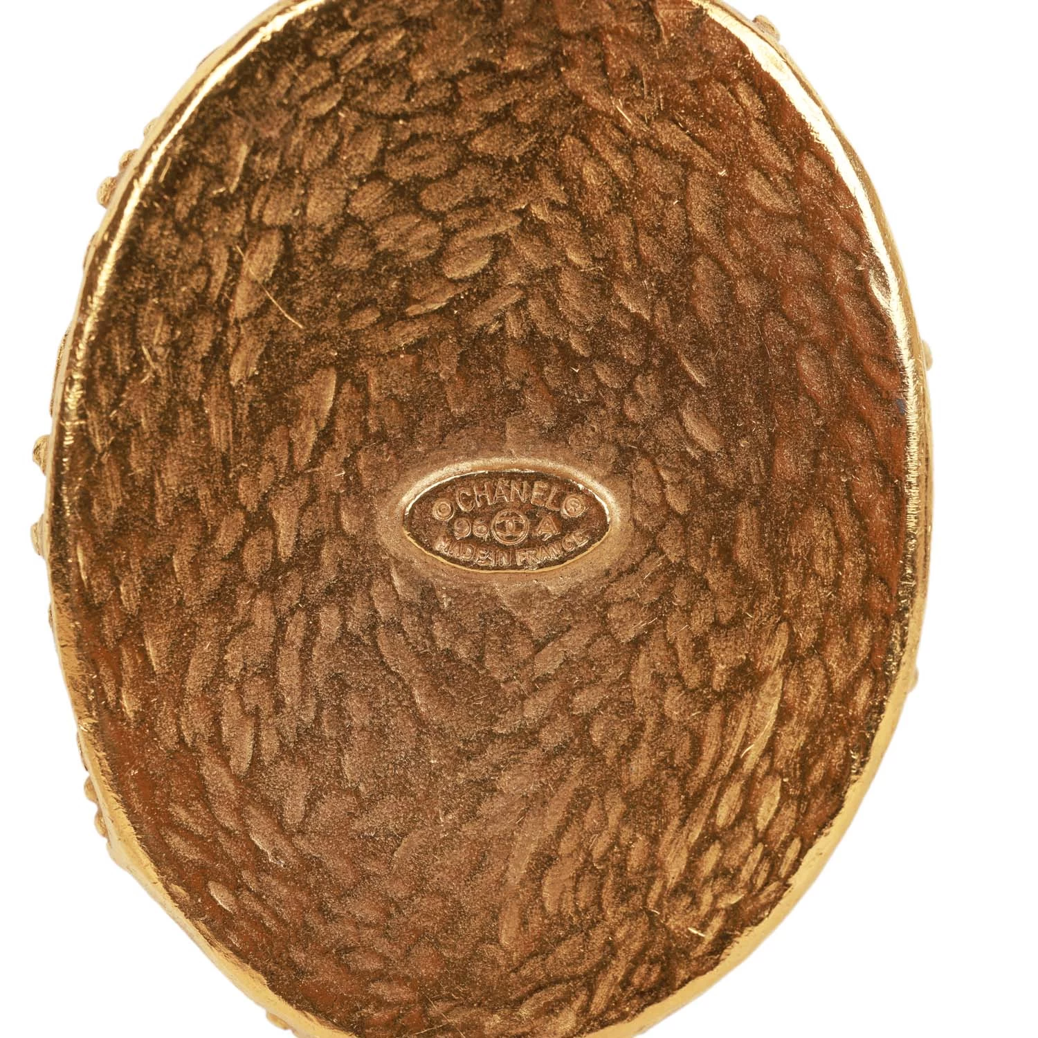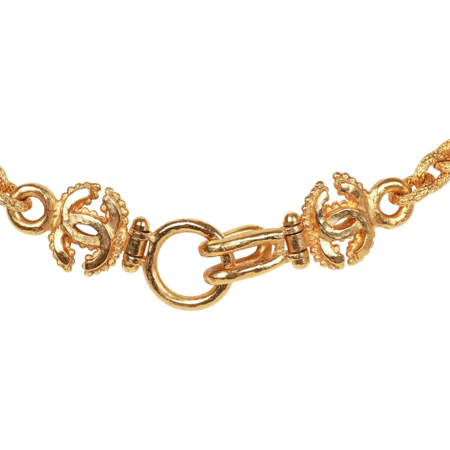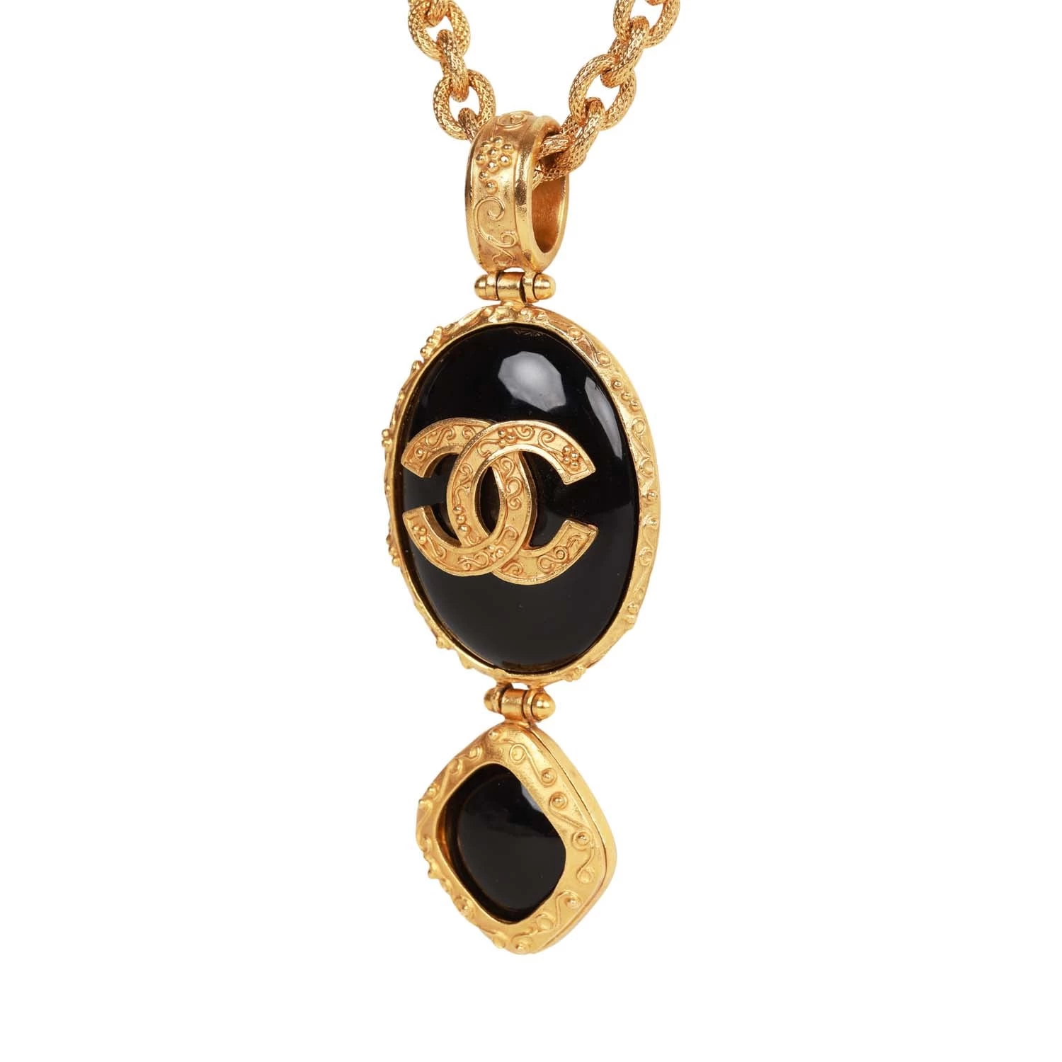 This 96A Chanel Vintage Gold Necklace features an oval pendant with embossed CC logo, a chain link with six black beads, and a hook clasp.