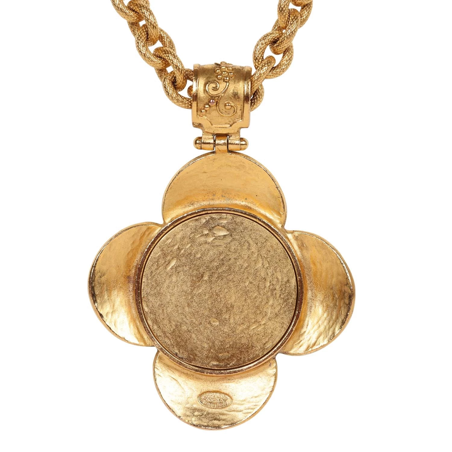 This Vintage Chanel Gold grapevine mirror pendant necklace is in gold plated metal, features a woven chain, mirror pendant with grapevines bordering, and a hook and eye closure.