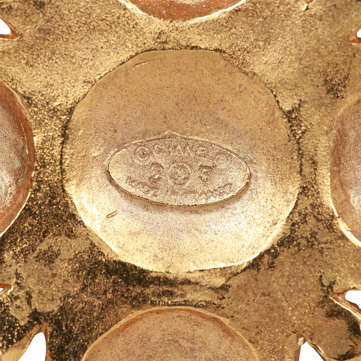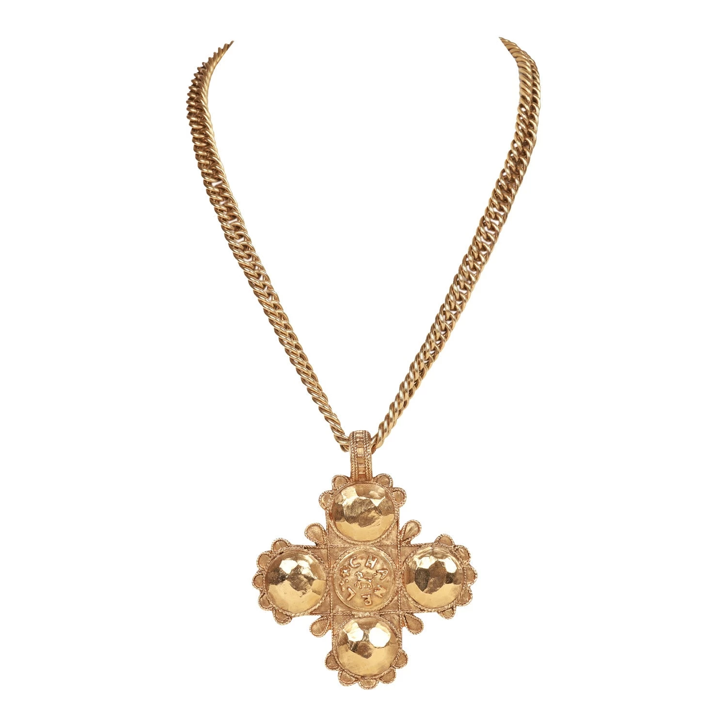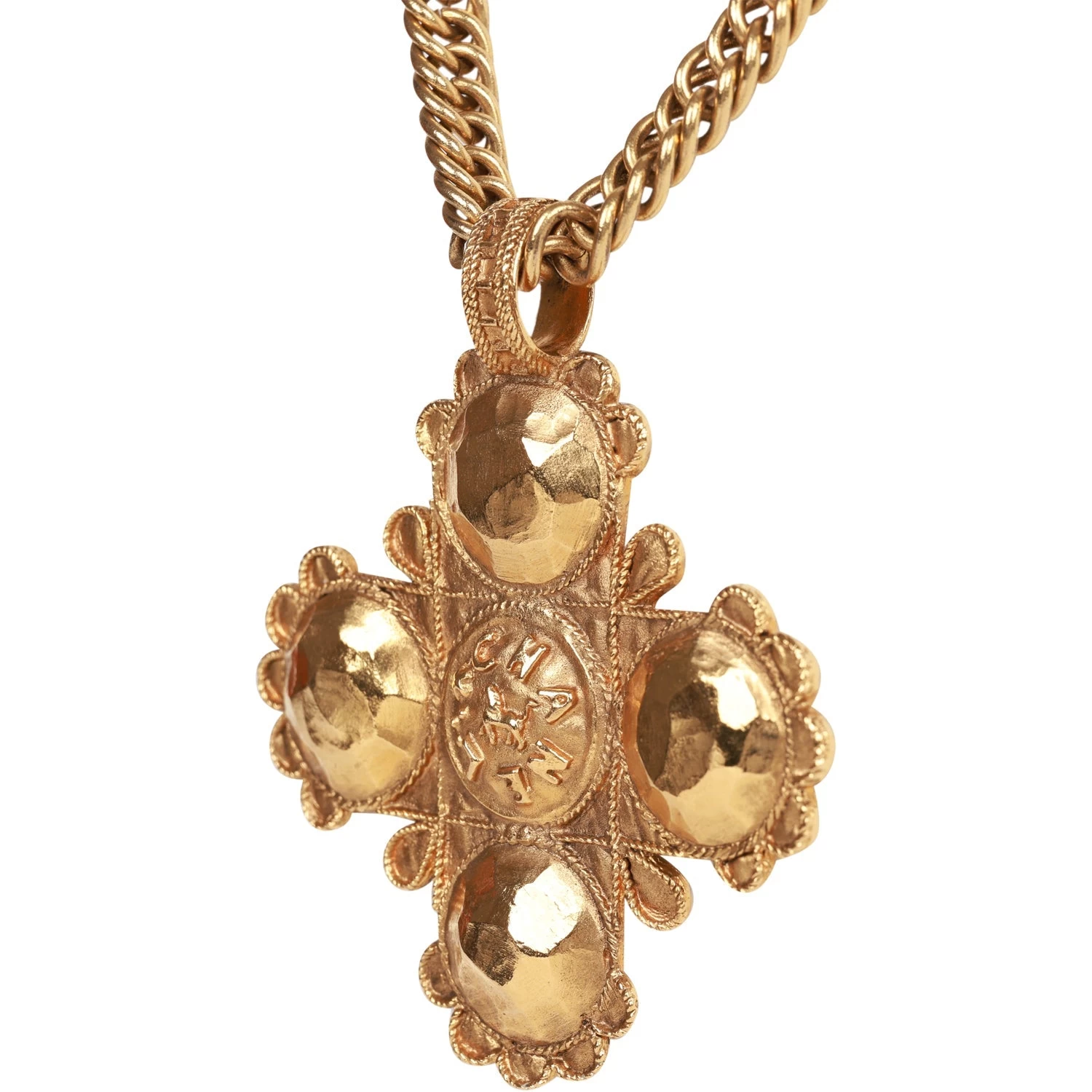 This vintage 1980s necklace is in gold plated metal, features a woven chain, lion cross pendant with “CHANEL” engraving at the center, and a springring closure.