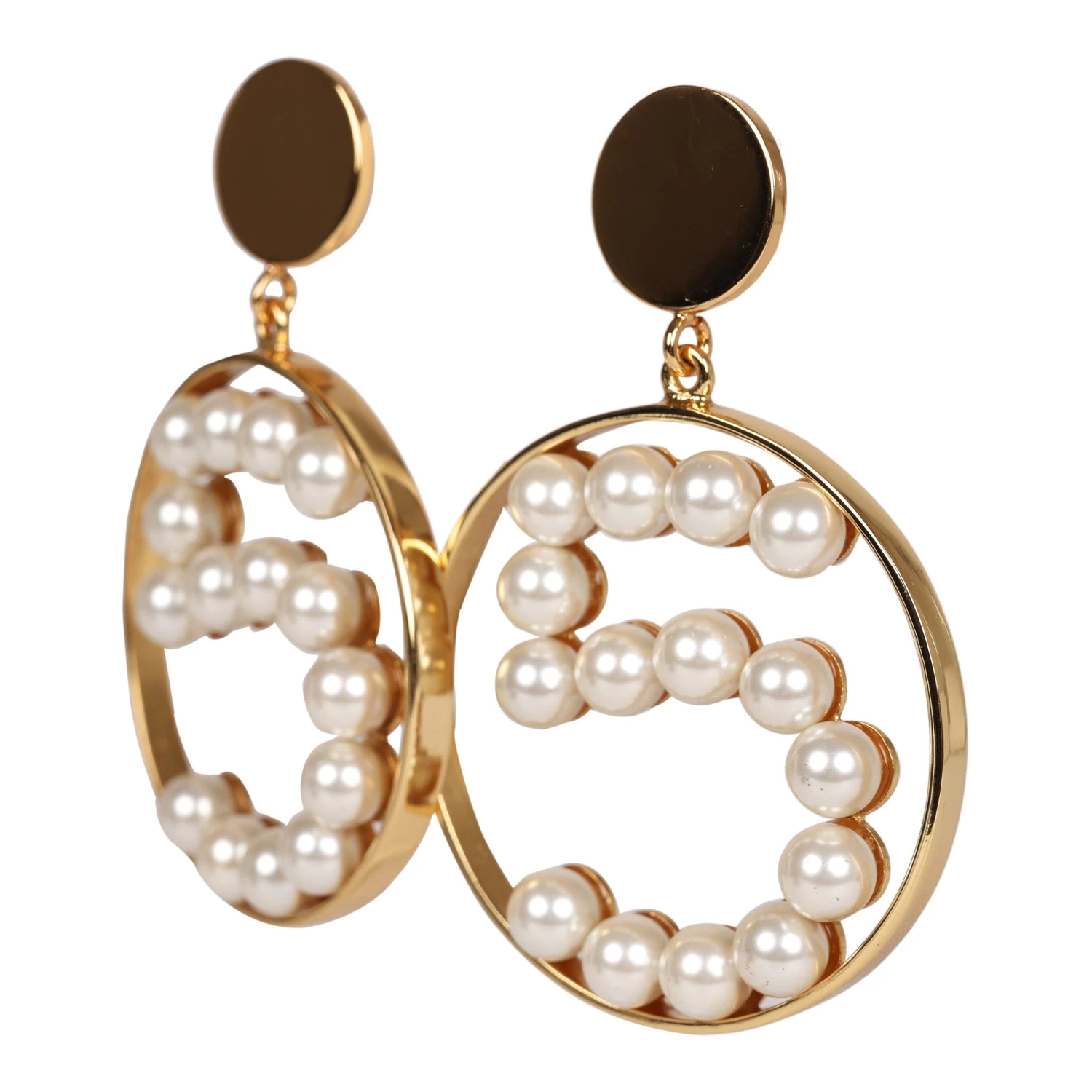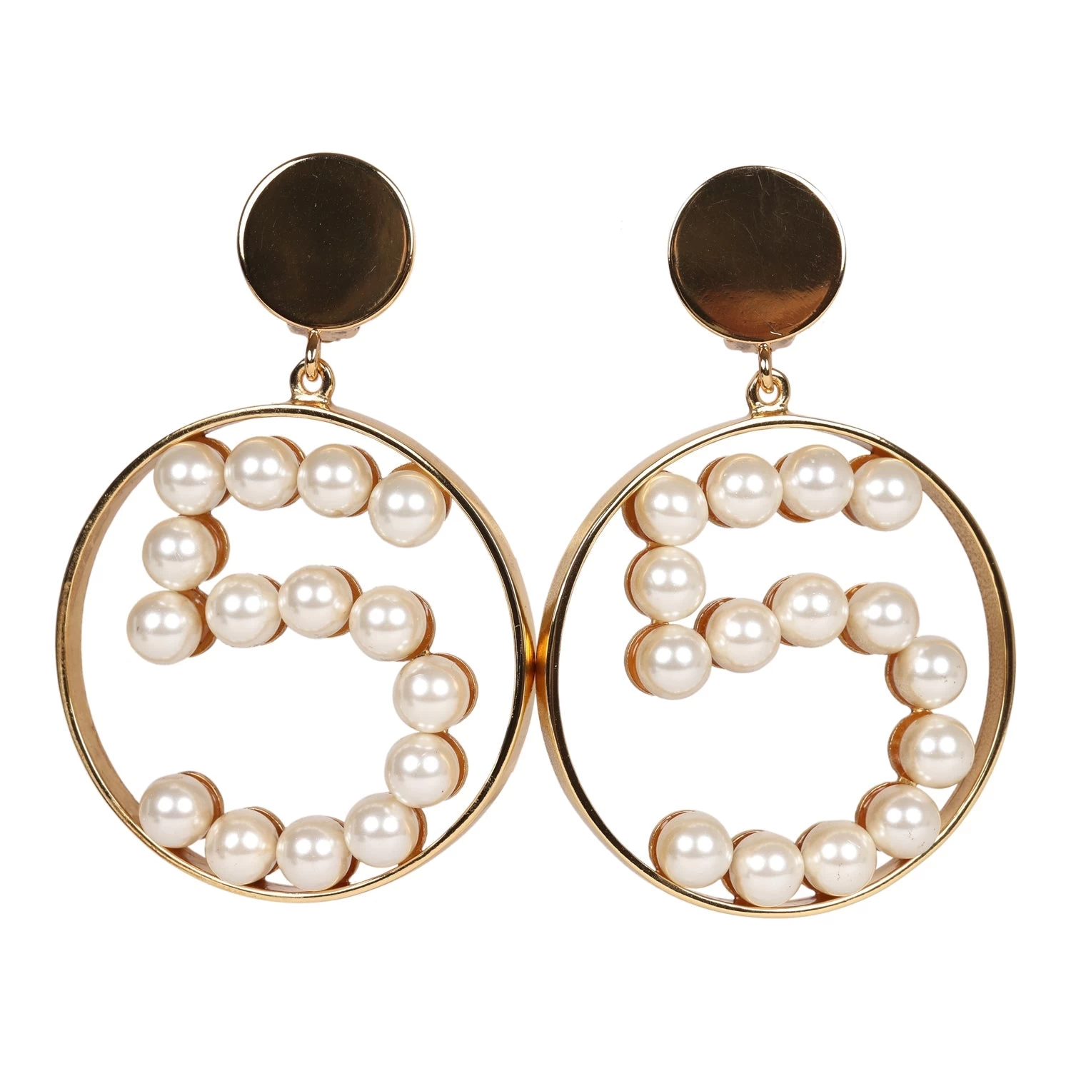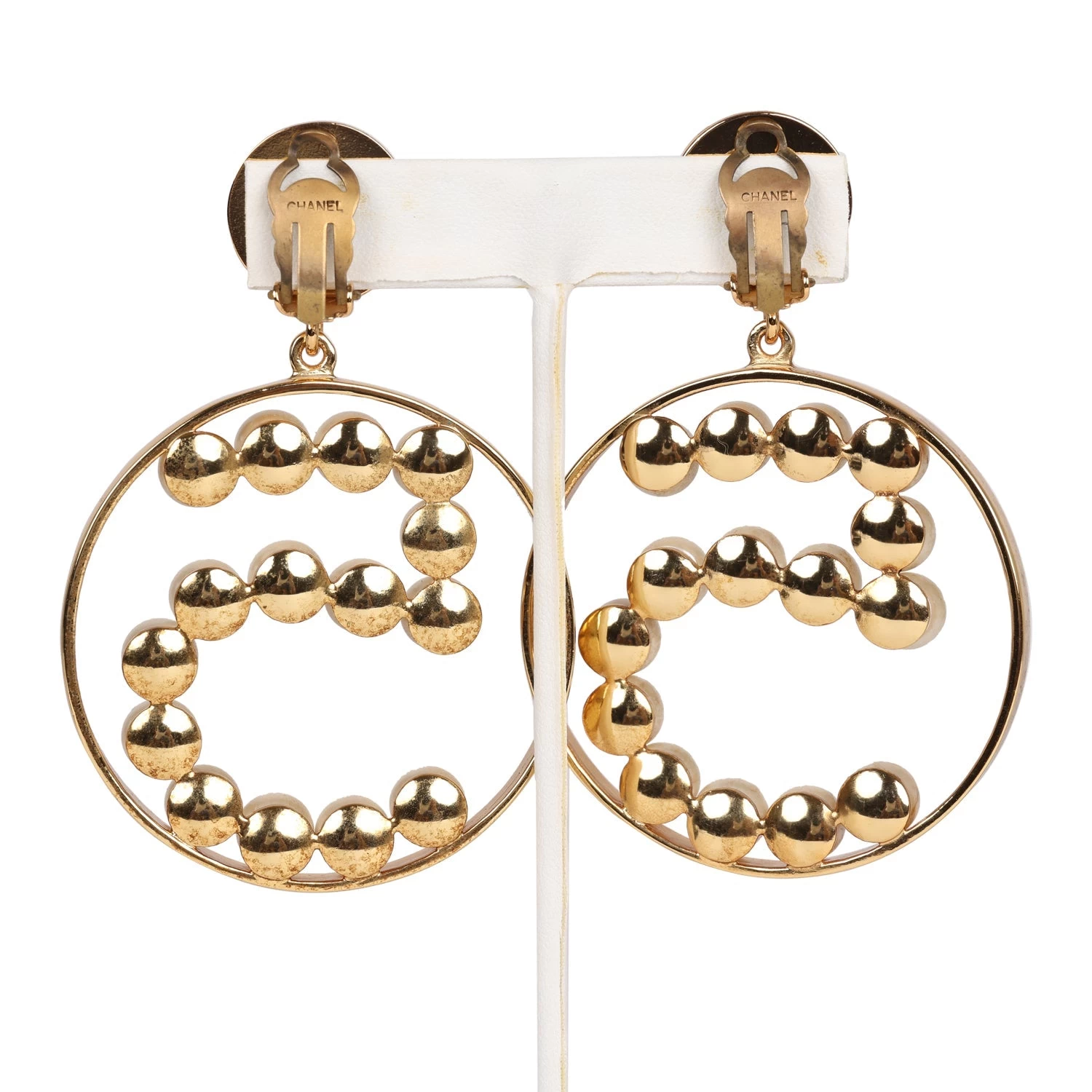 These Vintage 1980’s Chanel No. 5 Circle Dangle earrings are in faux pearl, gold tone metal, and feature a large dotted No. 5 in faux pearls dangling from gold round button clip-ons.