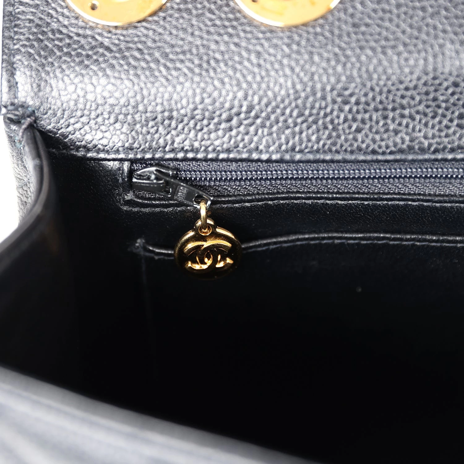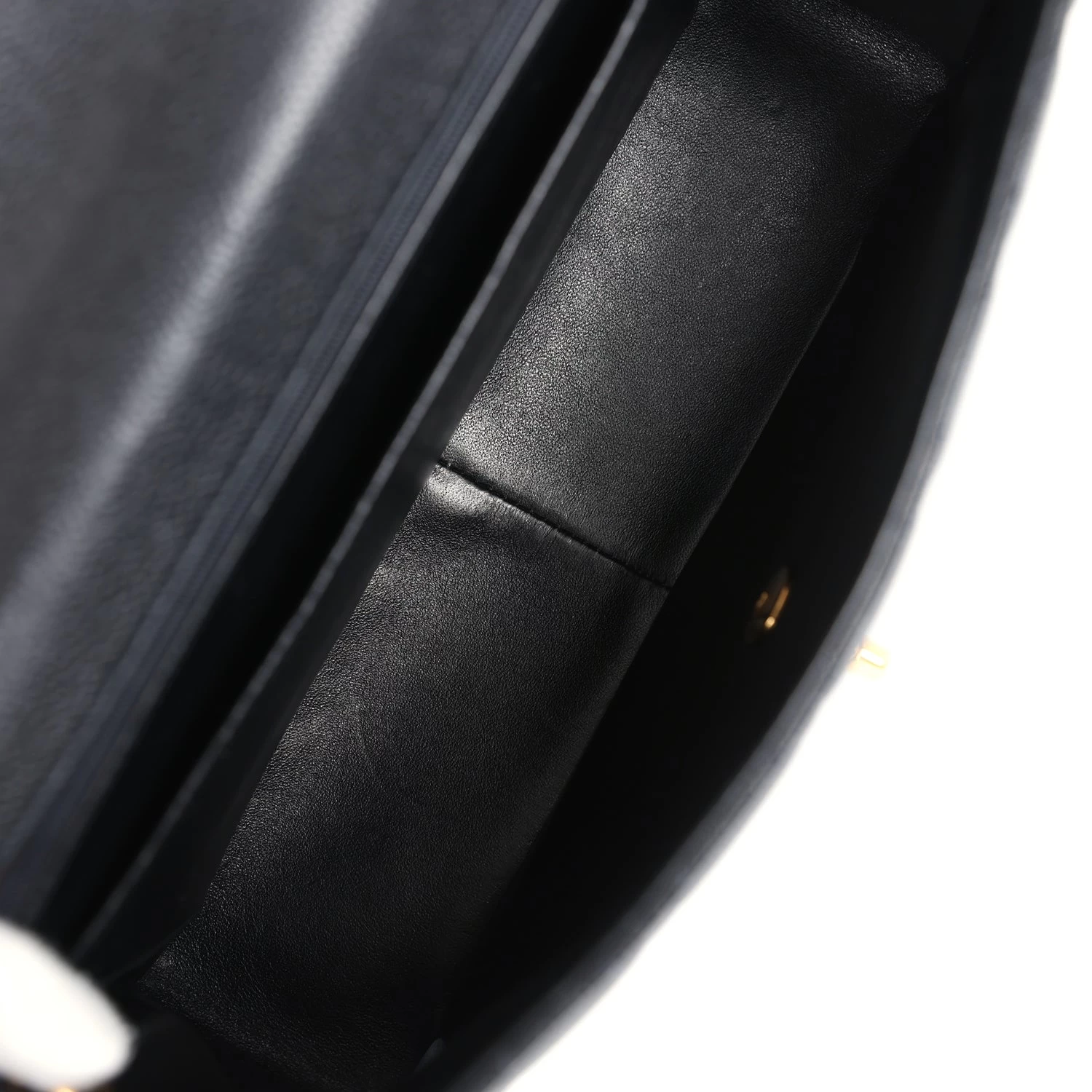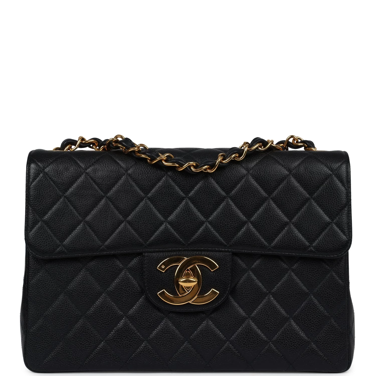 This jumbo classic single flap bag is in black caviar leather with gold tone hardware and features a front flap with signature CC turnlock closure, half moon back pocket, and adjustable interwoven gold tone chain link and black leather shoulder strap.