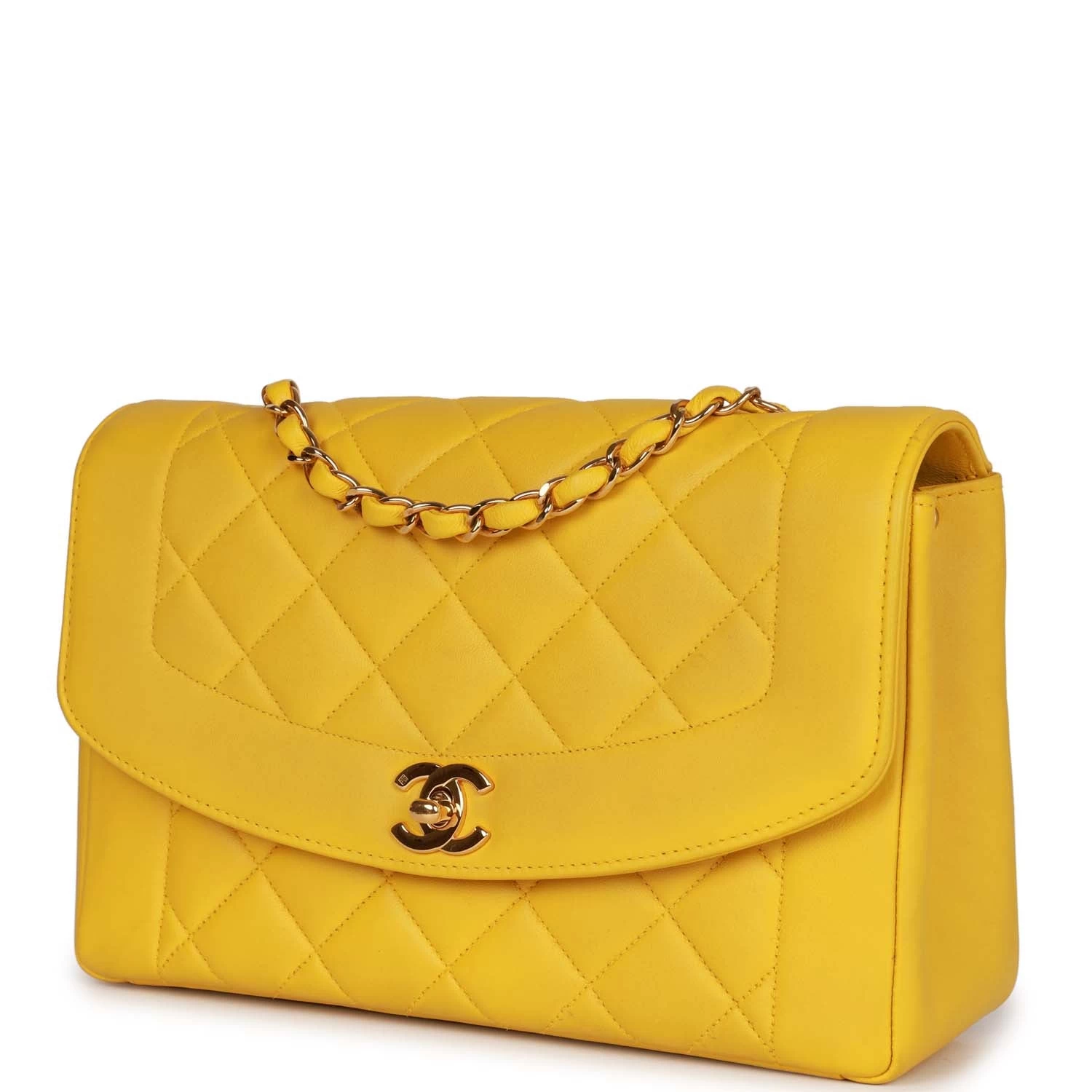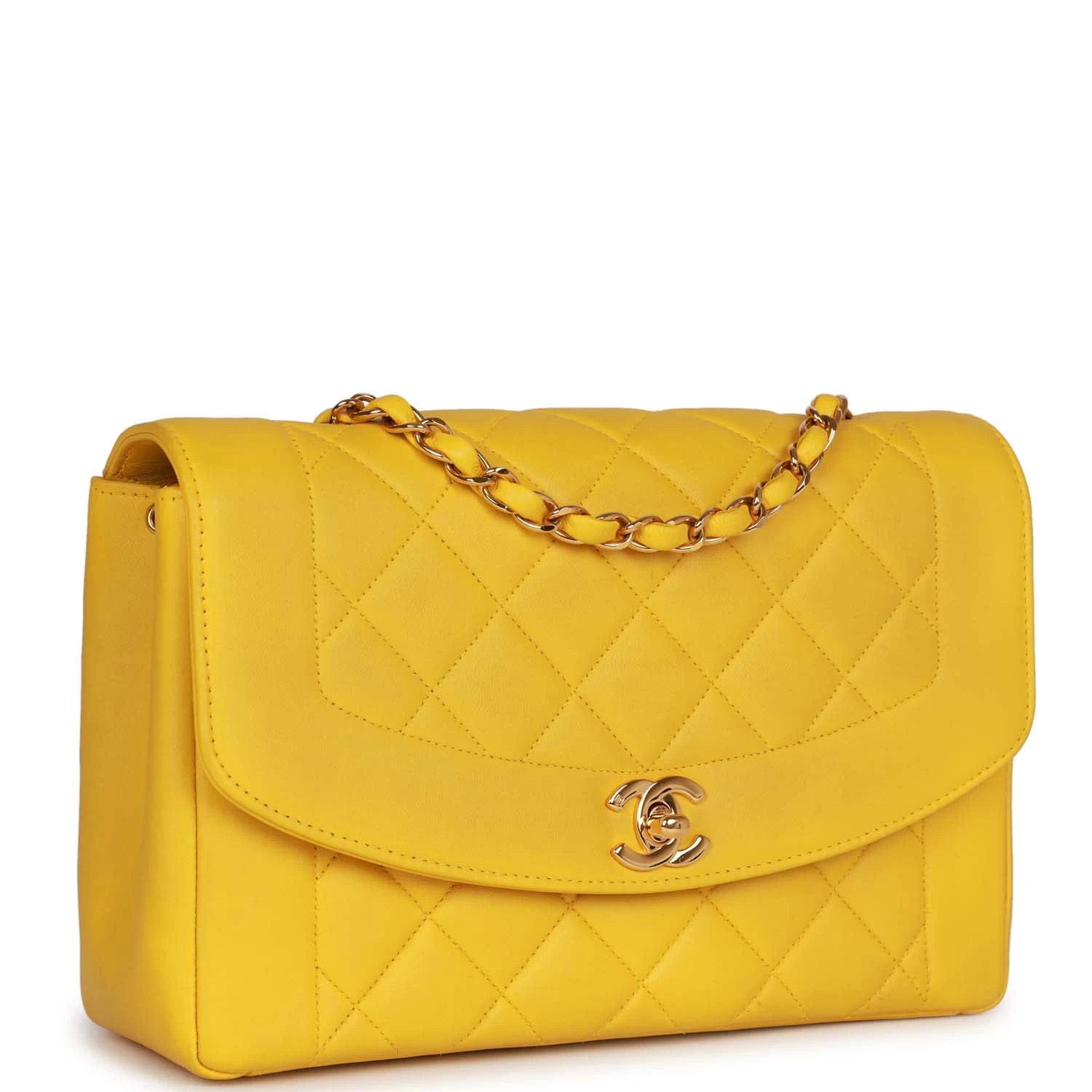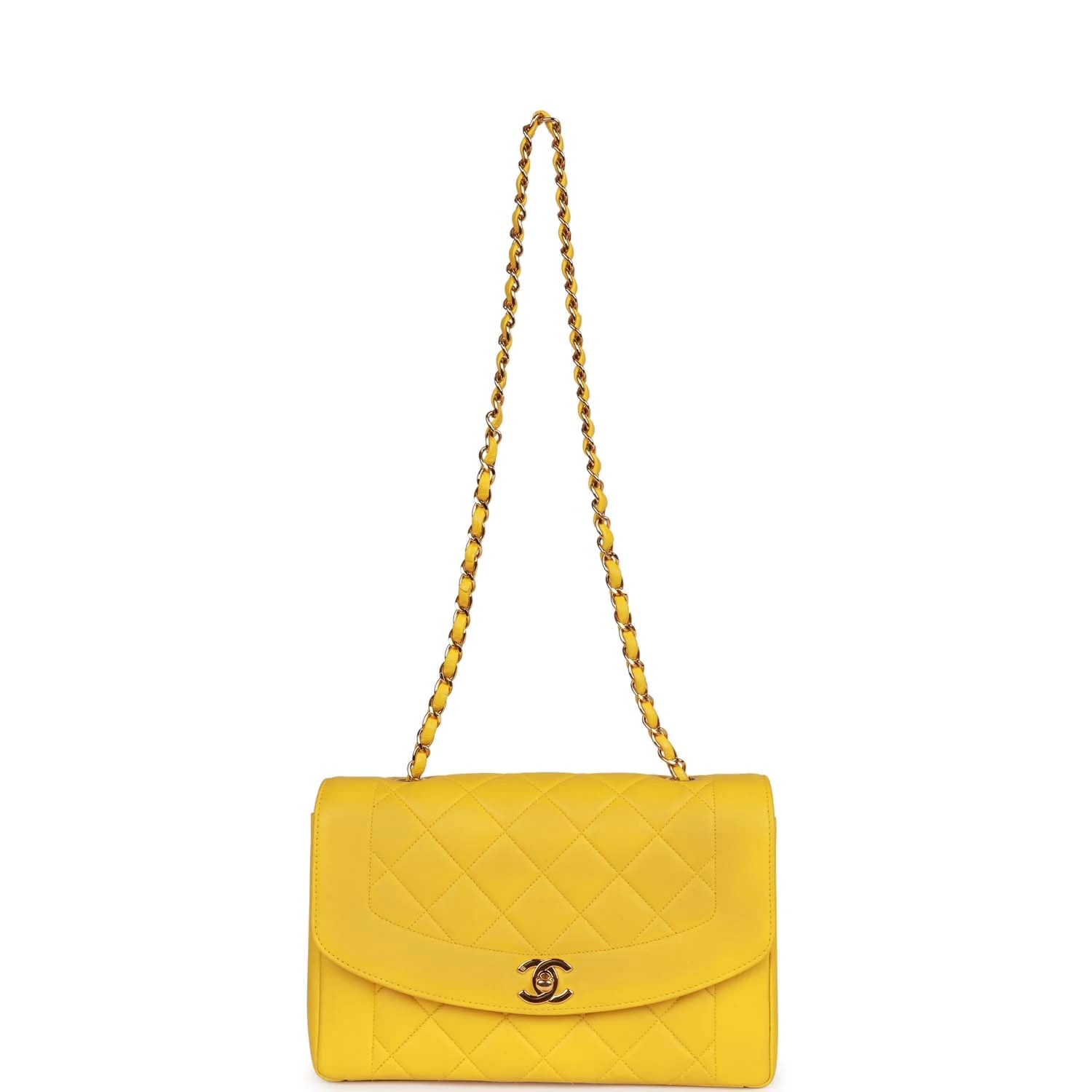 This Vintage Chanel Medium Diana flap bag is in yellow lambskin leather with gold hardware featuring a front flap with classic gold plated CC turnlock closure and an interwoven gold chain link shoulder/crossbody strap.
