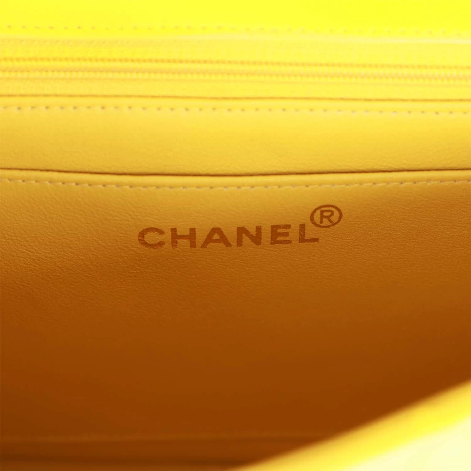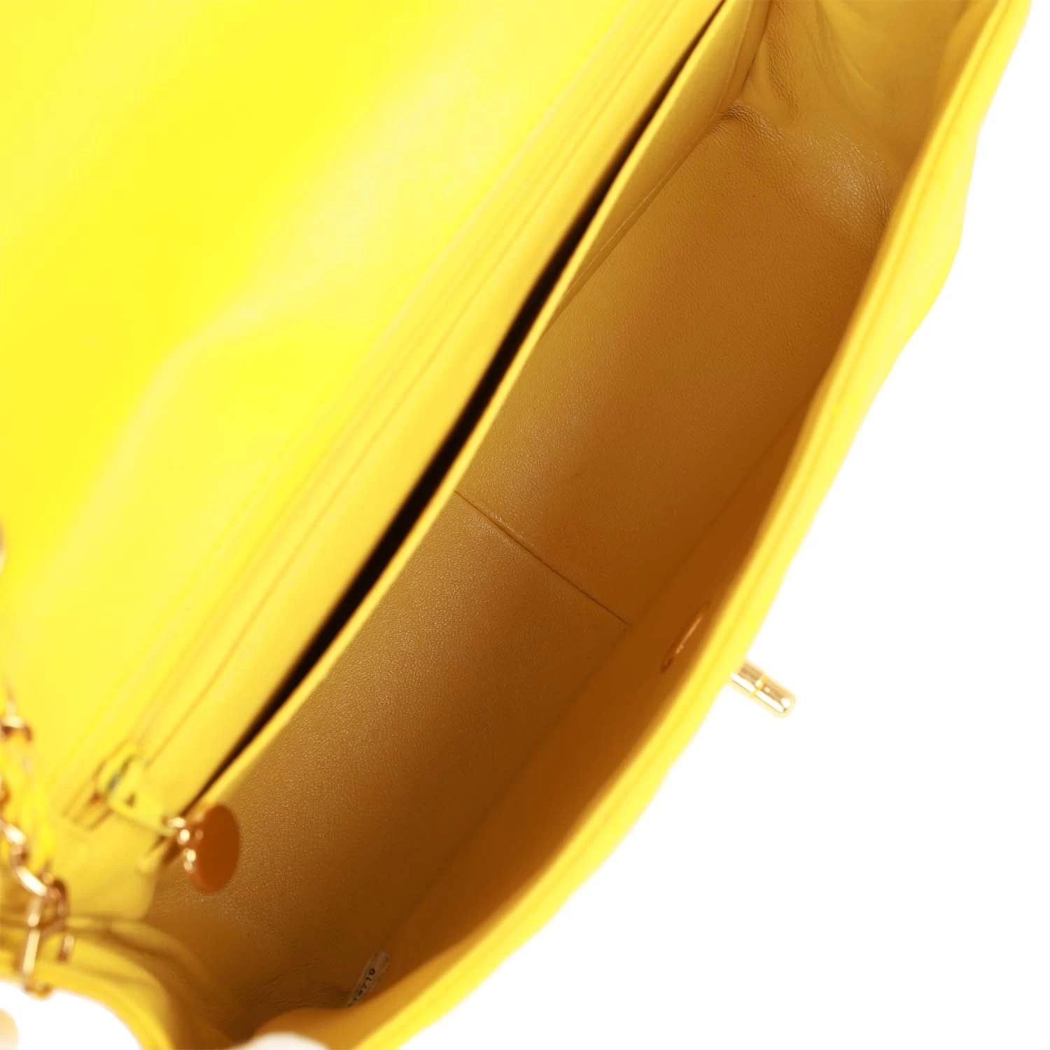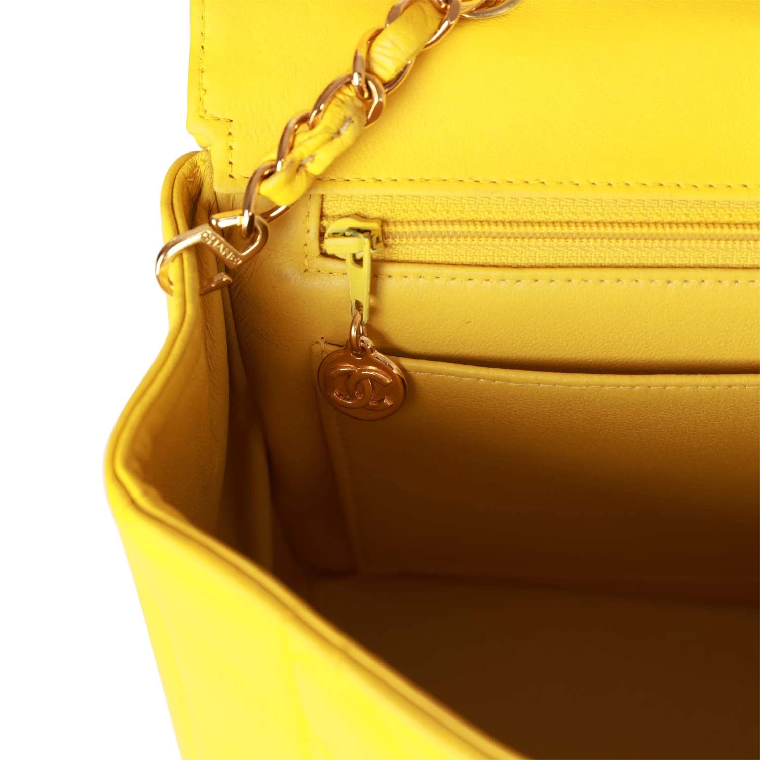 The interior is lined in yellow leather and includes one zip pocket and one slip pocket on the back wall.