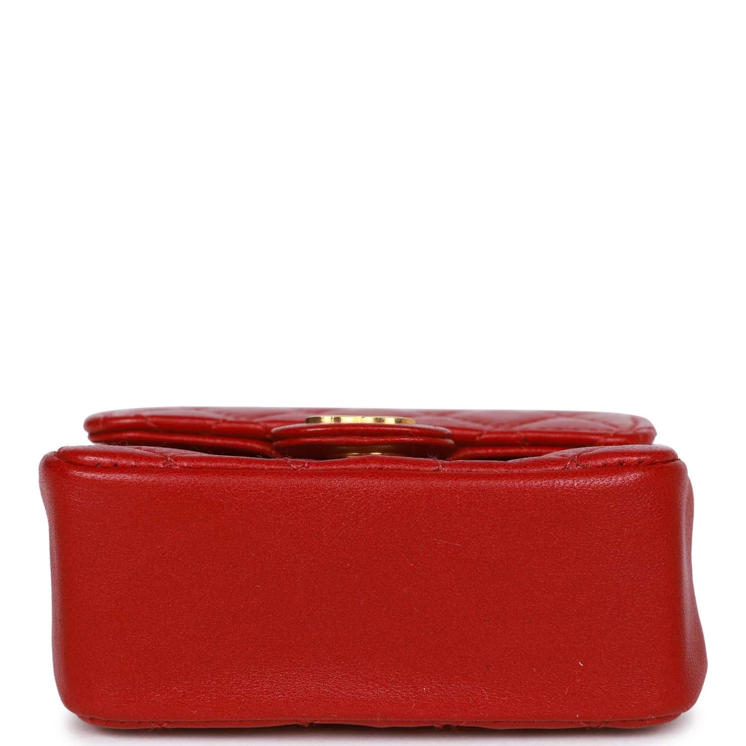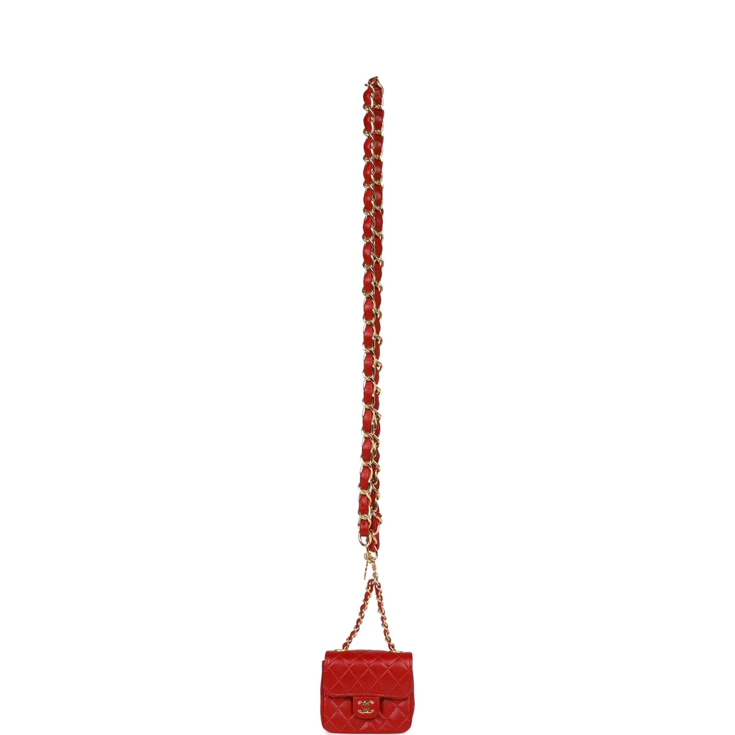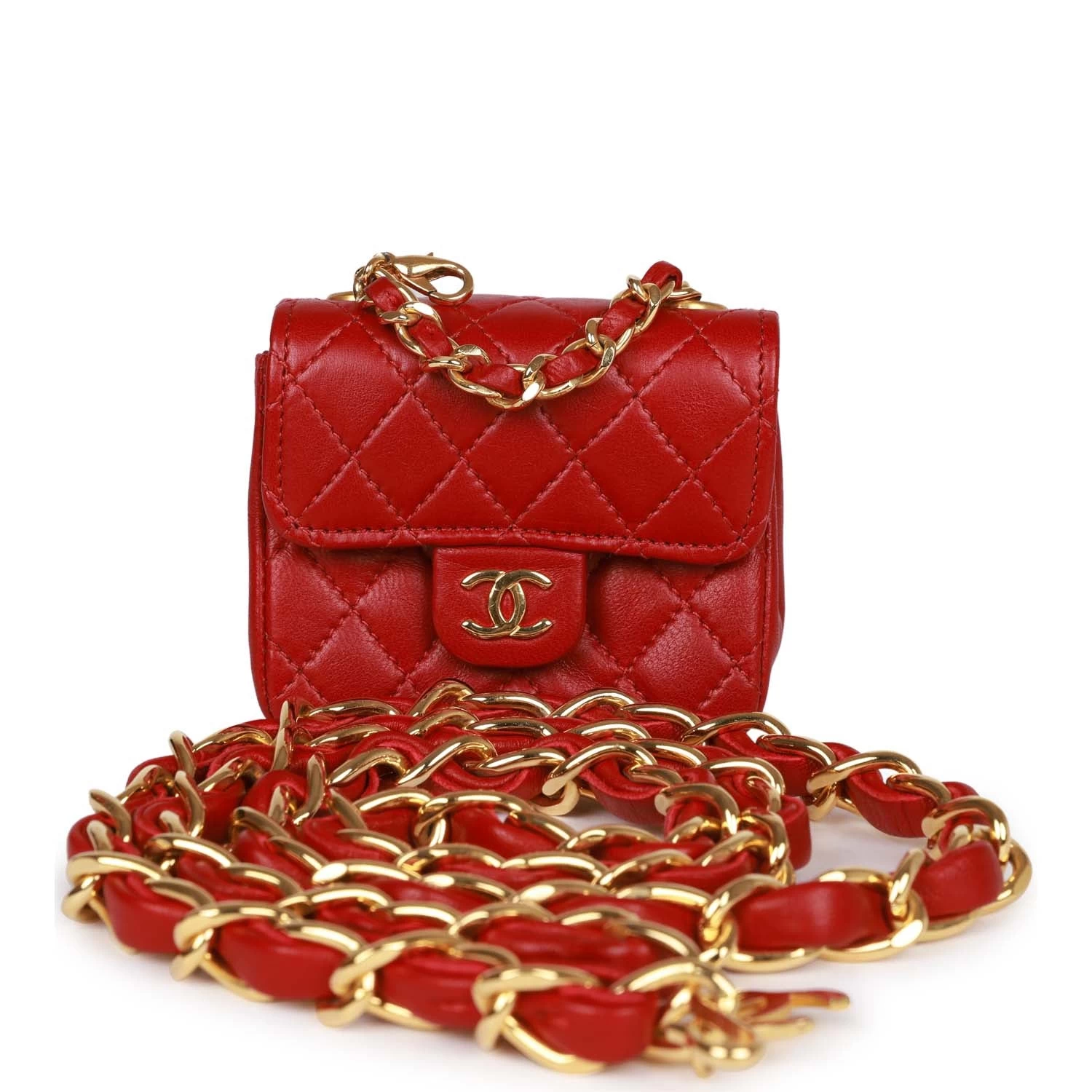 This Vintage Micro Belt Flap Bag is in Red lambskin with gold hardware, signature CC interlocking front snap closure on front flap, a rear half moon pocket, and an interwoven gold plated chain link and red leather handle that can be hooked onto an adjustable interwoven gold plated chain link and red leather waist strap.