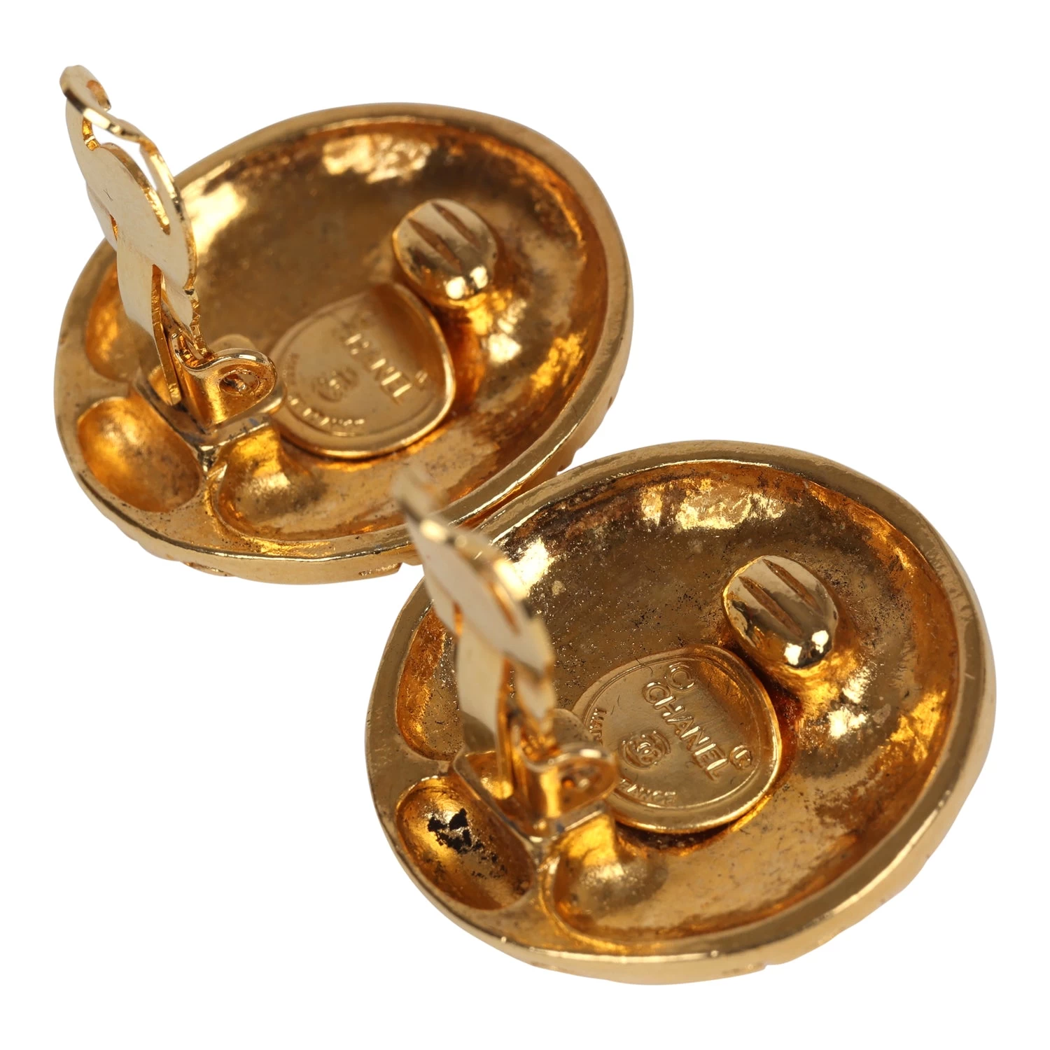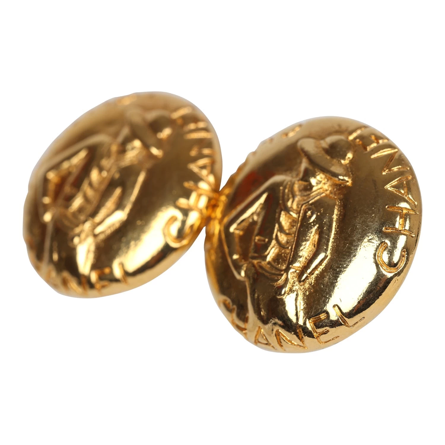 These 90’s vintage Chanel round Coco Mademoiselle earrings are of gold tone metal, featuring CHANEL engraved around the edges and a Coco silhouette embossed in the center of the earrings with clip on back closures.