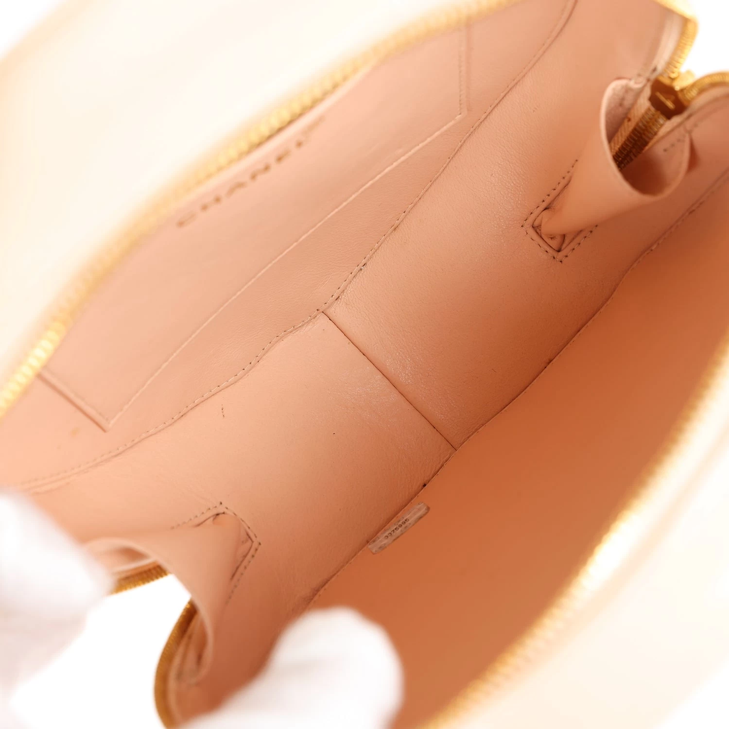 This Vintage Round Vanity Case is in Beige and Black quilted patent leather with antique gold hardware, stitched CC Logo on front, double zipper closure, and interwoven patent leather and antique gold top handle.