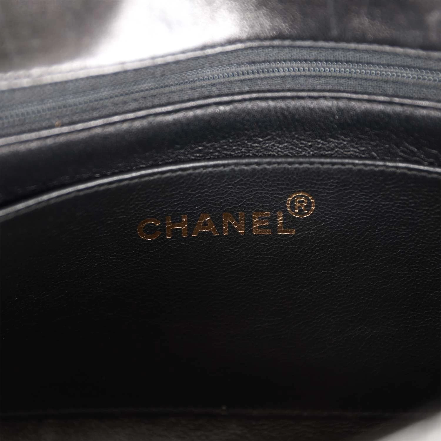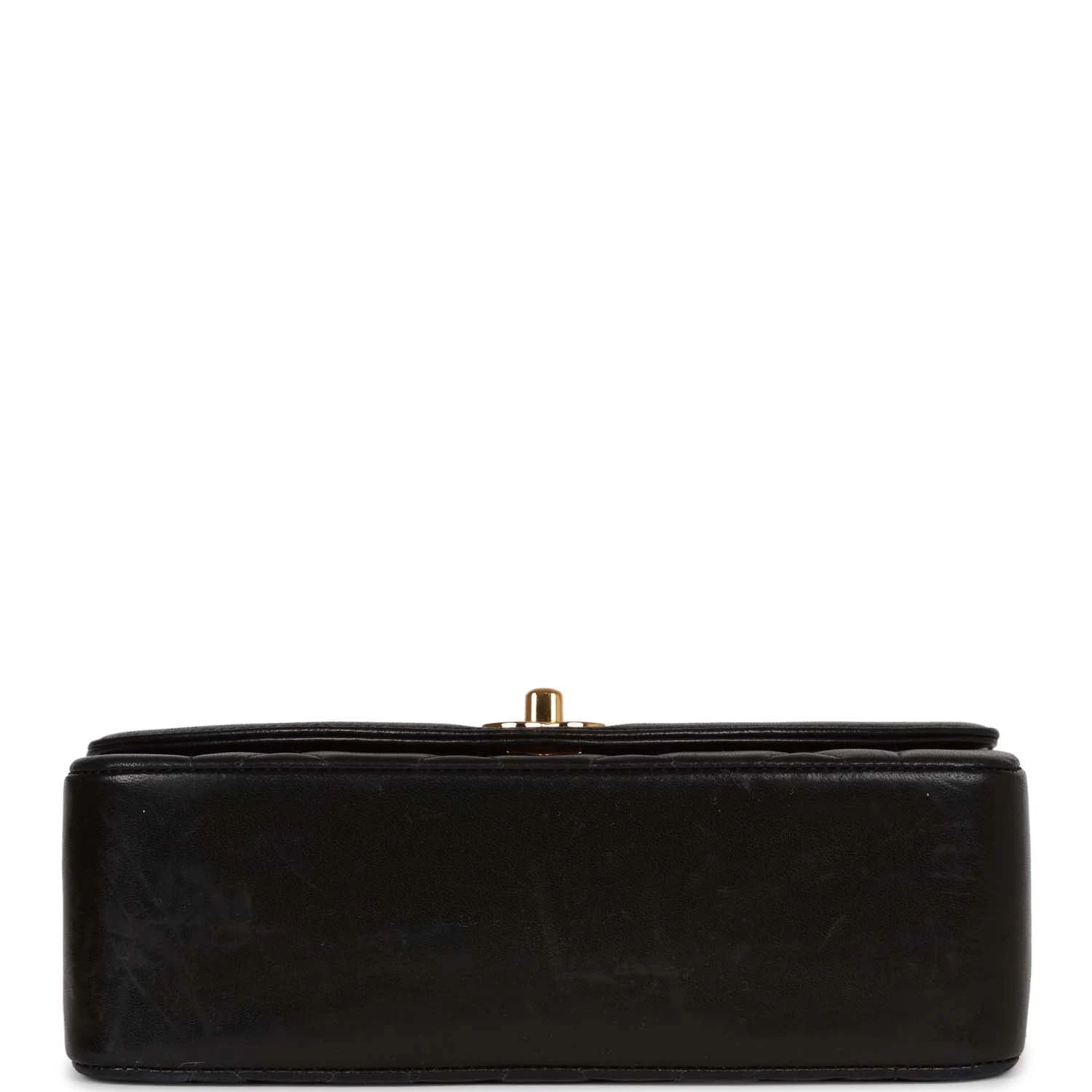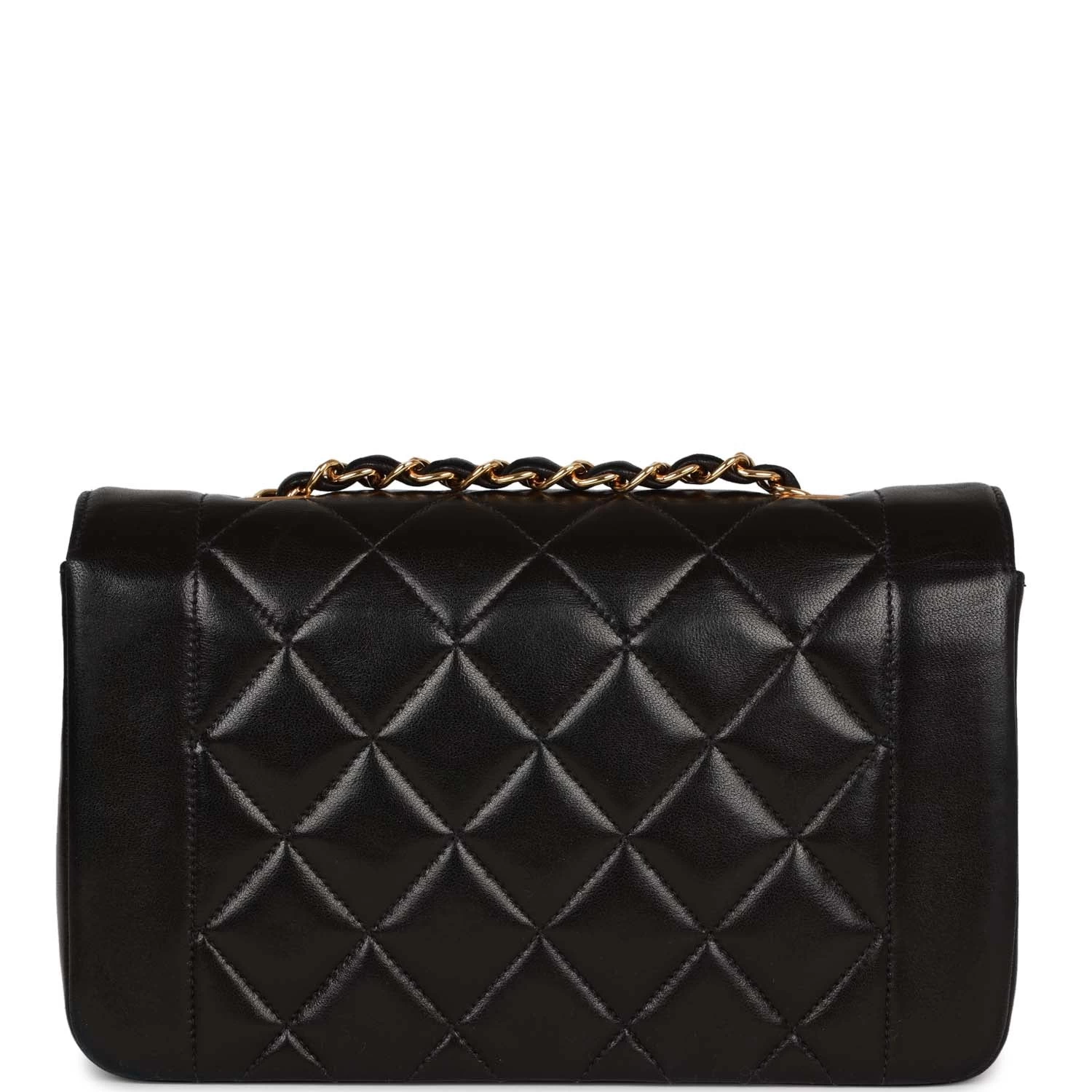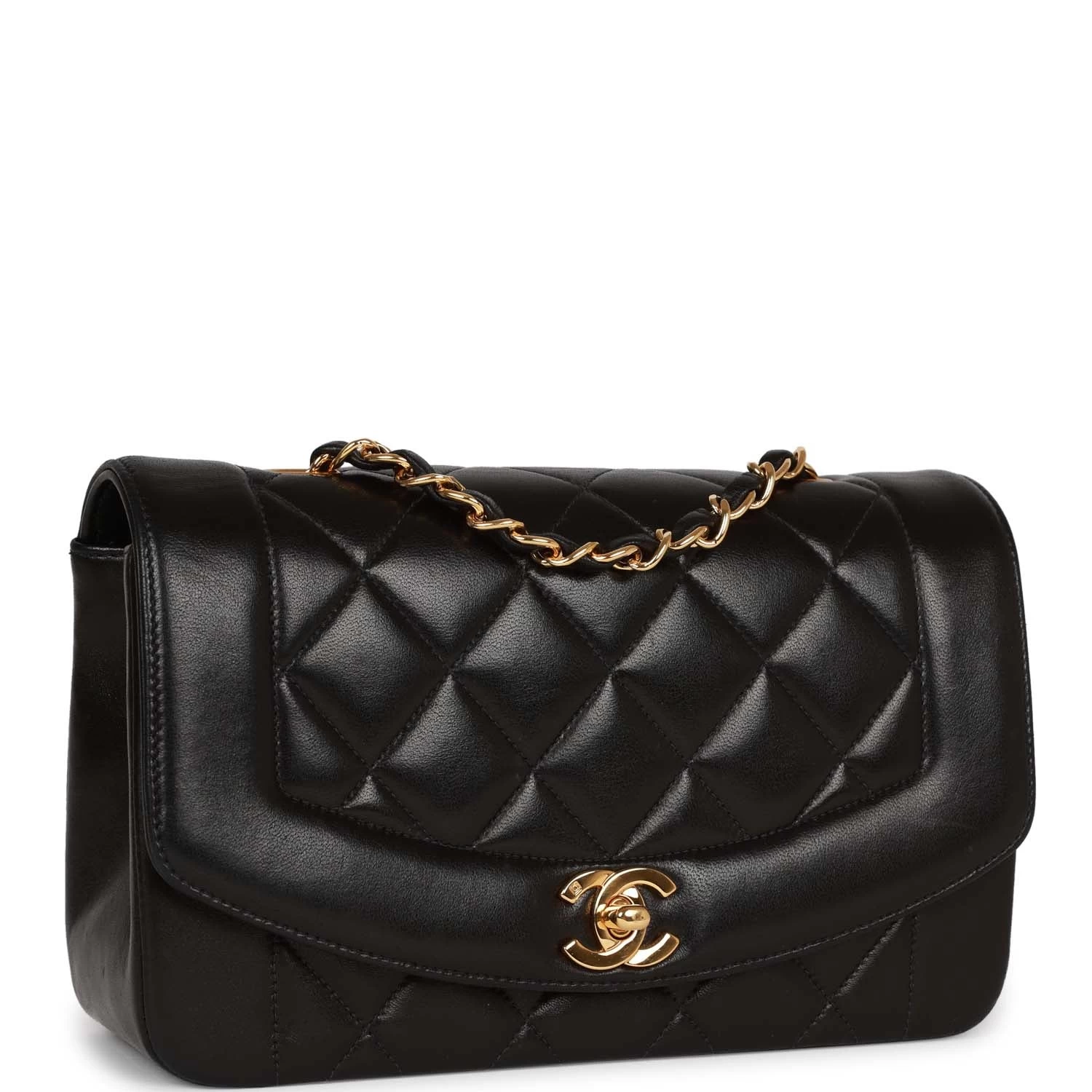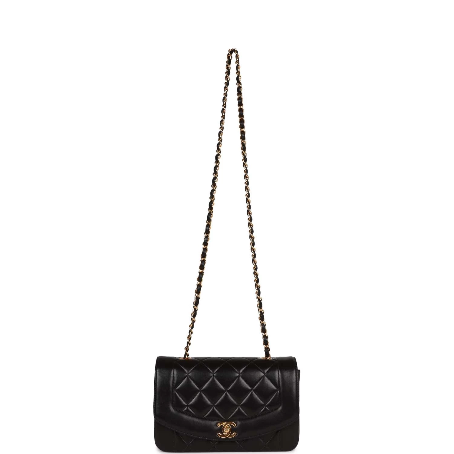 This Vintage Diana flap bag in Black lambskin leather with gold hardware, featuring a front flap with CC turnlock closure and adjustable interwoven gold plated chain link and Black leather shoulder/crossbody strap.