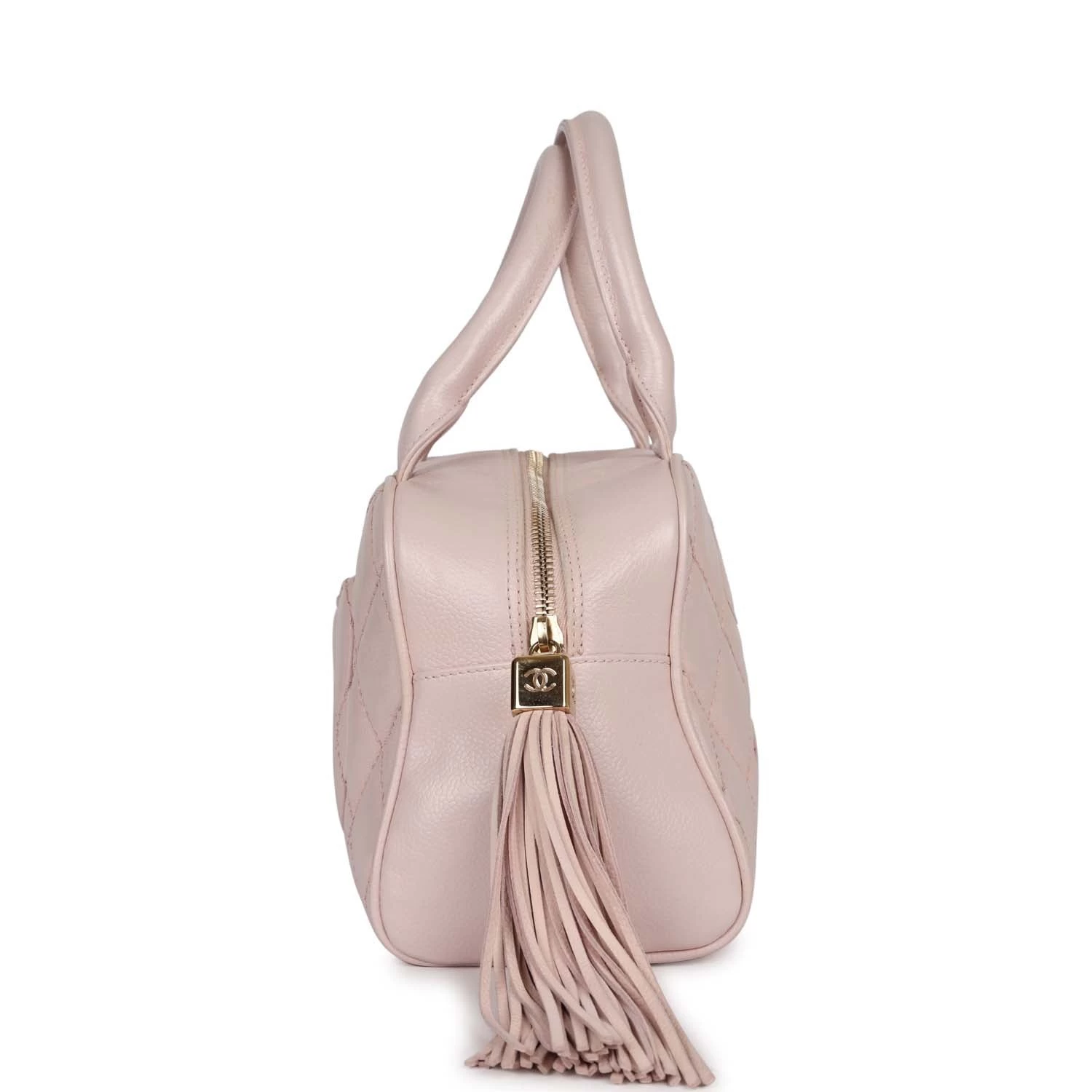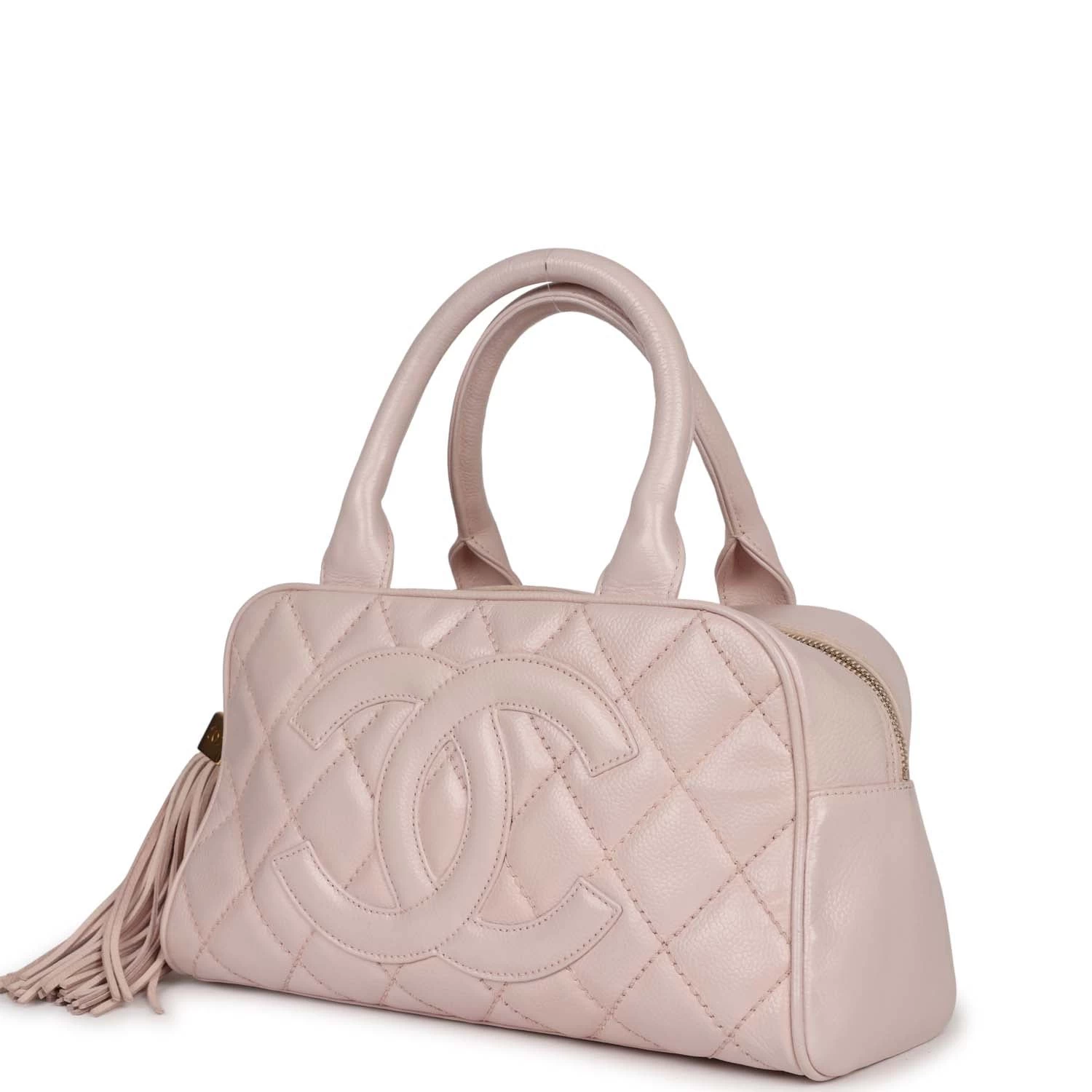 This Timeless Bowler bag is in light pink caviar with gold hardware, has tonal stitching, large CC applique on front, tassel zip closure, and half moon exterior pocket.