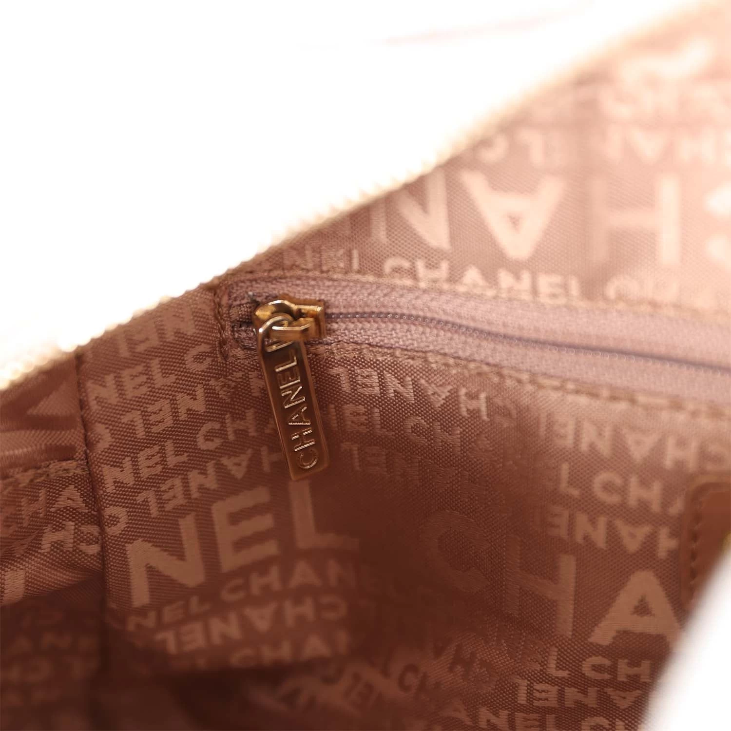 The interior is lined in pink chanel logo nylon and includes one zip pocket with logo pull on the rear wall.