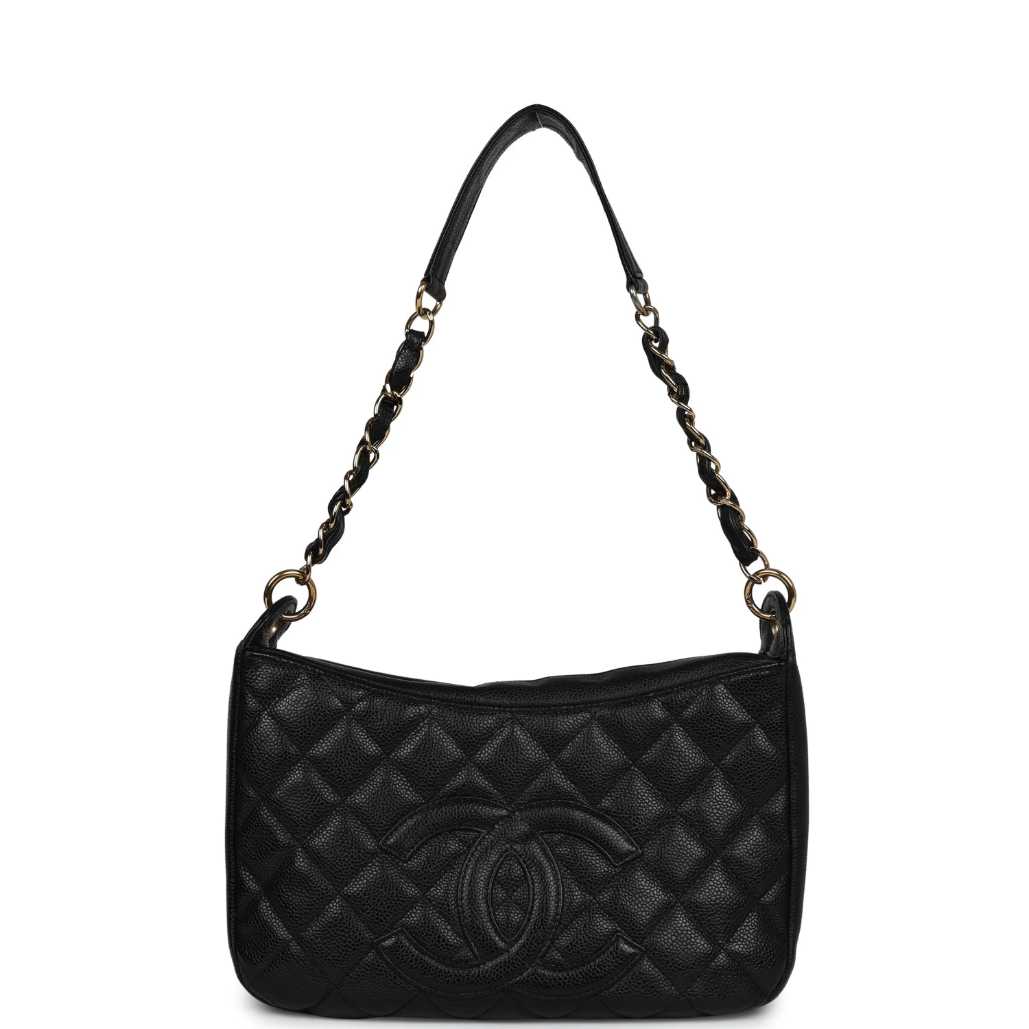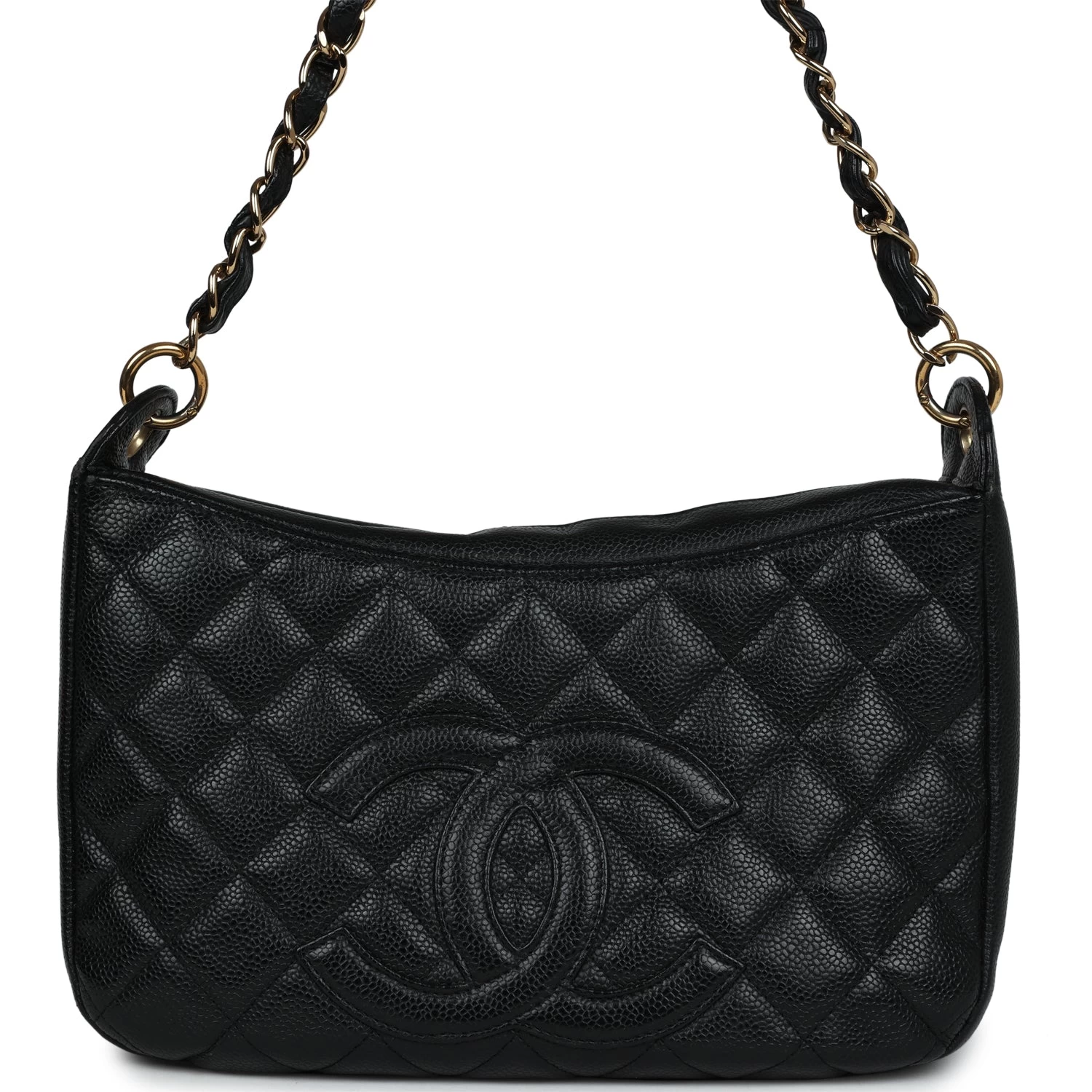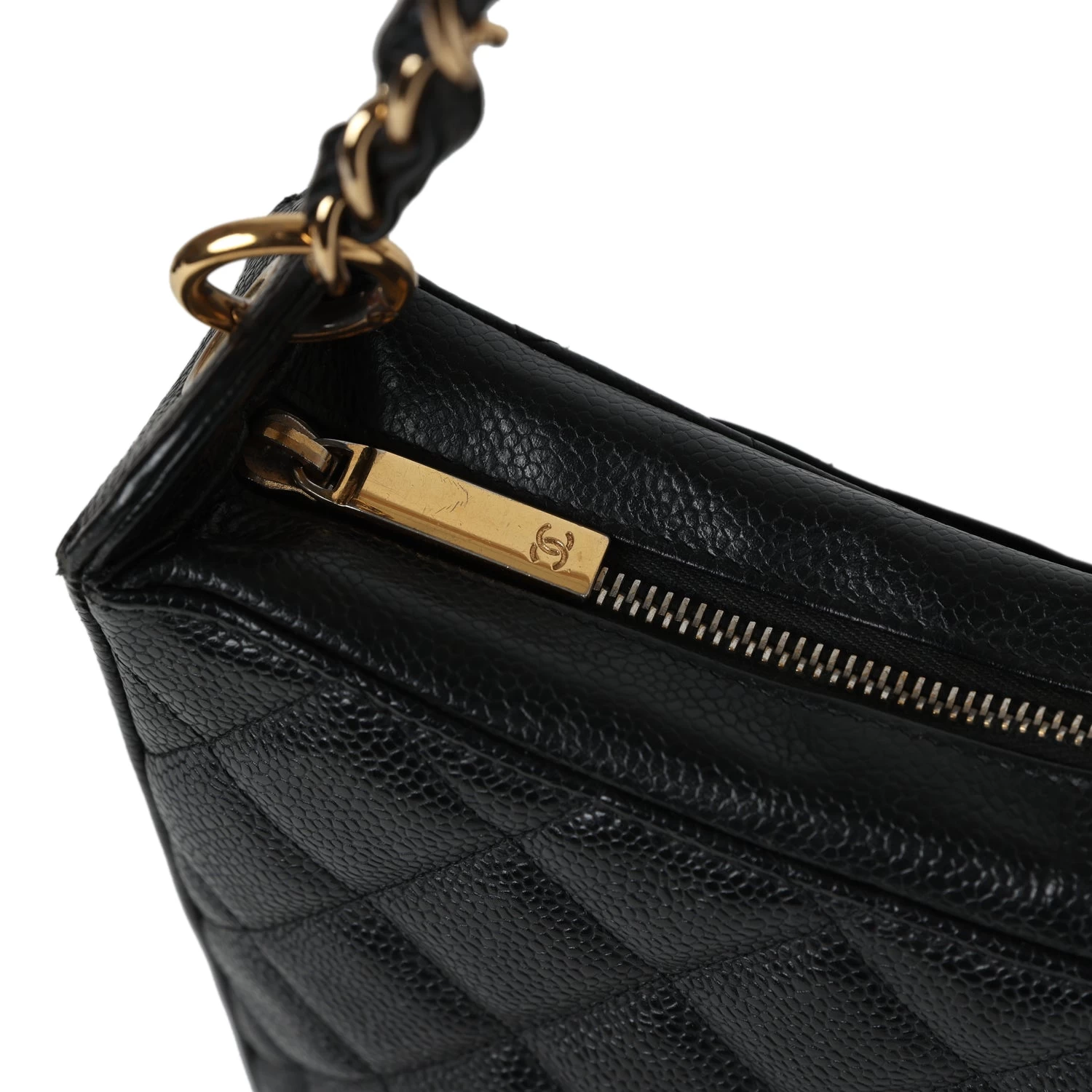 This Vintage Timeless CC Shoulder Bag is in Black caviar leather with gold hardware, signature CC logo on the front, top zip closure with a CC zipper pull, half moon back pocket and an interwoven gold plated chain link and black leather shoulder strap.