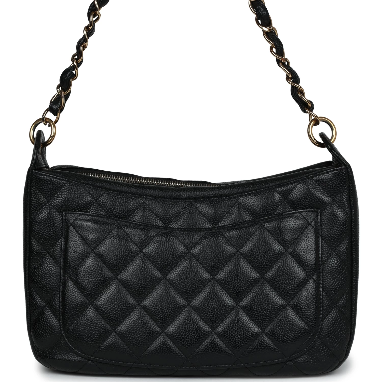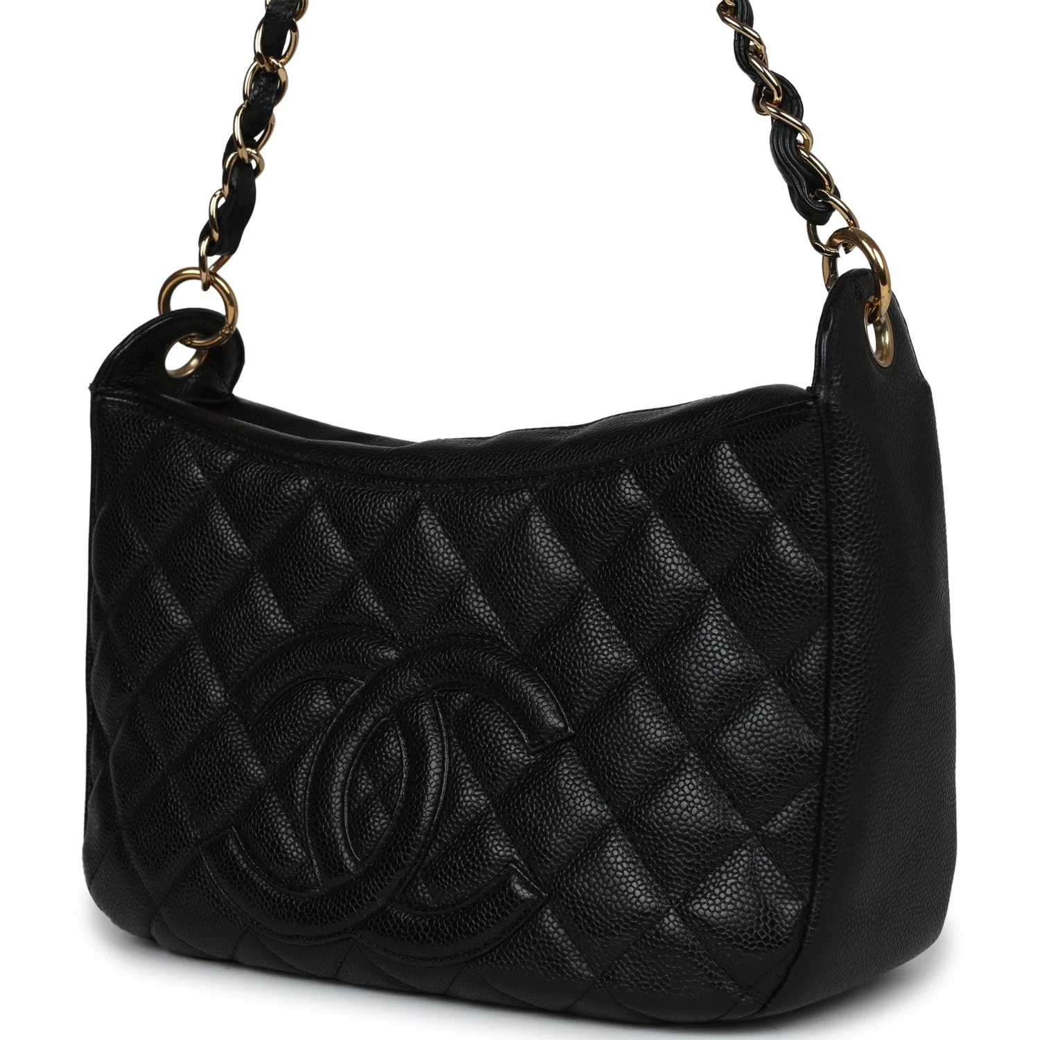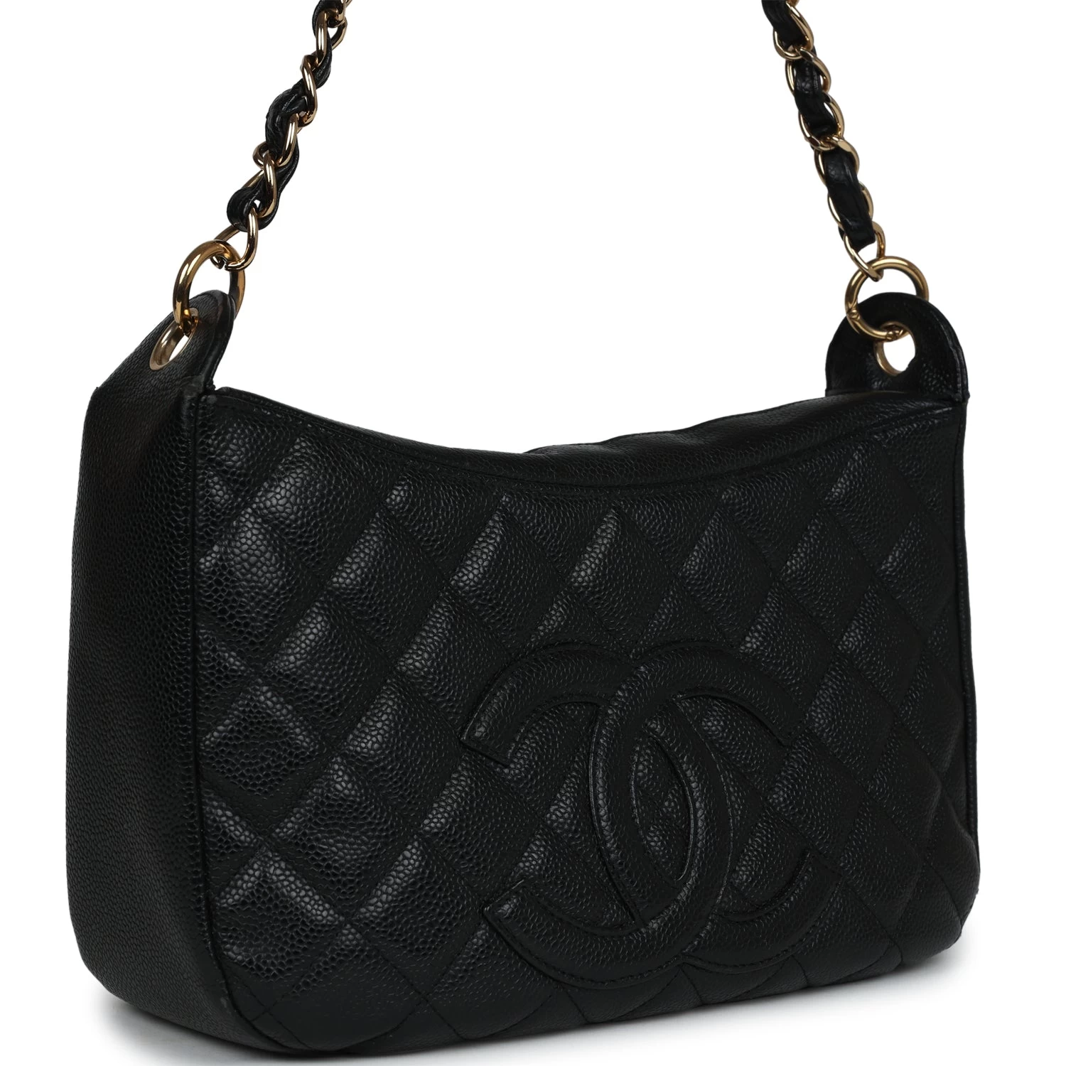 This Vintage Timeless CC Shoulder Bag is in Black caviar leather with gold hardware, signature CC logo on the front, top zip closure with a CC zipper pull, half moon back pocket and an interwoven gold plated chain link and black leather shoulder strap.
