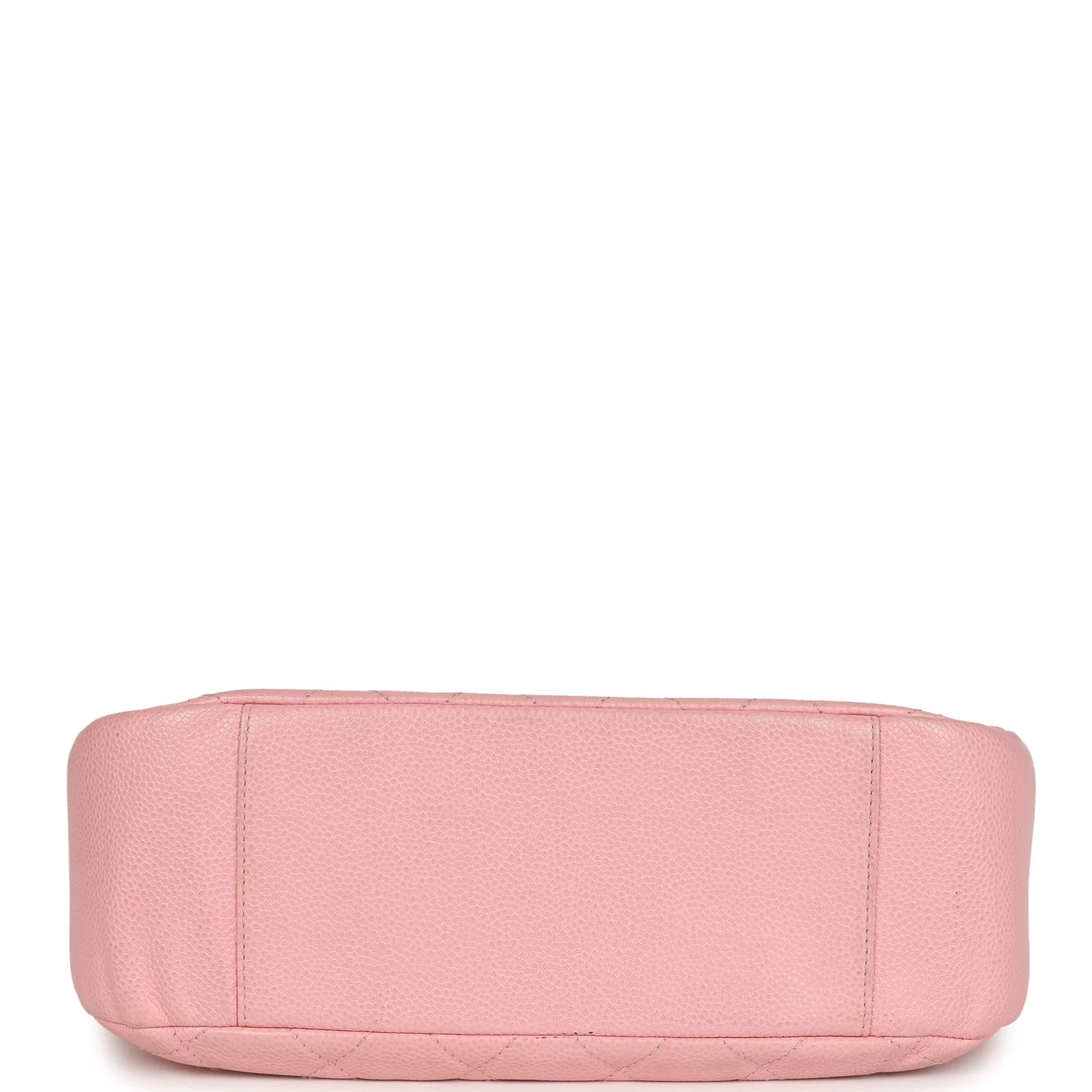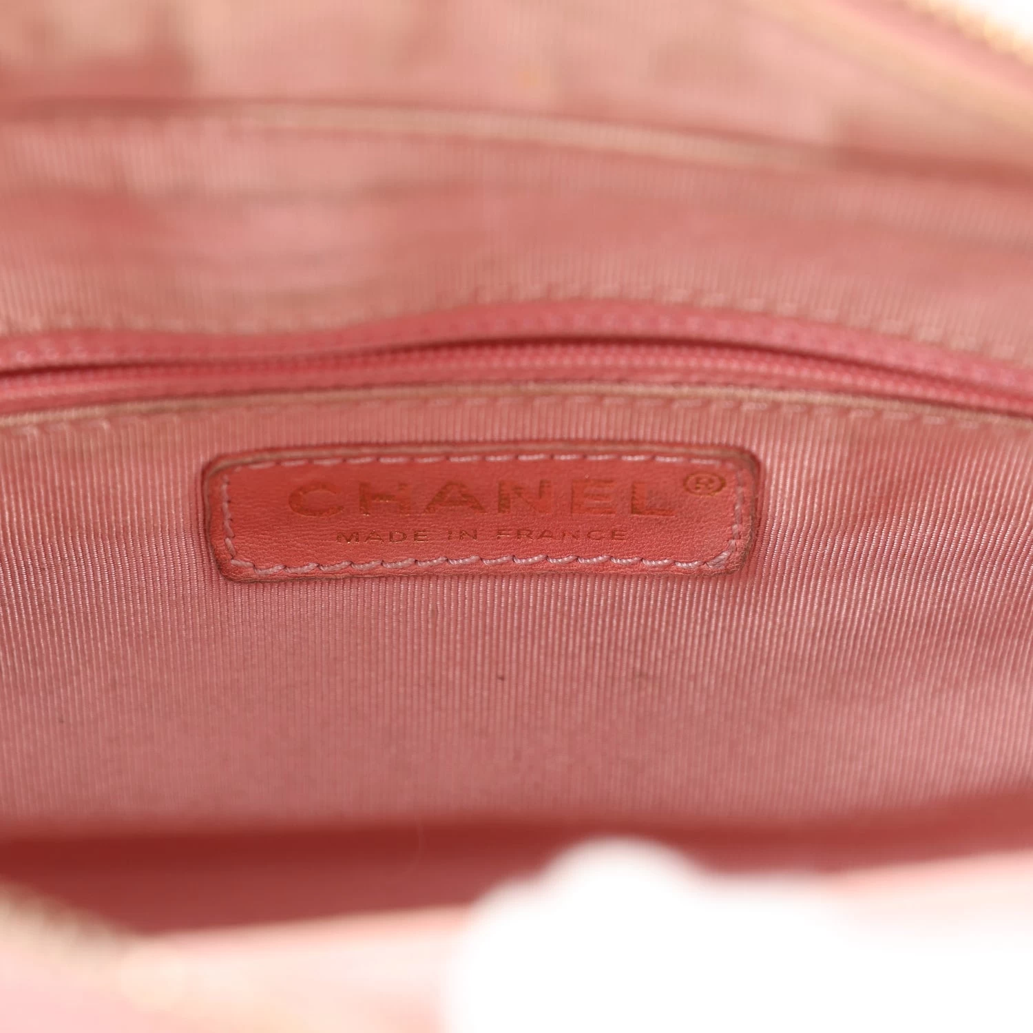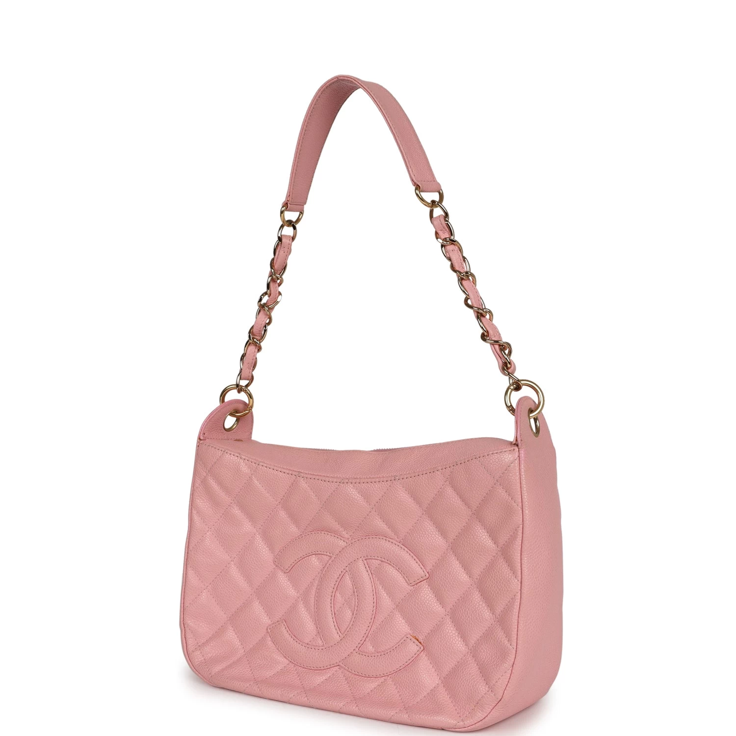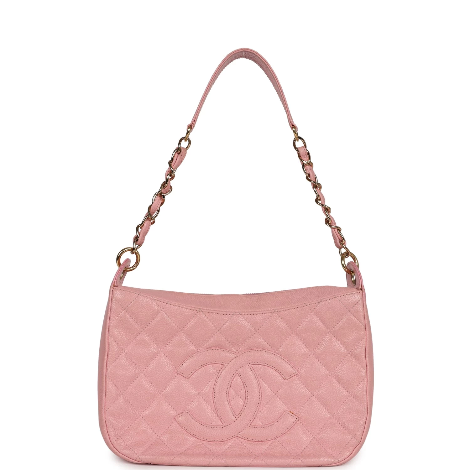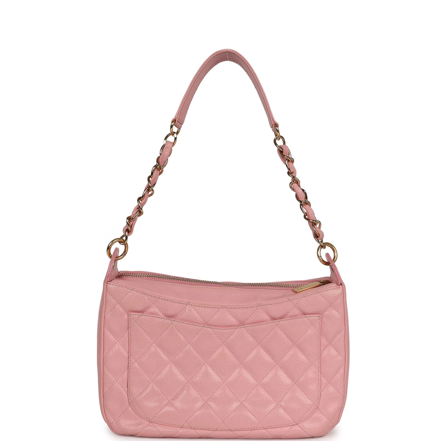 This Timeless Hobo Bag is in Pink Caviar with Gold hardware, tonal stitching, classic CC logo on front of bag, half moon back pocket on back of bag, strap is comprised of chainlink interwoven with leather and a leather shoulder pad.