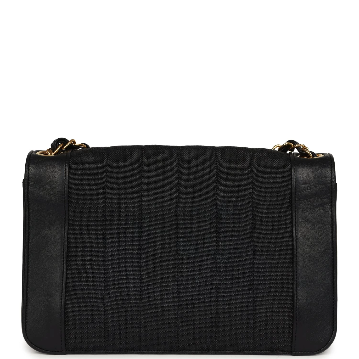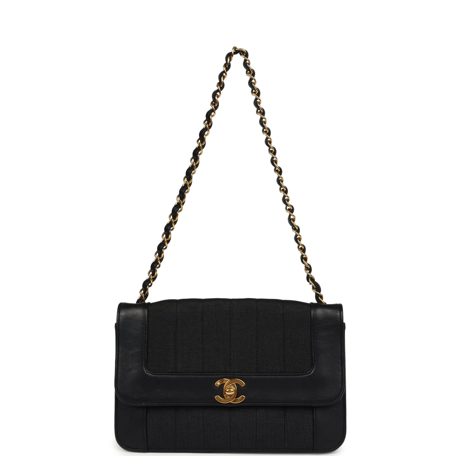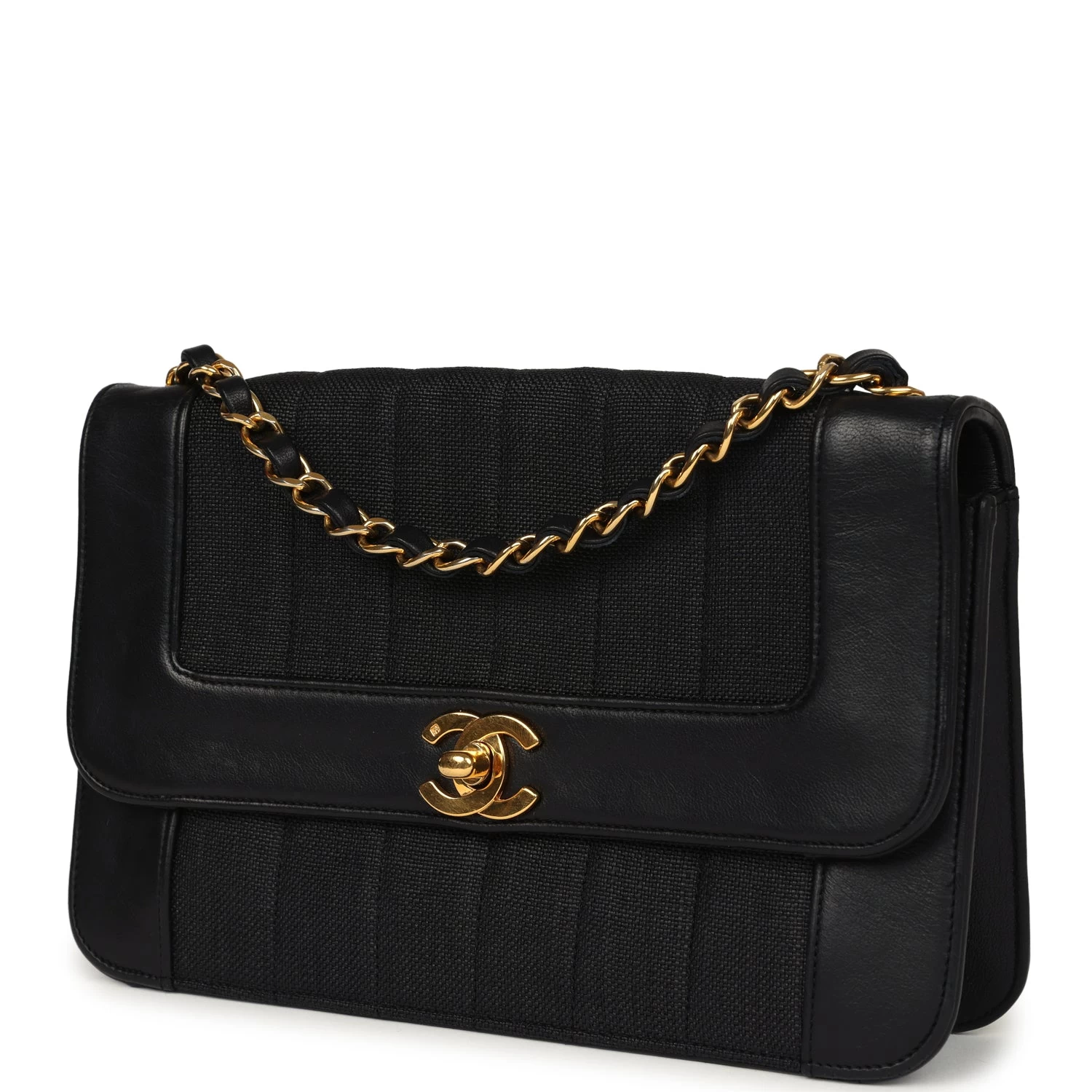 This Vintage Vertical Border Flap Bag is in black linen with bordering black lambskin leather, gold hardware, a front flap with snap closure, and an interwoven black leather and gold chain link shoulder/crossbody strap.