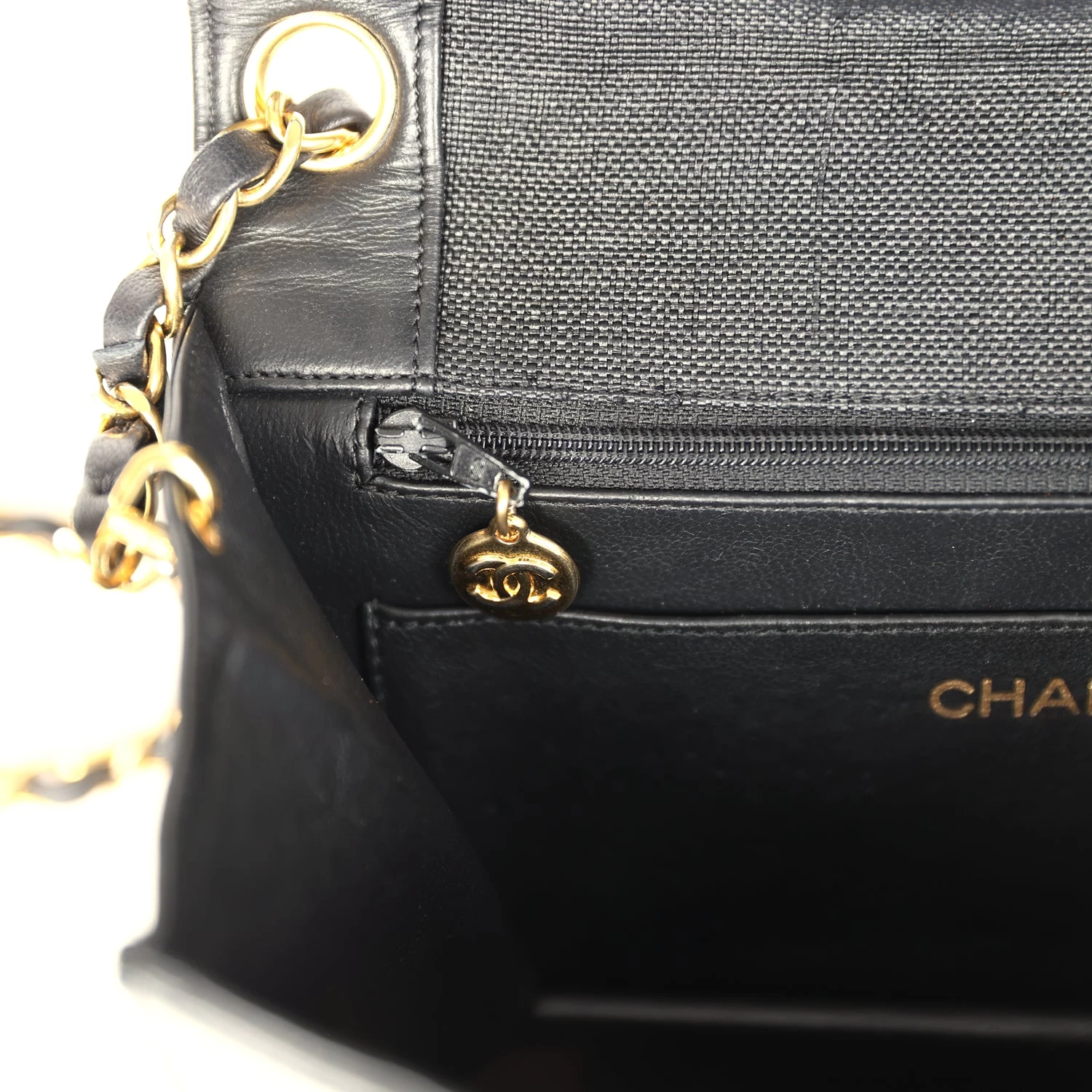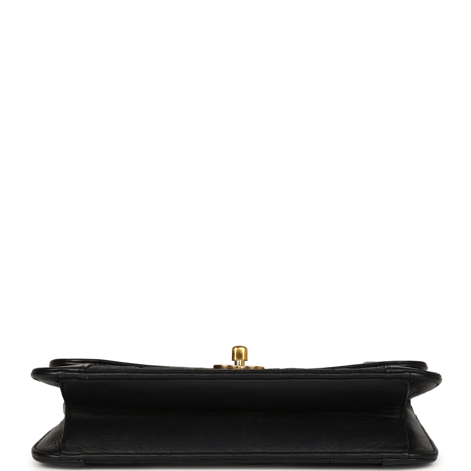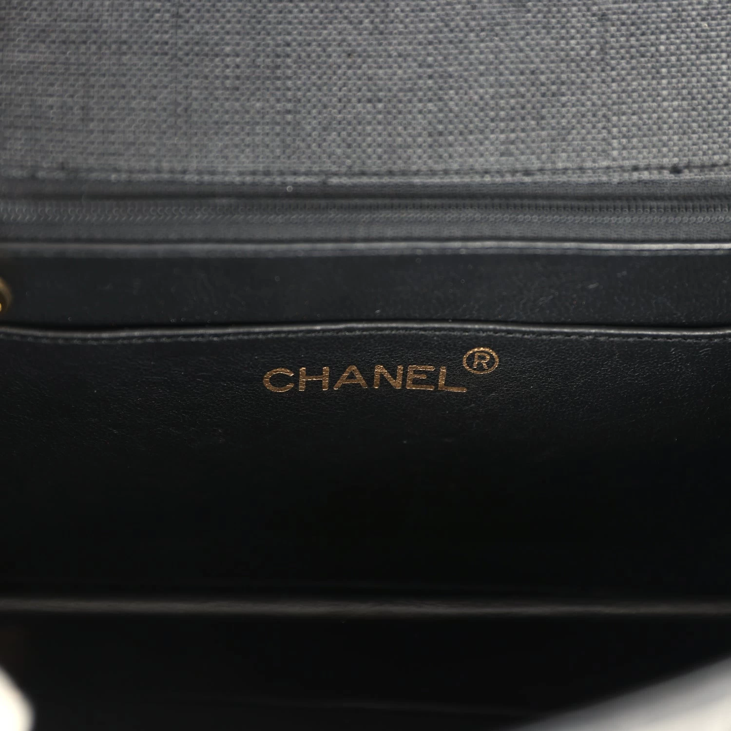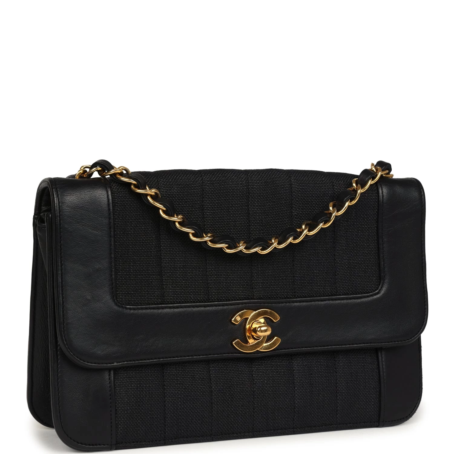 This Vintage Vertical Border Flap Bag is in black linen with bordering black lambskin leather, gold hardware, a front flap with snap closure, and an interwoven black leather and gold chain link shoulder/crossbody strap.